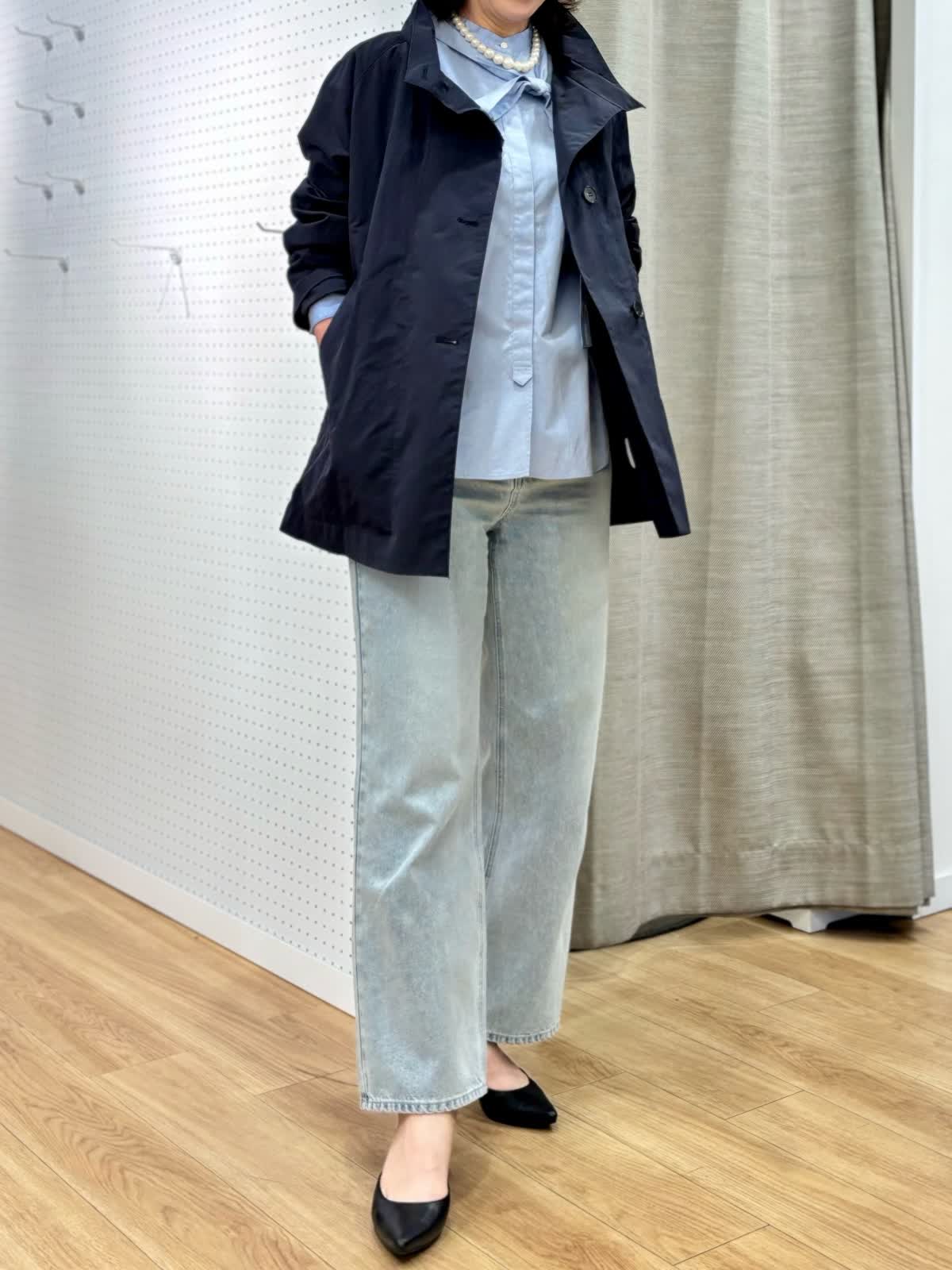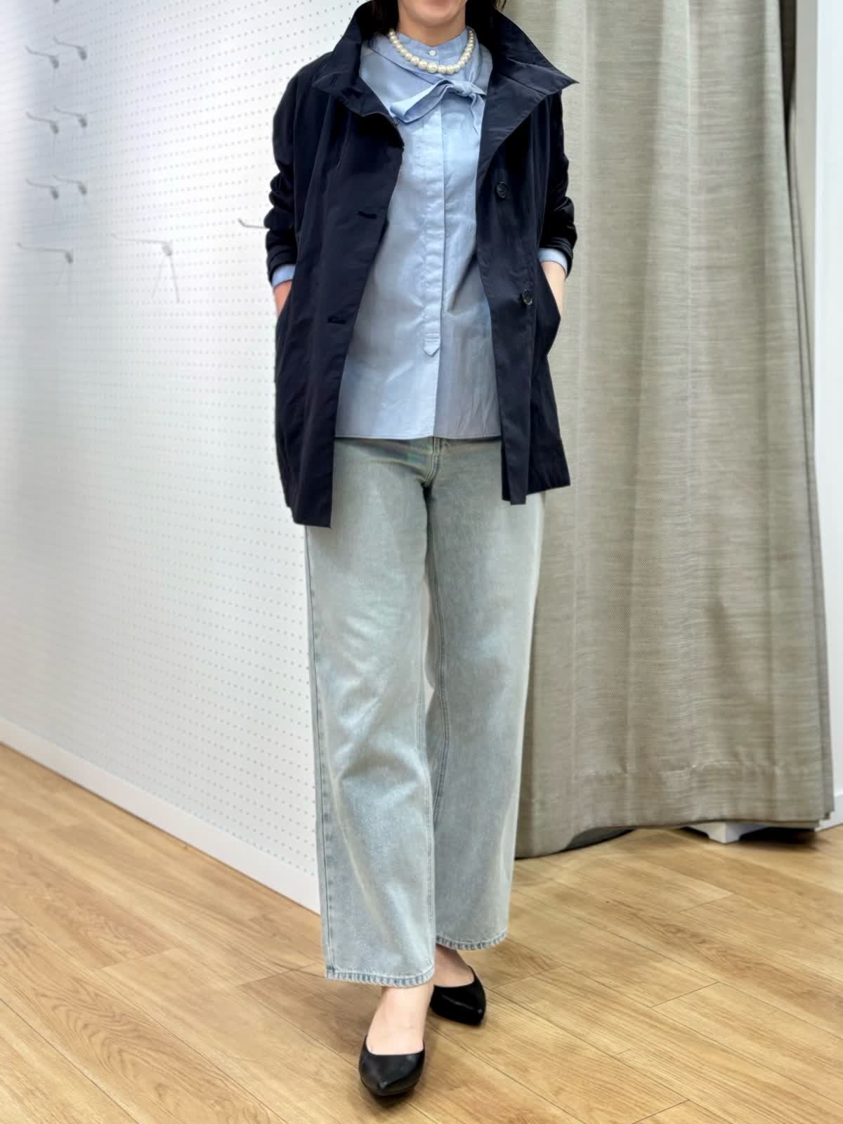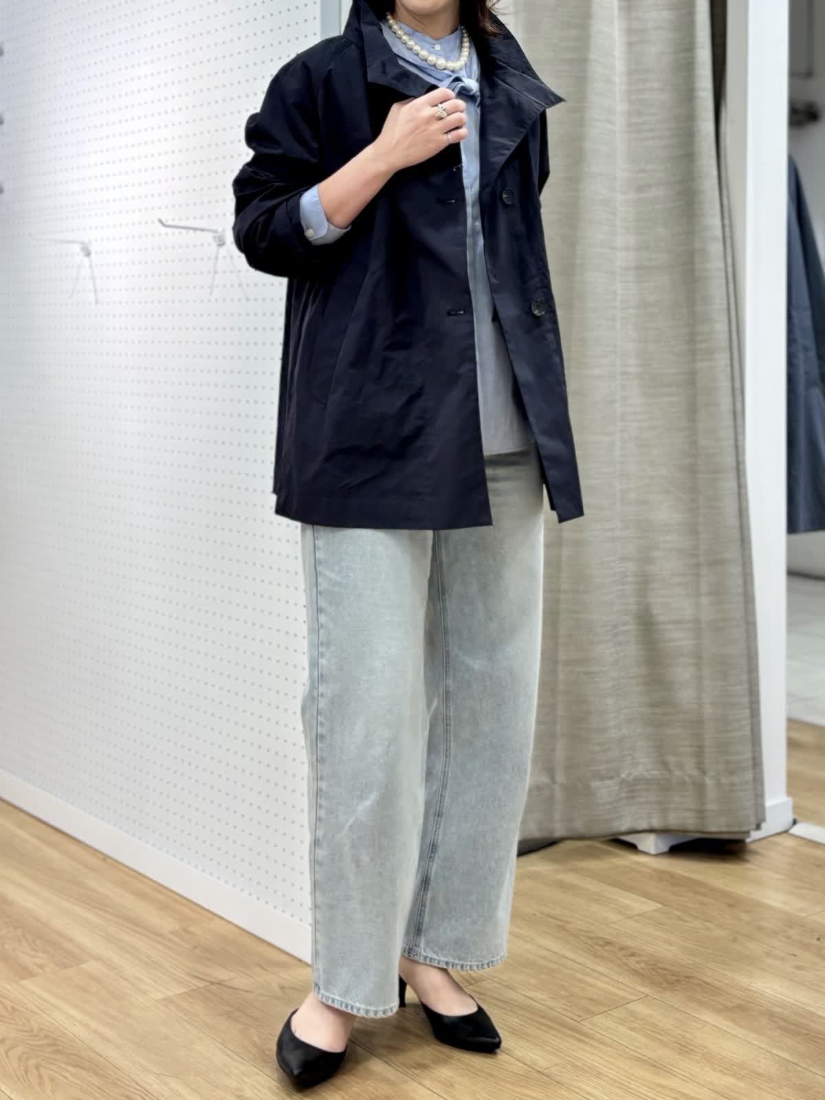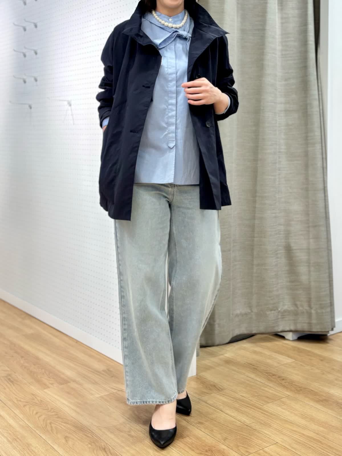 【着用カラー/サイズ】 コート:ネイビー/フリー ブラウス:ブルー/フリー パンツ:ブルー/11号 春のランチコーデ。日中の気温が高めになると軽い羽織りが便利です。裏地無しだから合わせるインナーを変えれば長く使えます。トレンドのタイ付きプラウスは紐も取り外し可能でスタイリングを楽しめます。