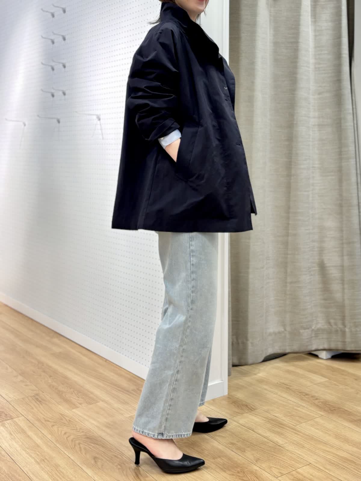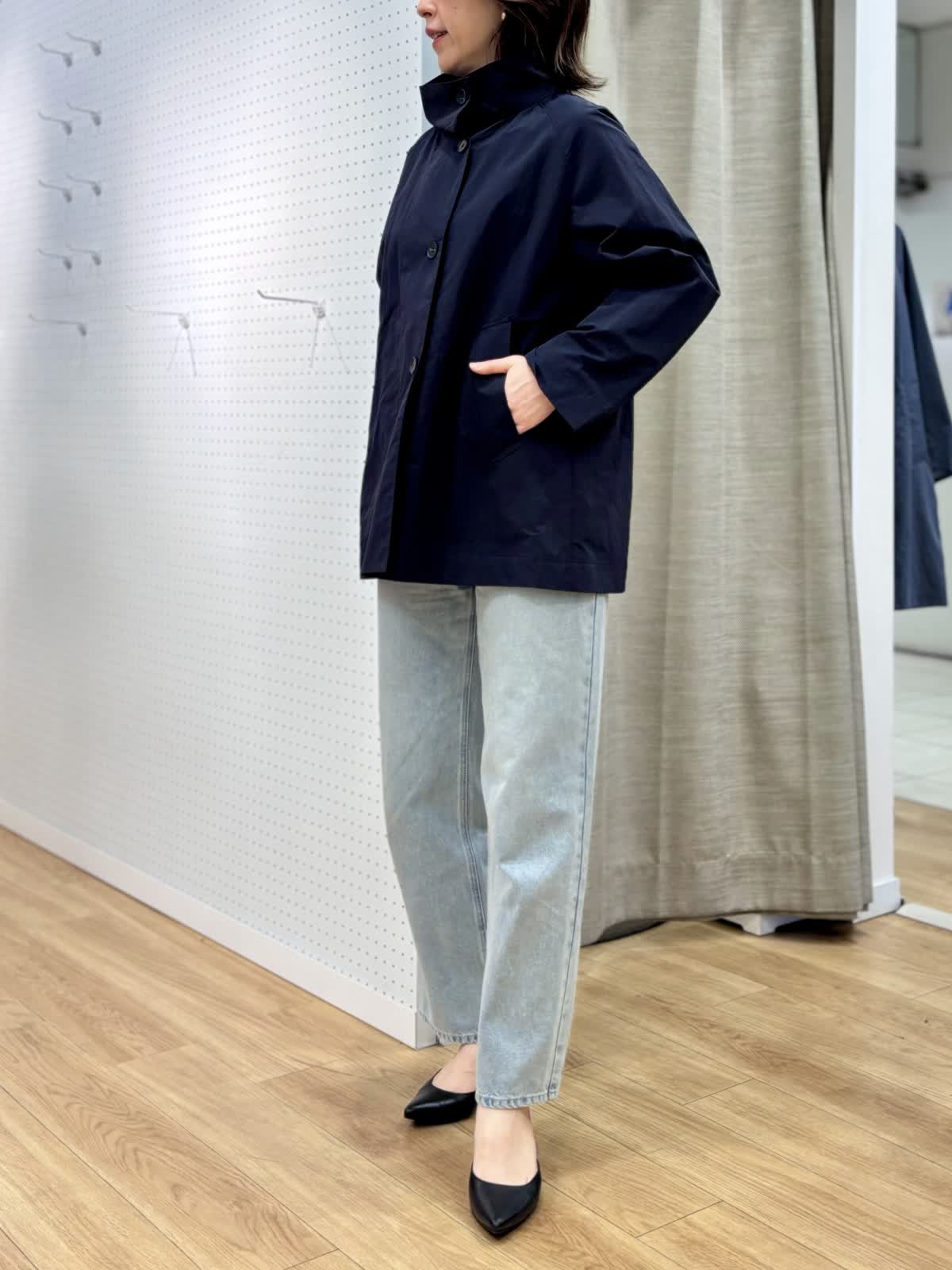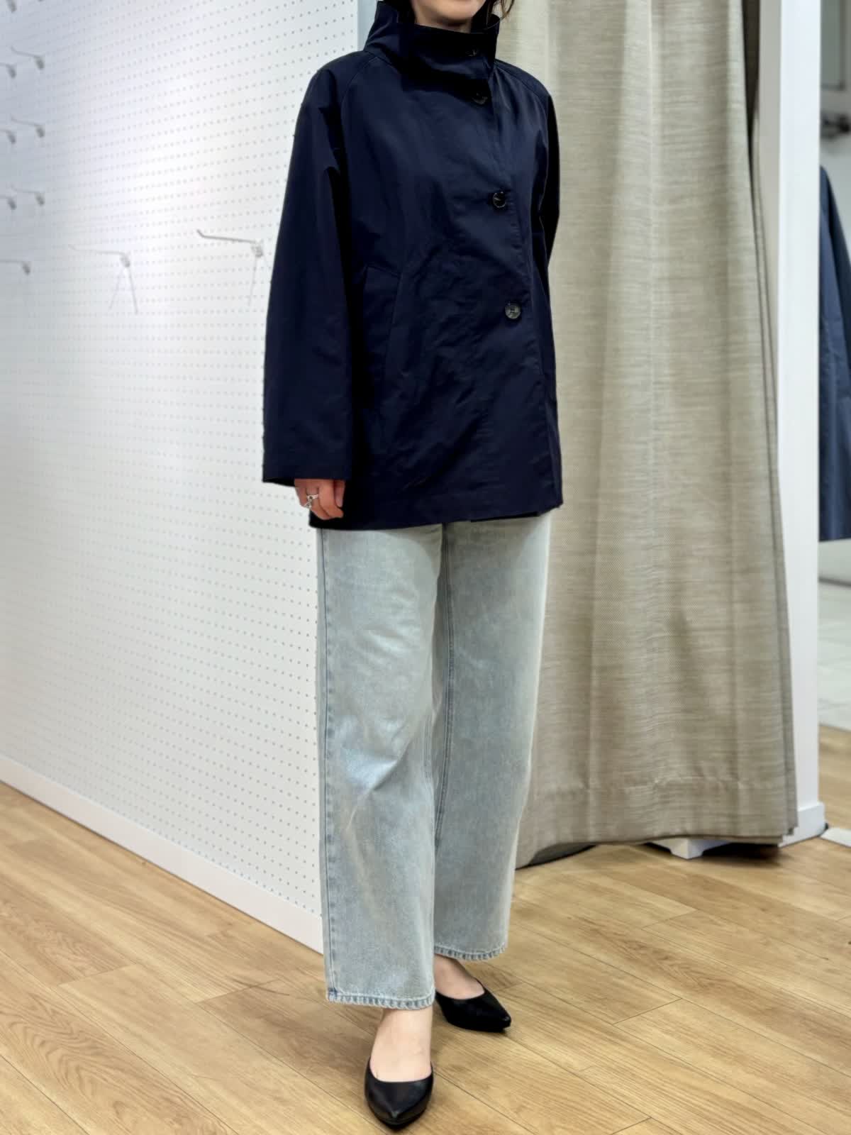 【着用カラー/サイズ】 コート:ネイビー/フリー ブラウス:ブルー/フリー パンツ:ブルー/11号 春のランチコーデ。日中の気温が高めになると軽い羽織りが便利です。裏地無しだから合わせるインナーを変えれば長く使えます。トレンドのタイ付きプラウスは紐も取り外し可能でスタイリングを楽しめます。