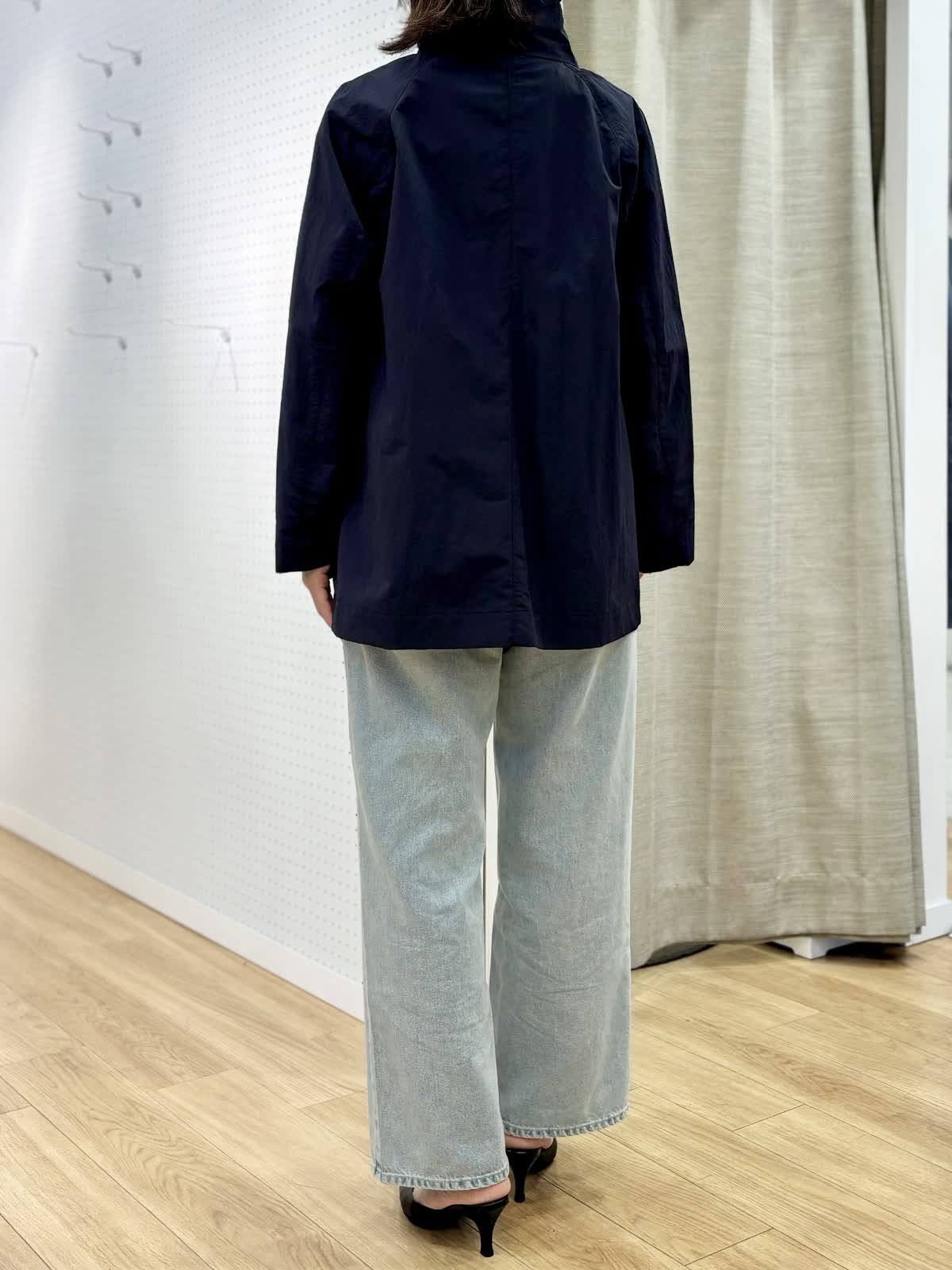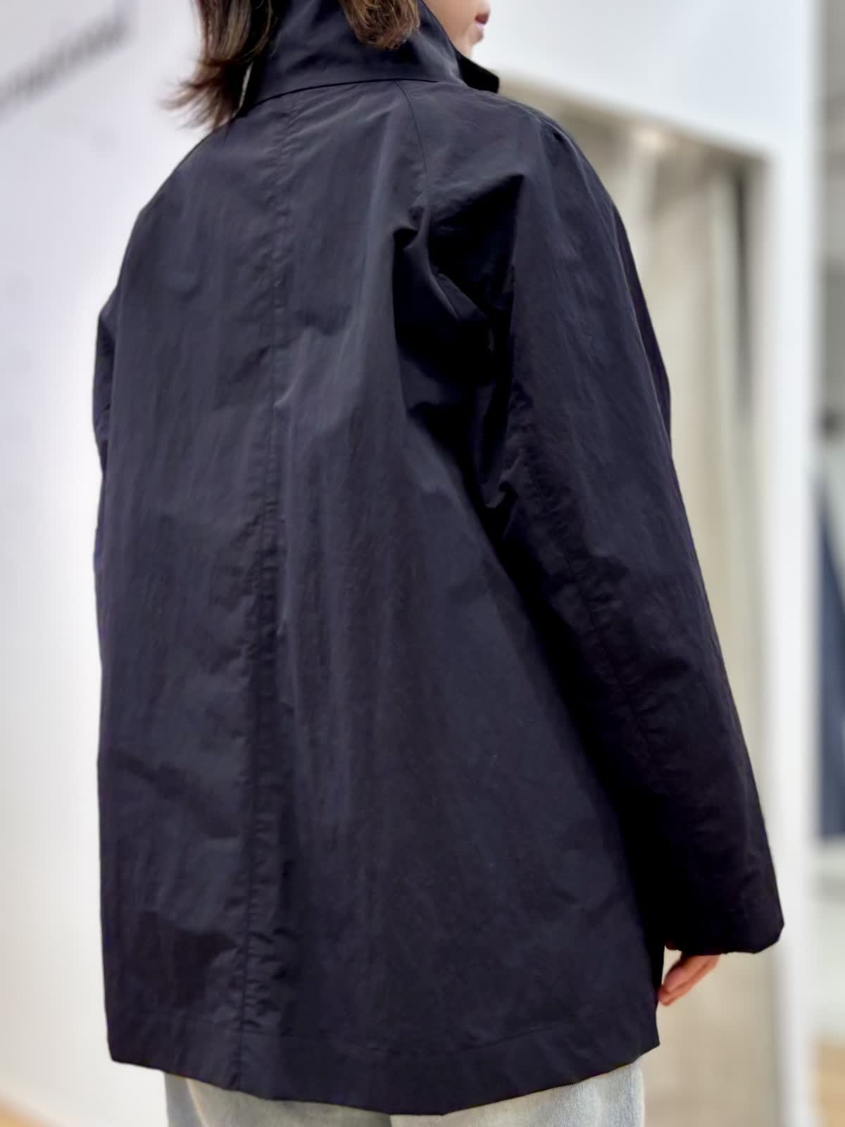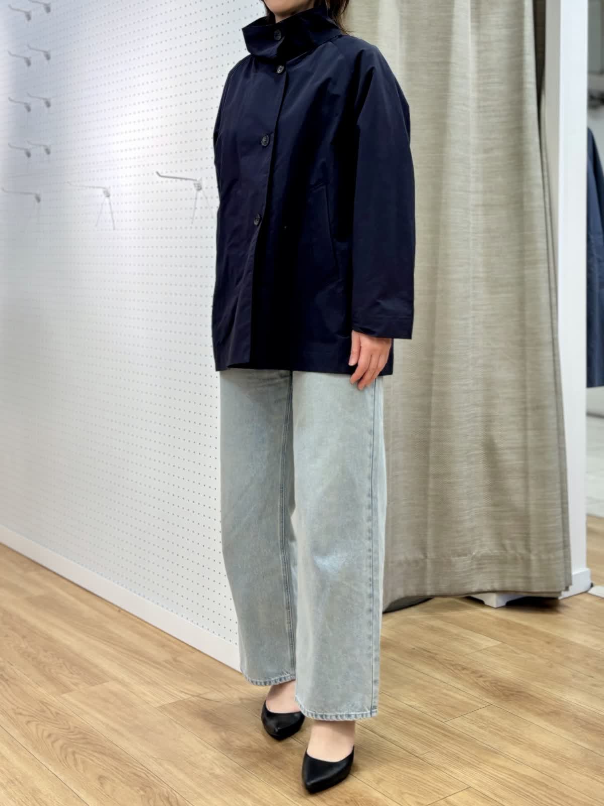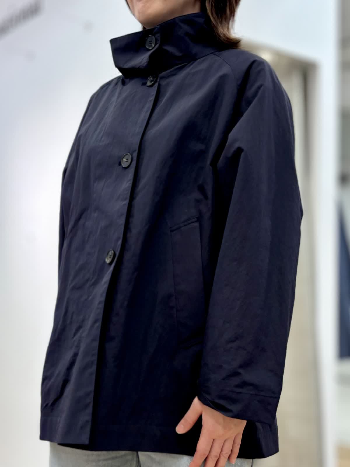 【着用カラー/サイズ】 コート:ネイビー/フリー ブラウス:ブルー/フリー パンツ:ブルー/11号 春のランチコーデ。日中の気温が高めになると軽い羽織りが便利です。裏地無しだから合わせるインナーを変えれば長く使えます。トレンドのタイ付きプラウスは紐も取り外し可能でスタイリングを楽しめます。