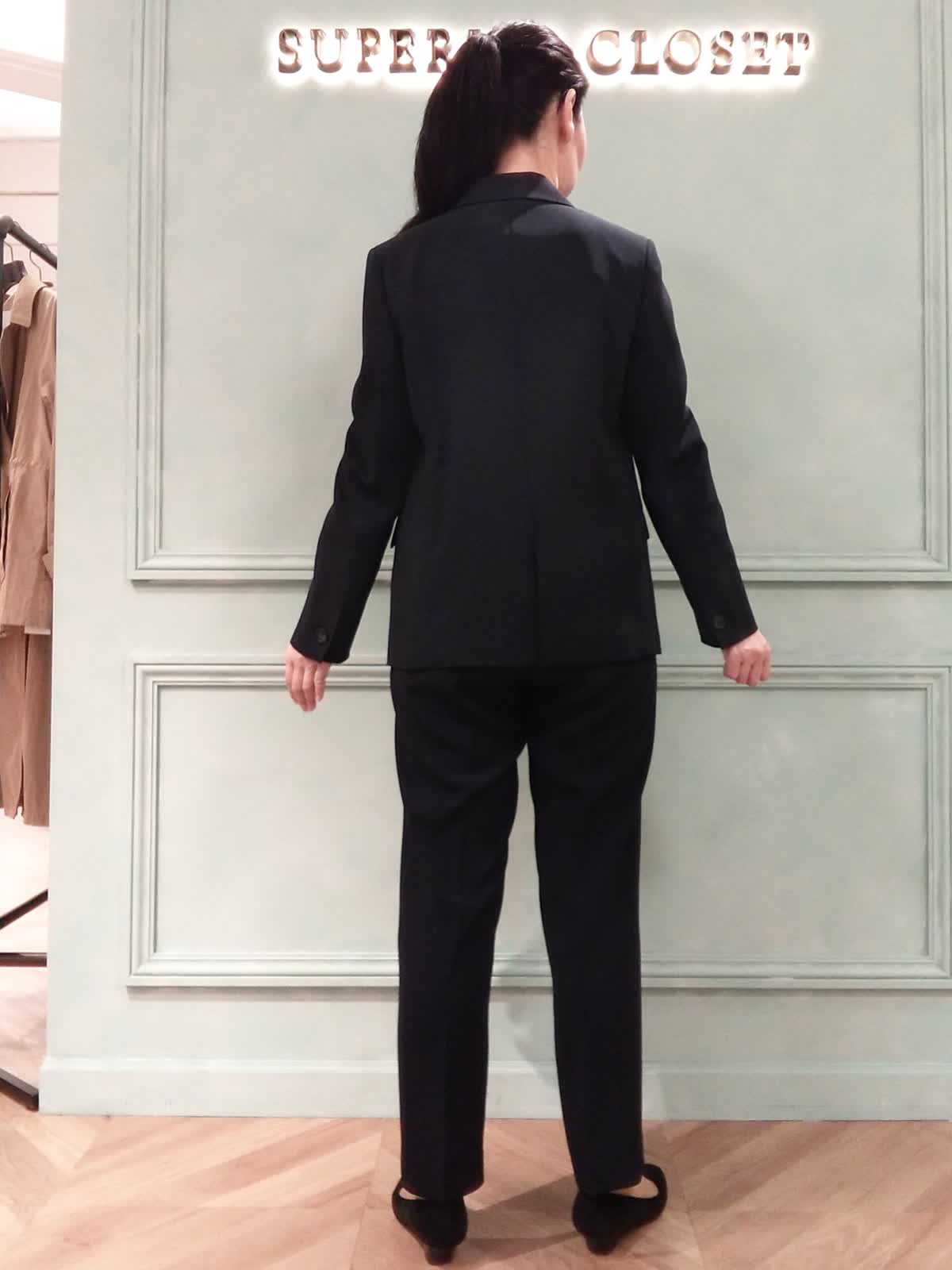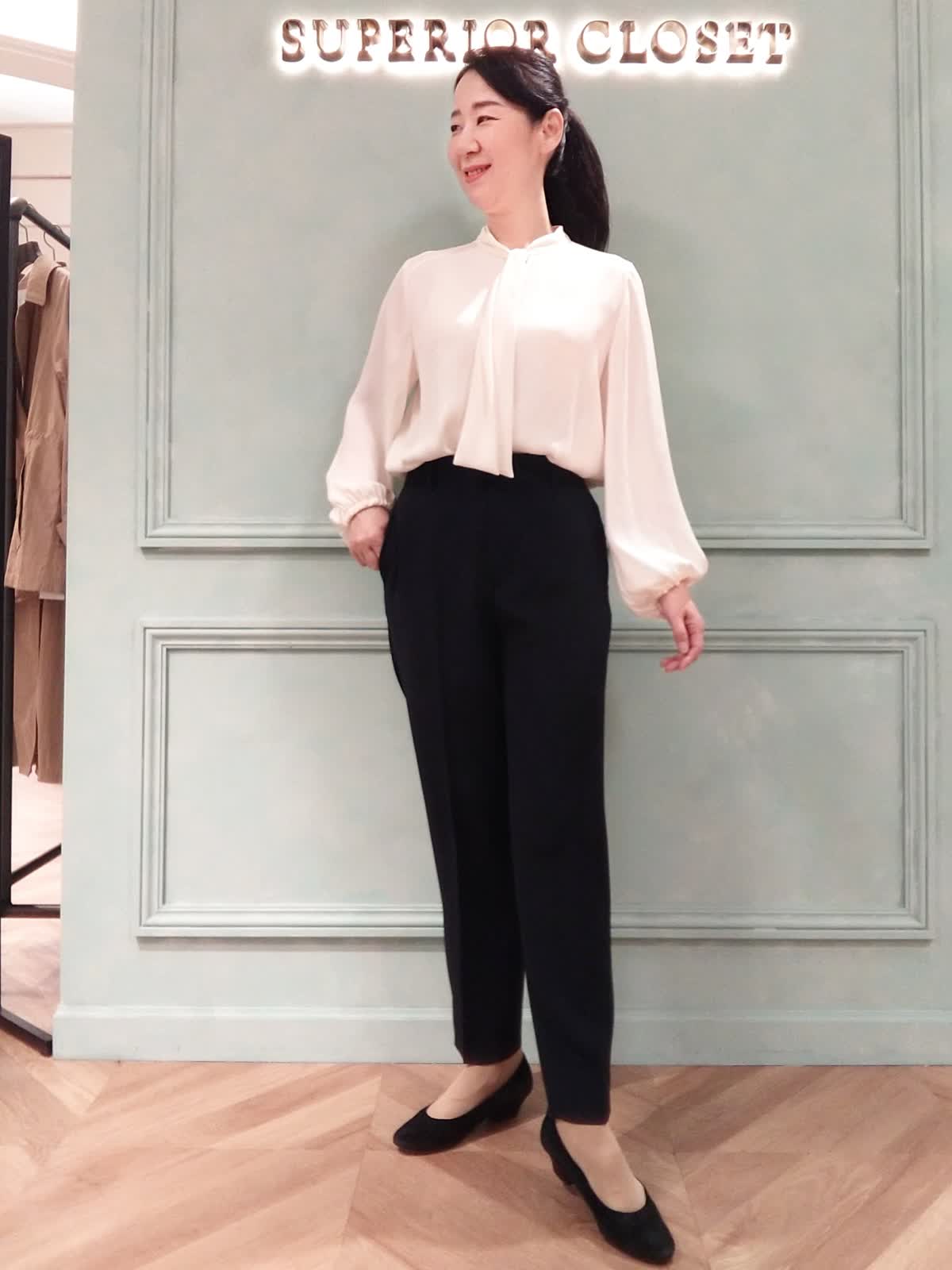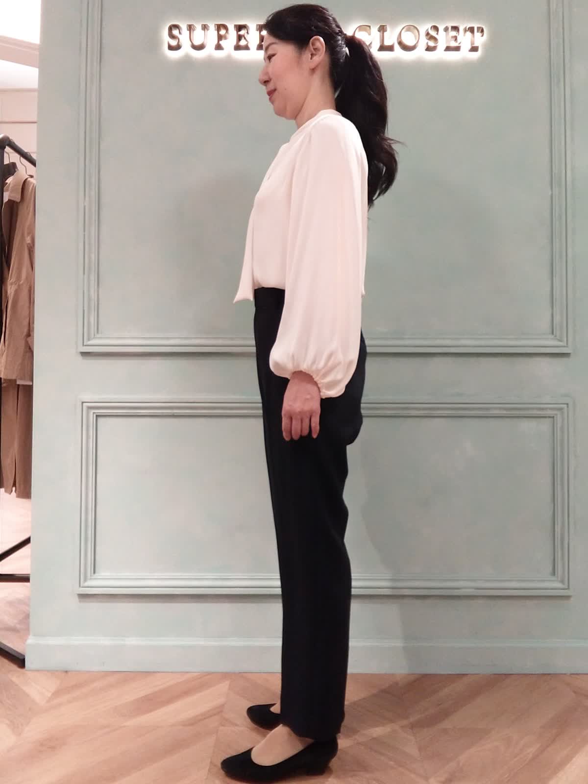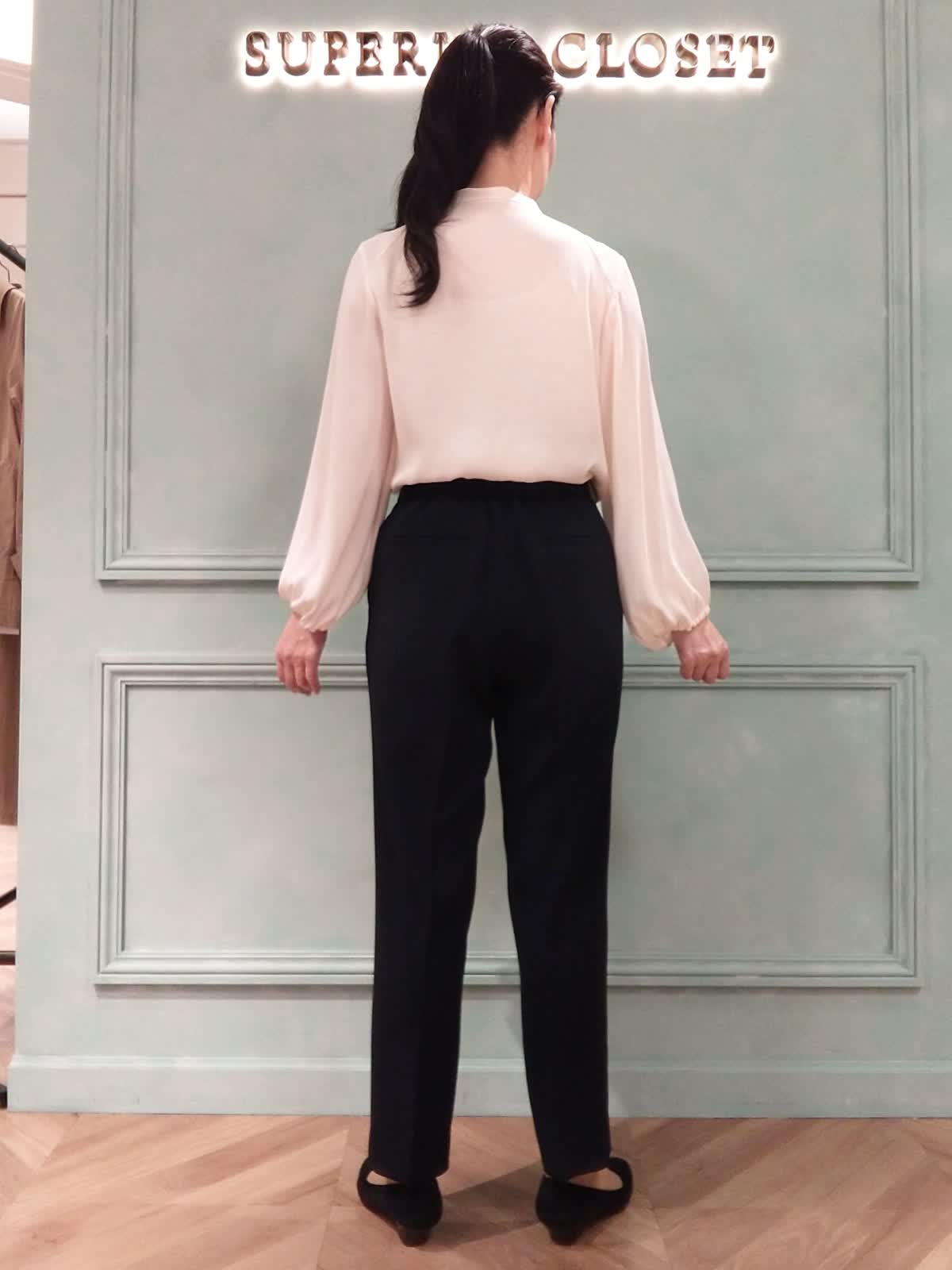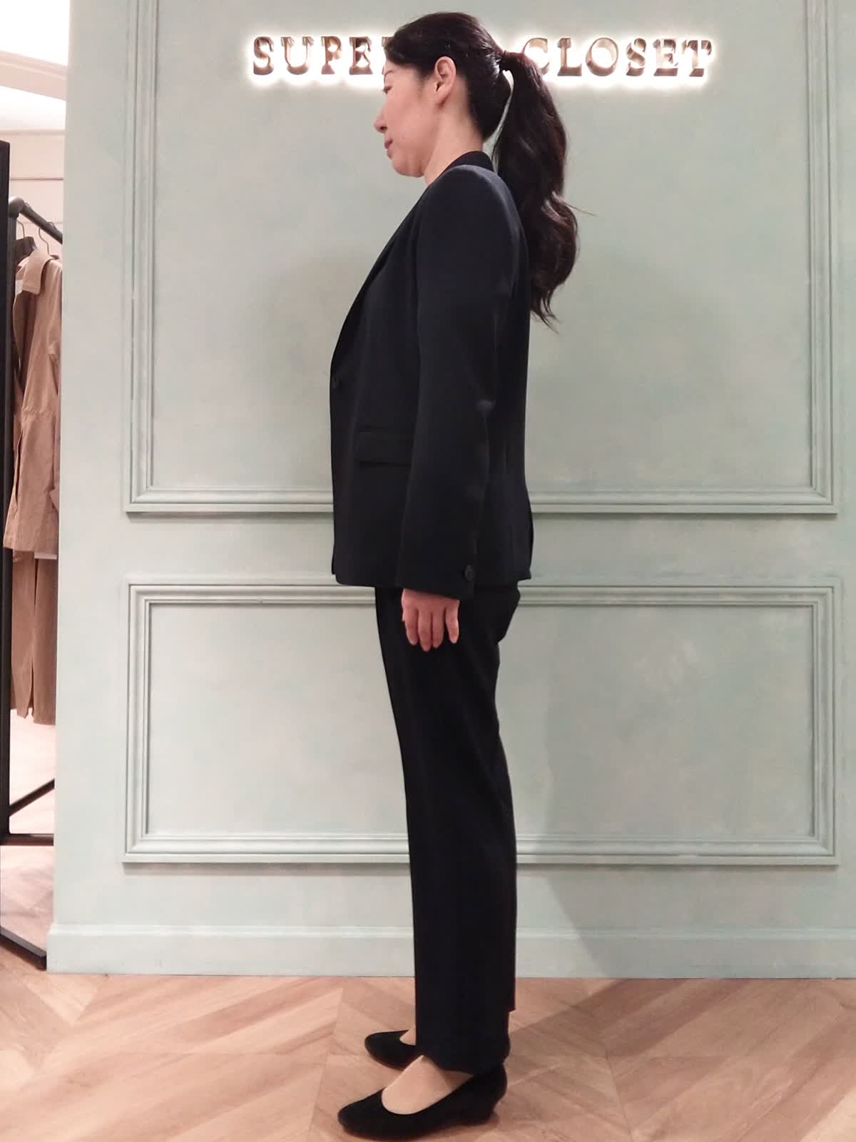 【着用サイズ】ジャケット:9号、ブラウス:9号、パンツ:9号 【着用カラー】ジャケット:ネイビー、ブラウス:オフホワイト、パンツ:ネイビー お仕事スーツスタイル。新年度はスーツを新調したい。シワにならずにお家で洗えて、ノーアイロンで着られるイージーケアアイテム。定番のテーラードジャケットと動きやすいテーパードパンツでコーディネート。インナーのとろみ素材のボウタイブラウスはスーツのかっちりした印象を和らげて、堅くなり過ぎずに優しい印象になります。パンツのウエストは後ろゴムで動きにフイットしてはきやすいです。