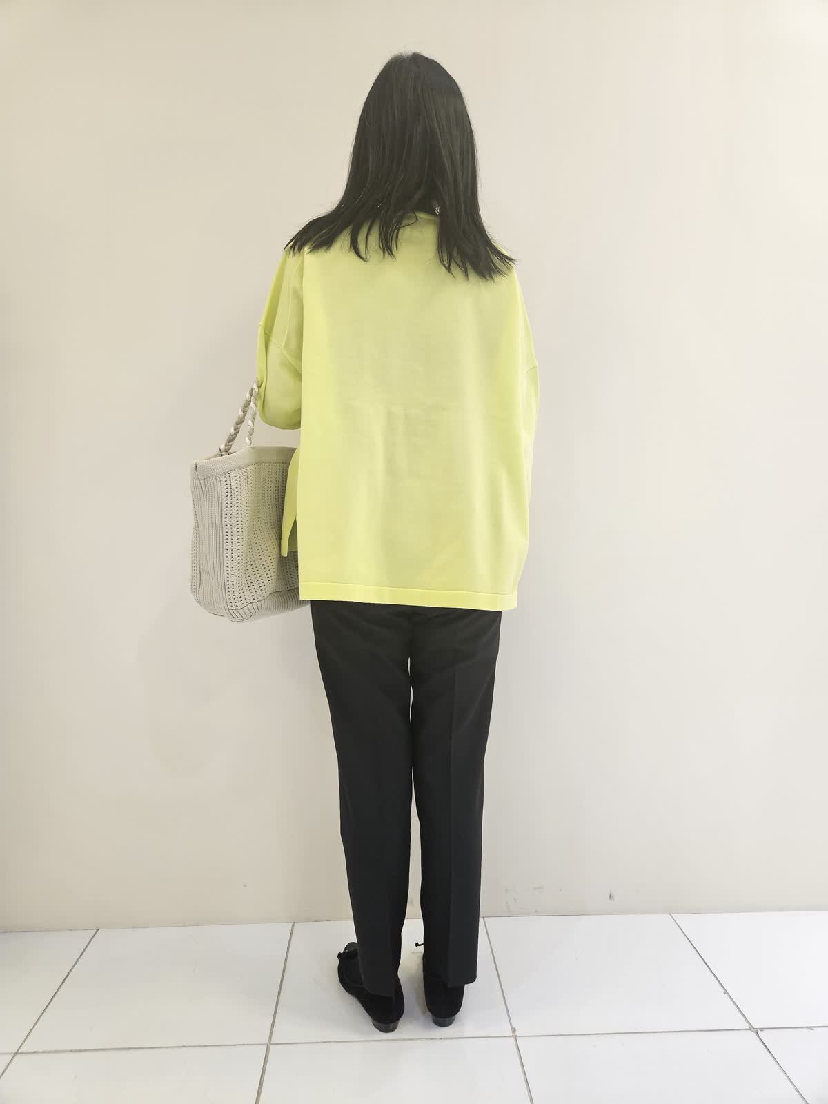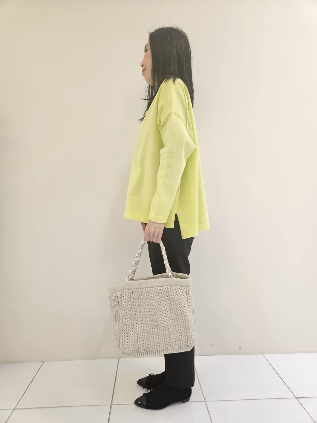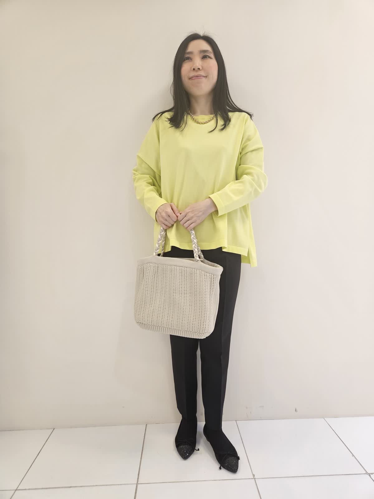 【着用サイズ・カラー】ニット:ビビッドイェロー9号・パンツ:ブラック5号 ・ネックレス:ゴールド フリー ・バッグ:ベージュ フリー 張りがありさらっとしているニットはパンツ合わせに◎ パンツは後ろがゴムで合わせやすいです。ネックレスはアクセントにお勧めです。バッグは持ちやすく沢山入るのでこれから春に向けてのデイリー使いにお勧めです。