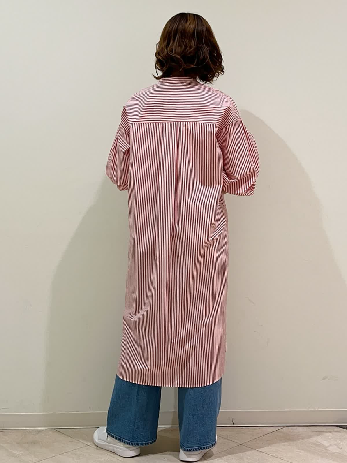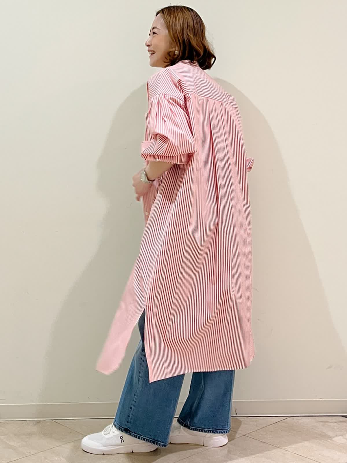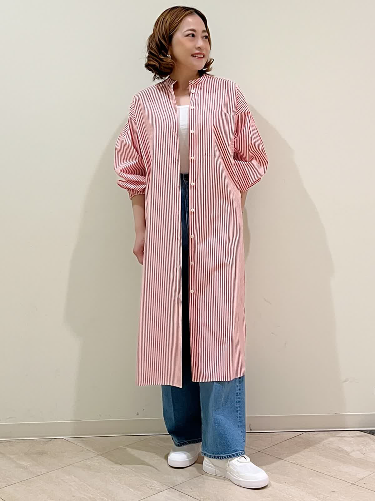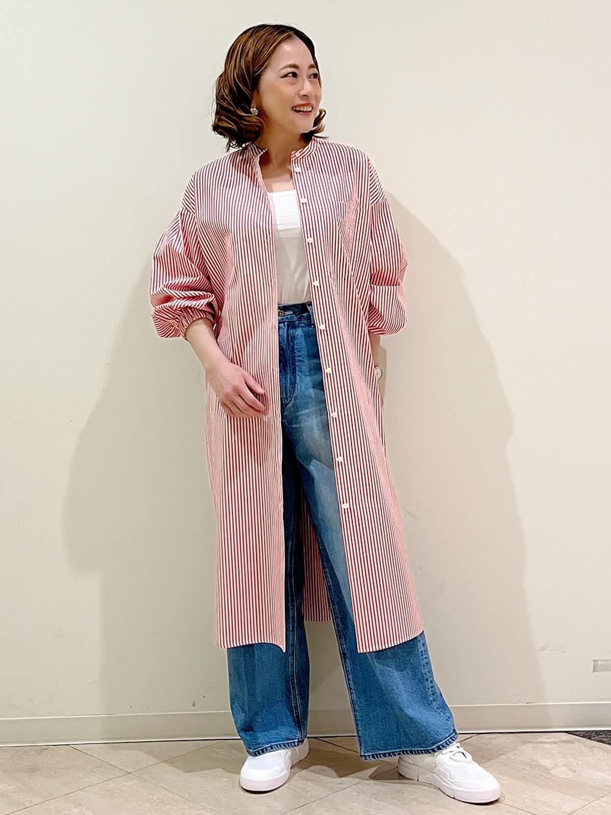 【着用サイズ】ワンピース:フリーサイズ タンクトップ:9号 パンツ:9号 【着用カラー】ワンピース:レッド タンクトップ:ホワイト パンツ:ブルー 春のカジュアルお出かけコーディネートです。ストライプのシャツワンピースを前を開けて軽く羽織りに。デニム合わせでラフにまとめました。一枚でも羽織りでも使える春に便利なシャツワンピースです。