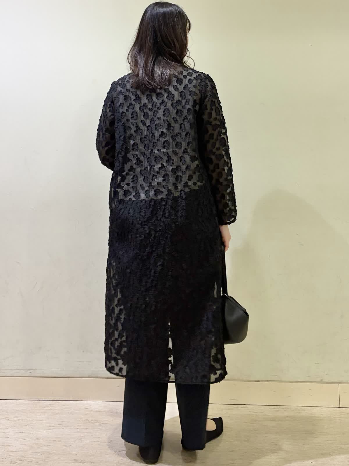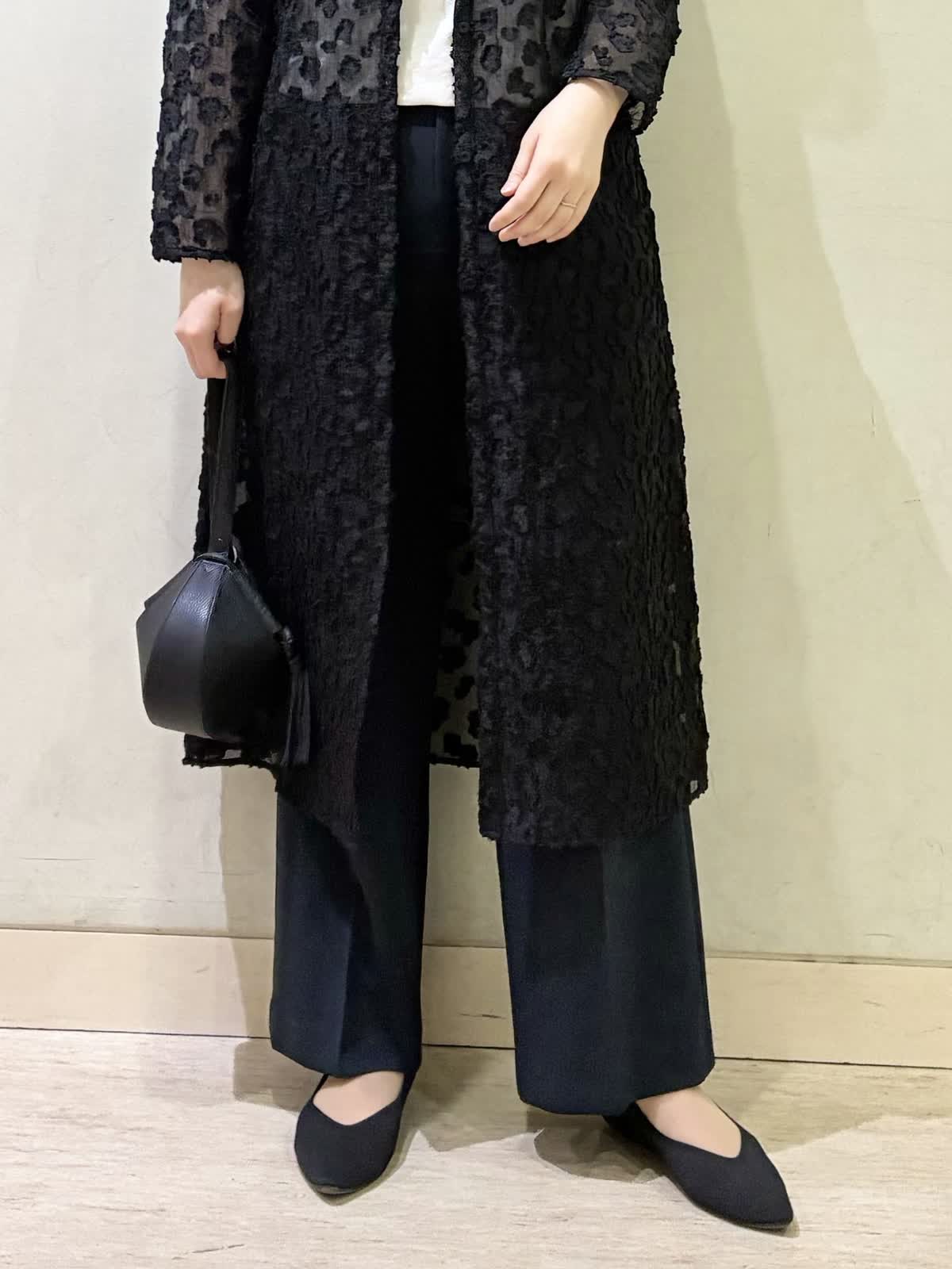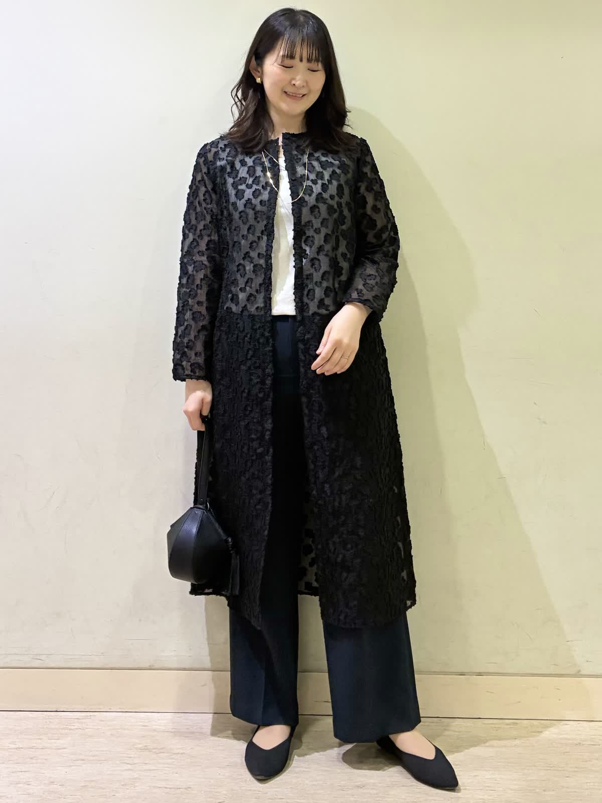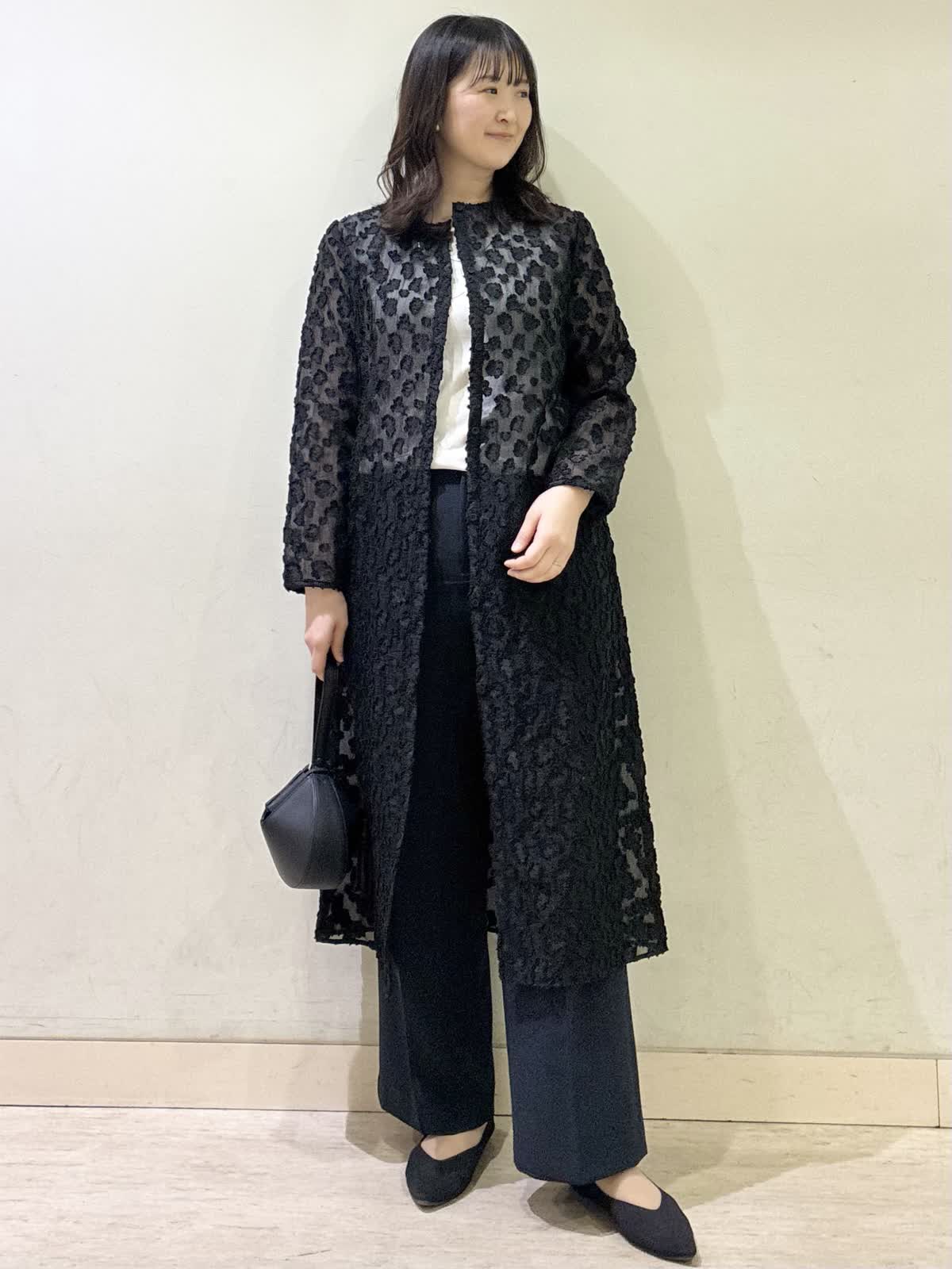 【着用カラー/サイズ】ワンピース:ブラック/フリー パンツ:ネイビー/11号 春の休日おでかけコーデ。透け感のあるワンピースが春らしく軽やかで、羽織りとして着るのがおすすめです。 モノトーンでコーディネートすると上品な休日コーデに。