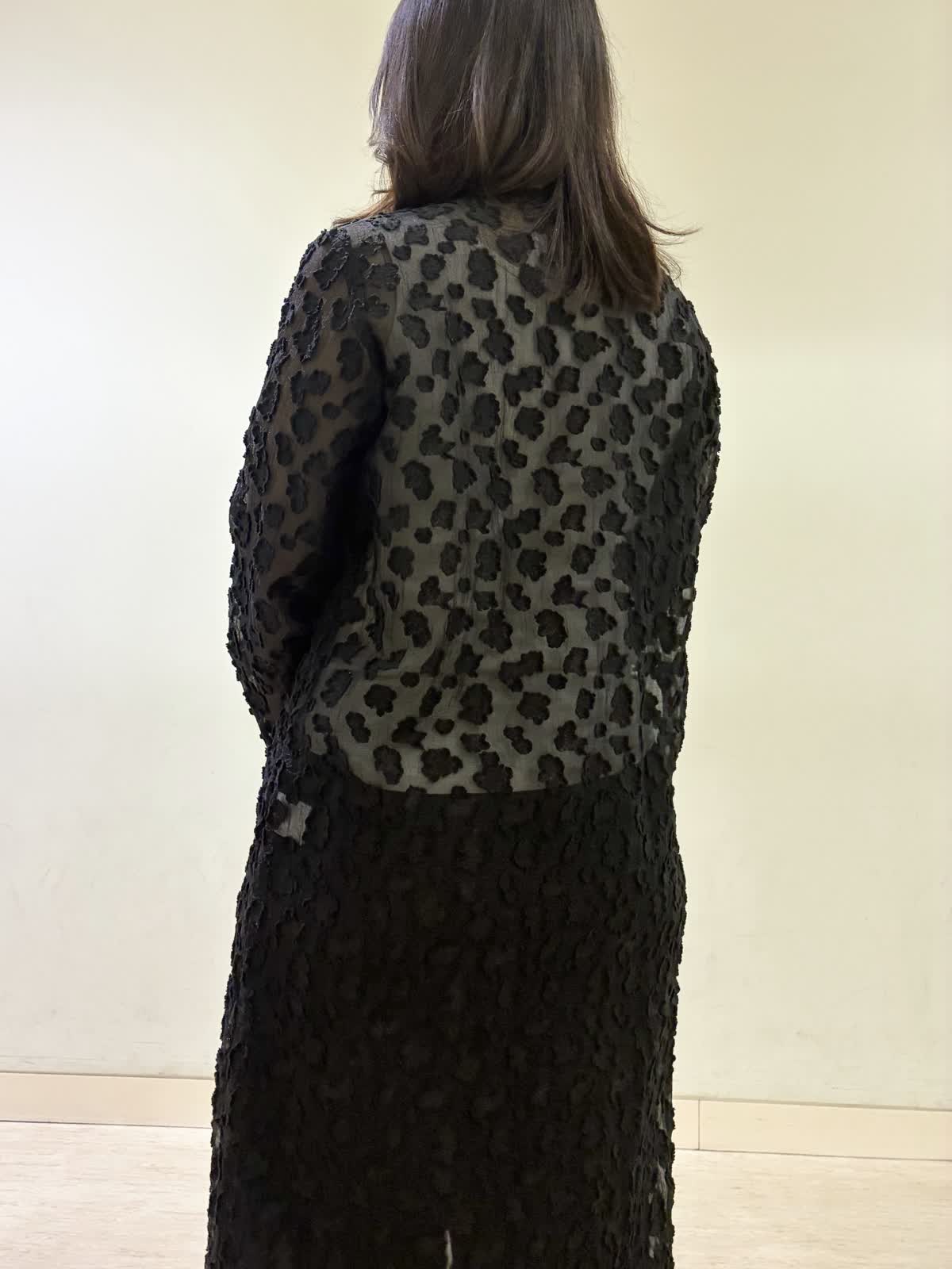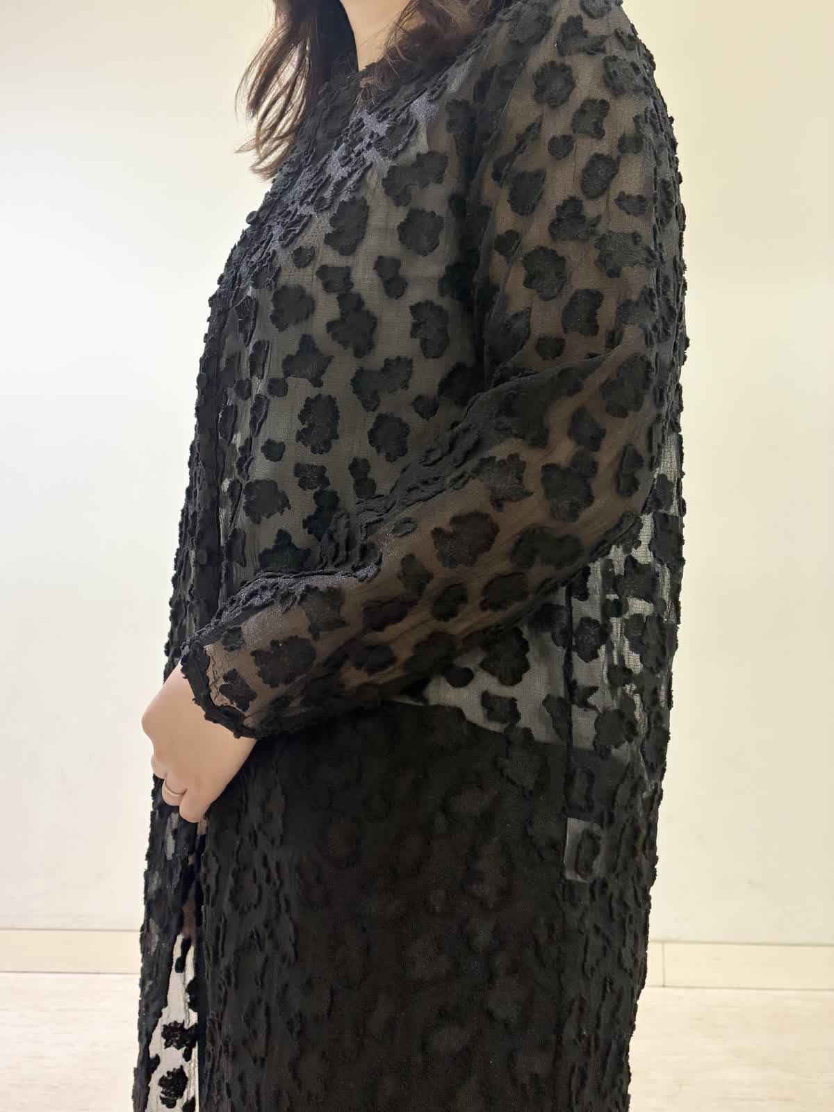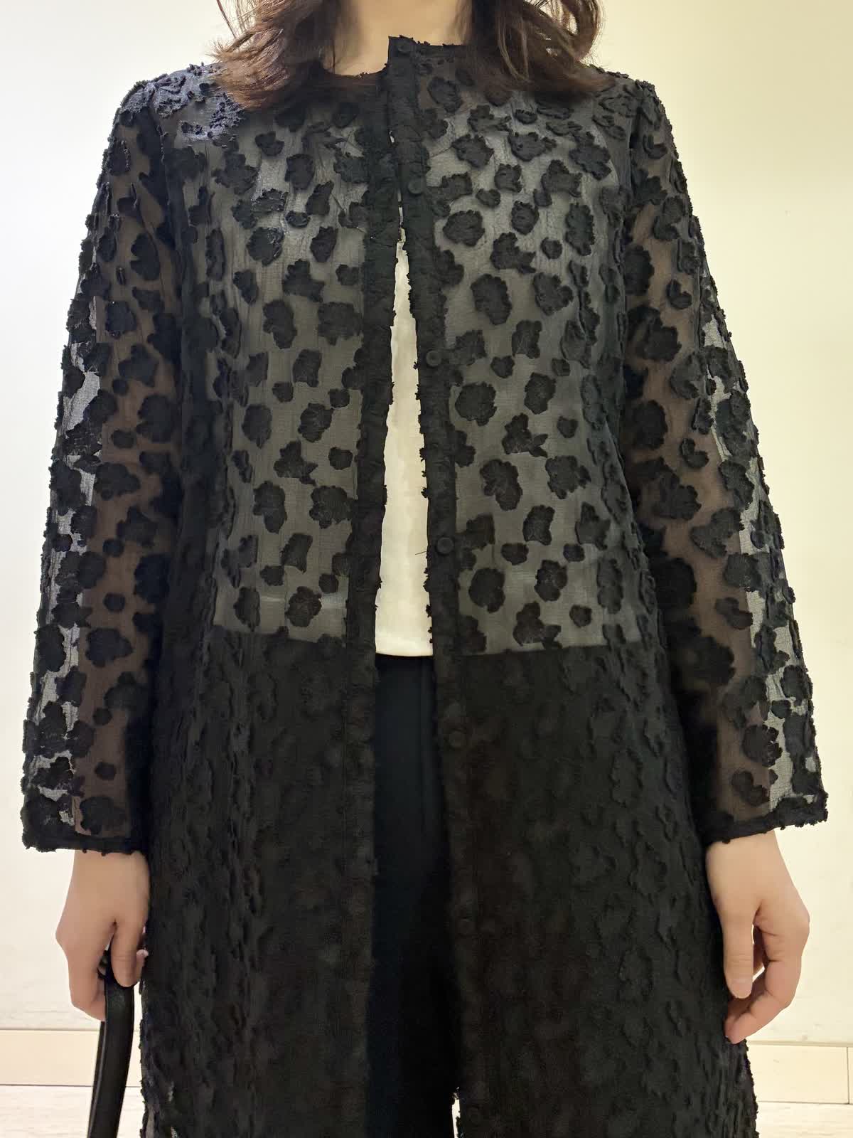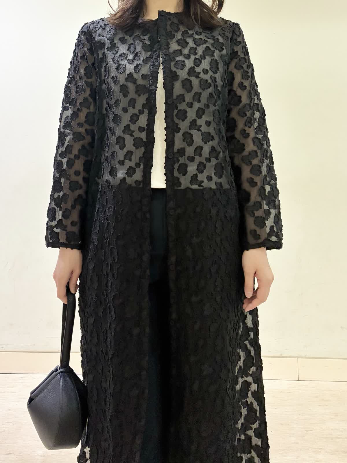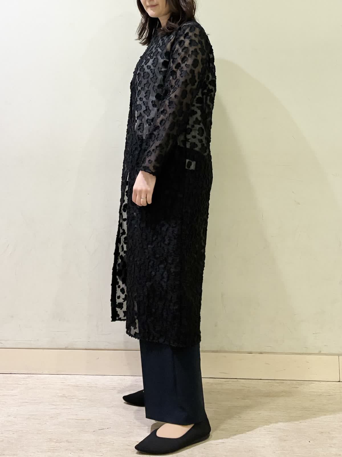 【着用カラー/サイズ】ワンピース:ブラック/フリー パンツ:ネイビー/11号 春の休日おでかけコーデ。透け感のあるワンピースが春らしく軽やかで、羽織りとして着るのがおすすめです。 モノトーンでコーディネートすると上品な休日コーデに。