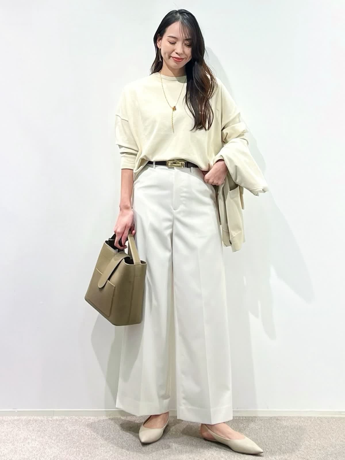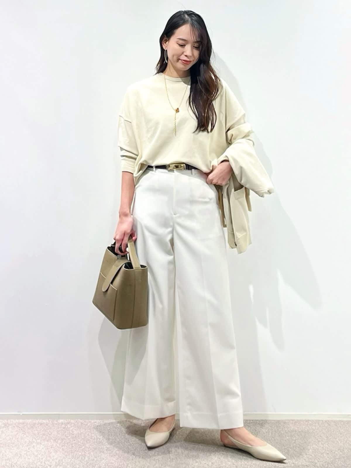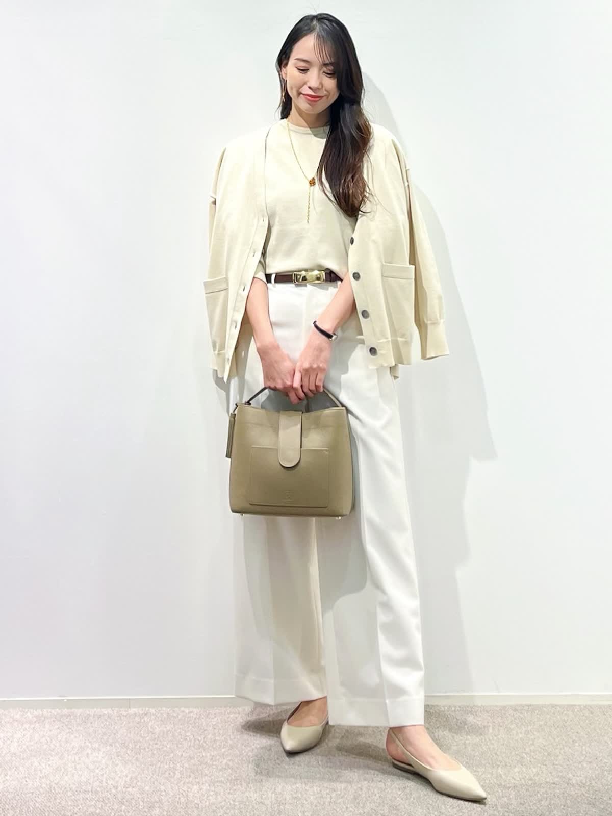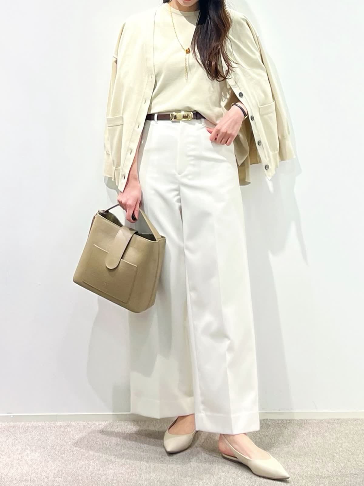 【着用サイズ】カーディガン:9号 ニット:9号 パンツ:9号 【着用カラー】カーディガン:ベージュ ニット:ベージュ パンツ:オフホワイト バッグ:グレーベージュ 「抜け感きれいめデイリーコーデ」 ゆったりめのサイズでこなれ感のある大人のデザインニット。ハリ感のある立体的なシルエットと、サイドスリットで、オーバーでもすっきり着こなせます。同素材のカーディガンと合わせると、コーディネートに万能。ボトムは、白のワイドパンツで、春のデイリーに着回せる淡色コーデの完成。ロングシーズン活躍出来るおすすめの春コーデです。