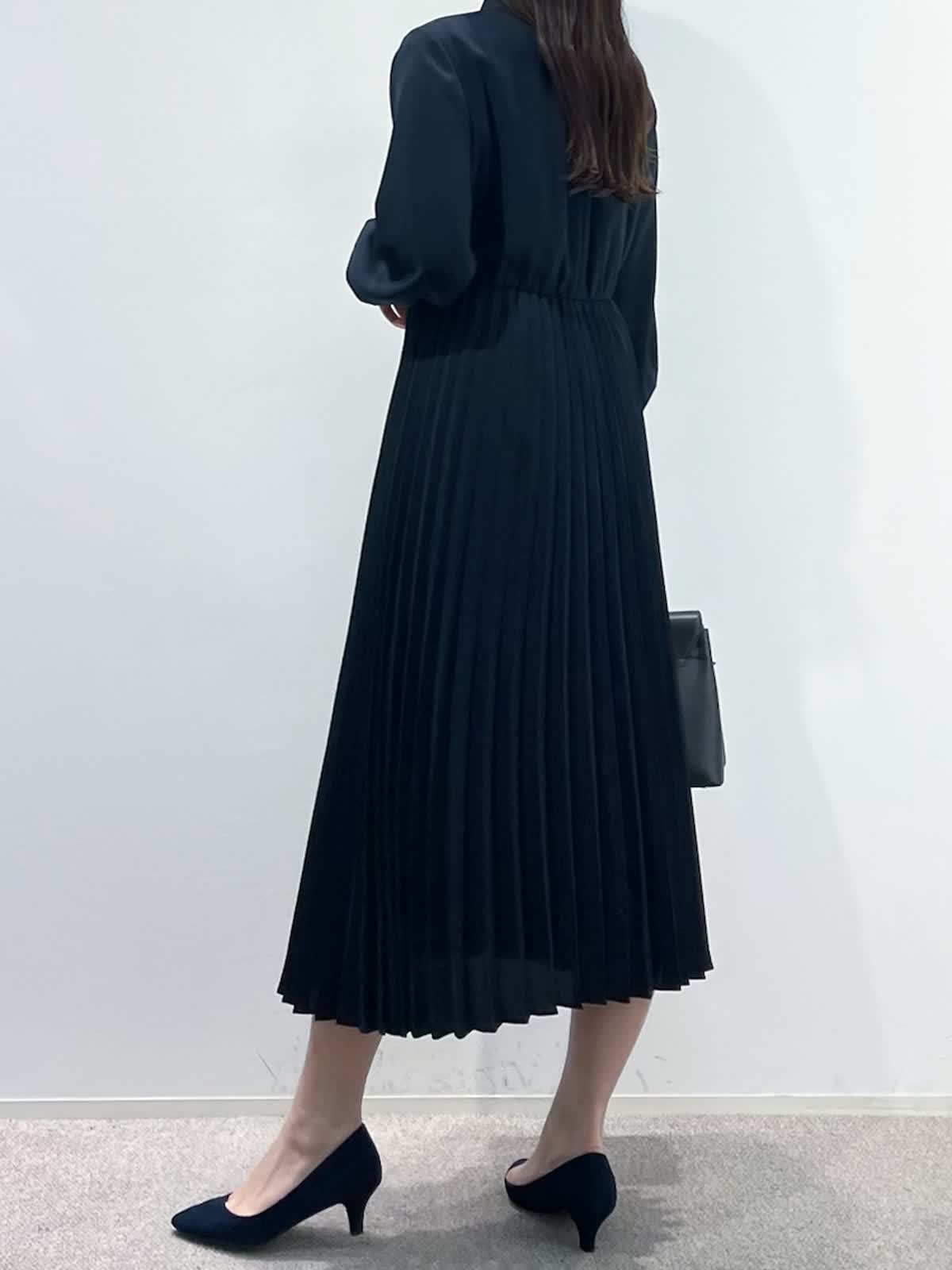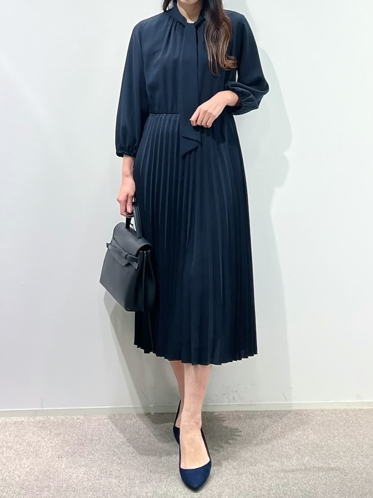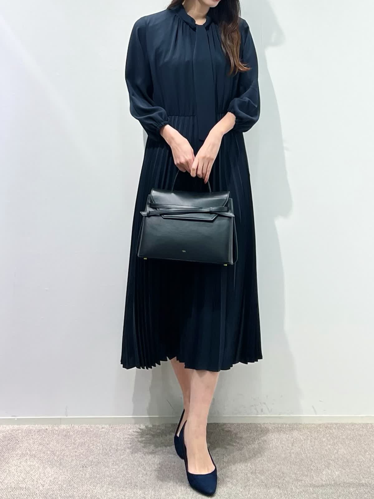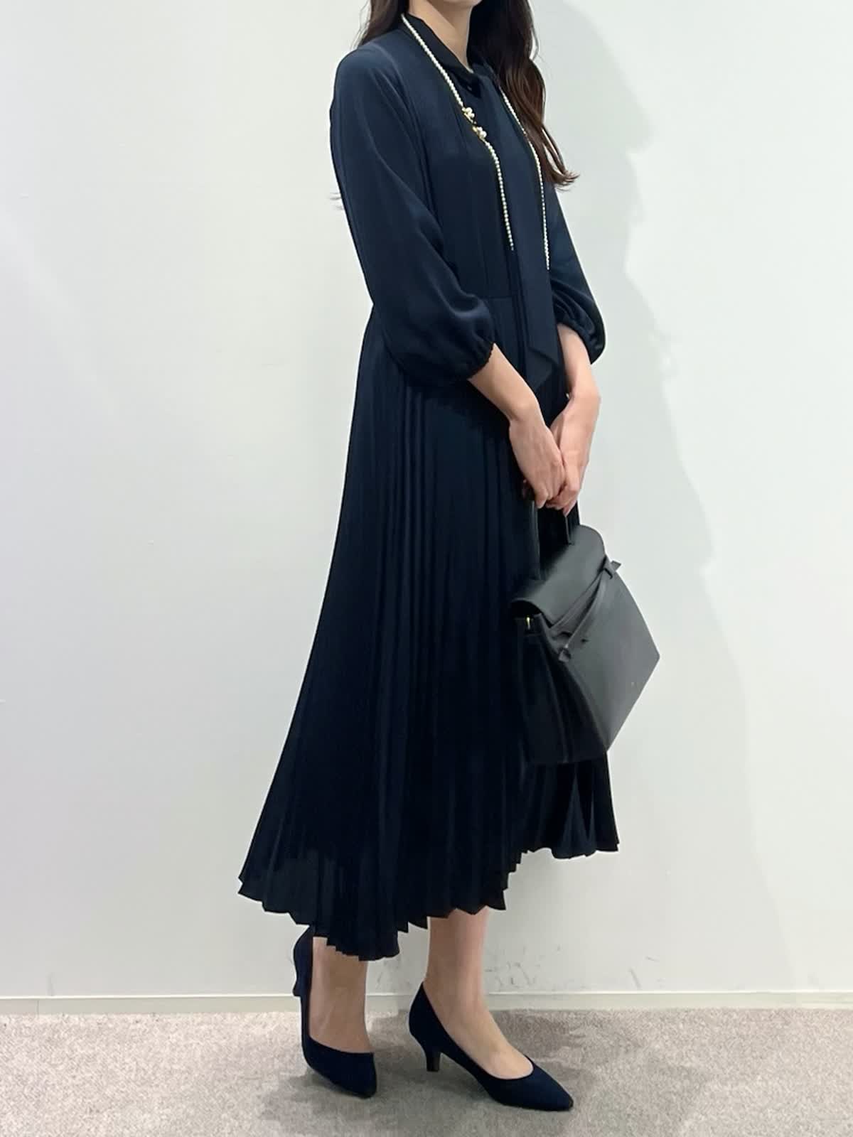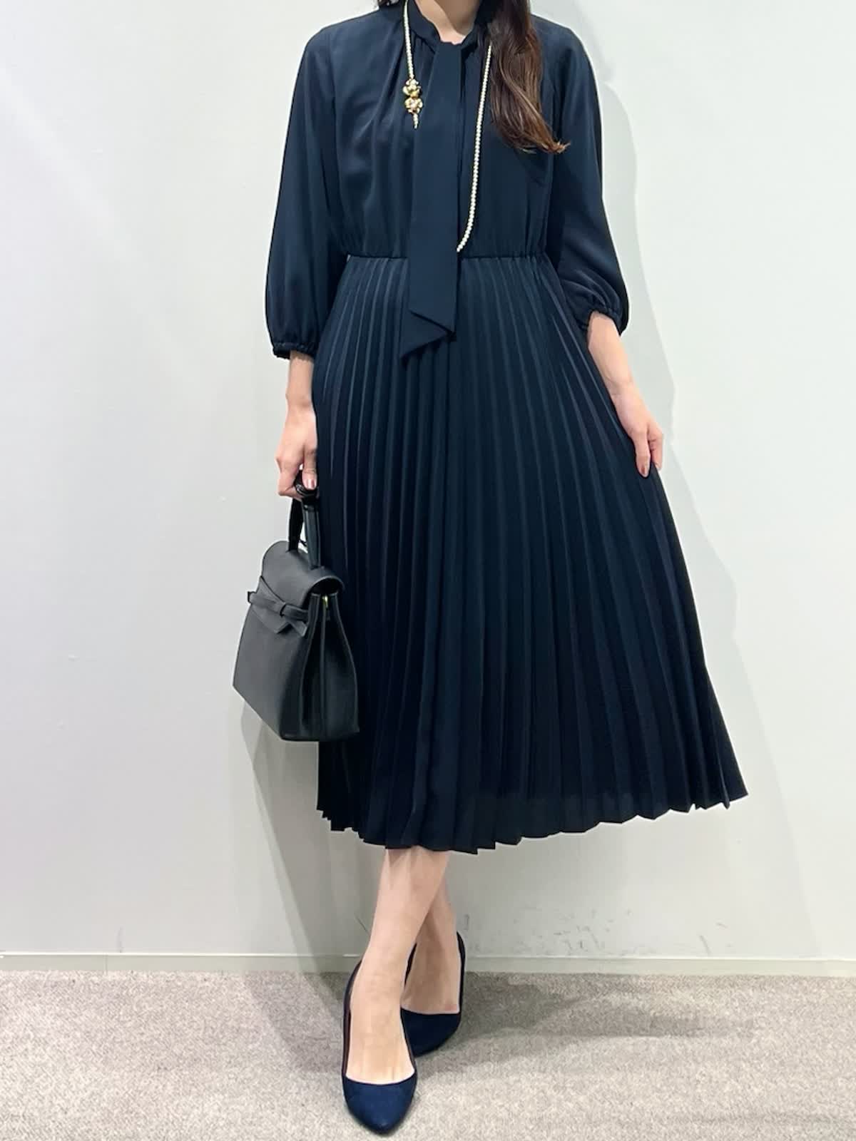 【着用サイズ】ワンピース:11号 【着用カラー】ワンピース:ネイビー バッグ:ブラック 「華やかボウタイワンピースセレモニースタイル」 セレモニーにも活躍するきちんと感のあるシフォン素材のプリーツワンピース。ウエストは、切り替えのゴム仕様で、ストレスフリーに着られるデザイン。ボウタイがアクセントになる万能ワンピース。1枚あると様々なシーンで活躍できるおすすめアイテムです。
