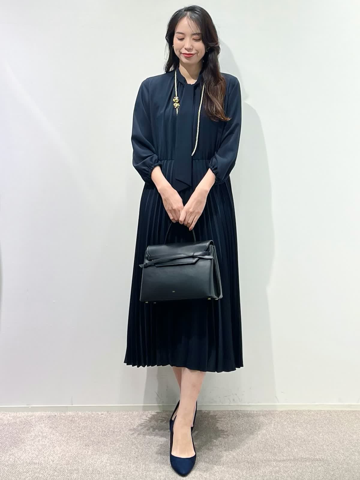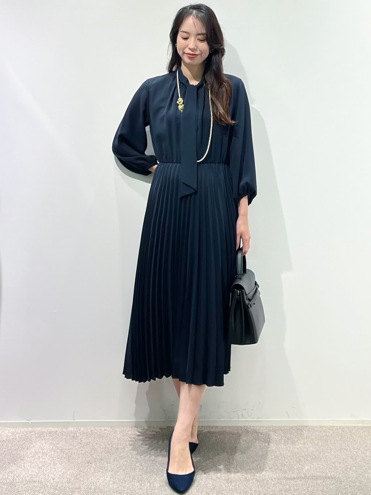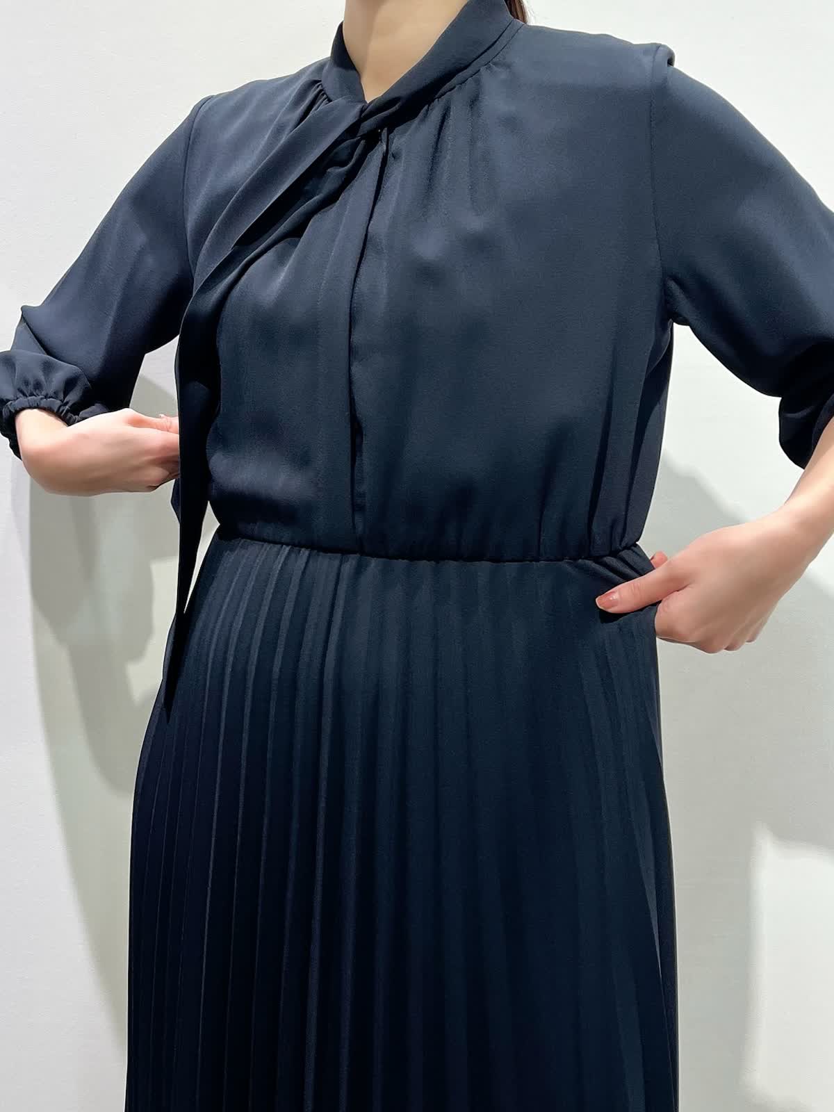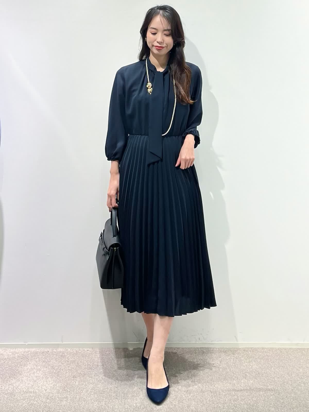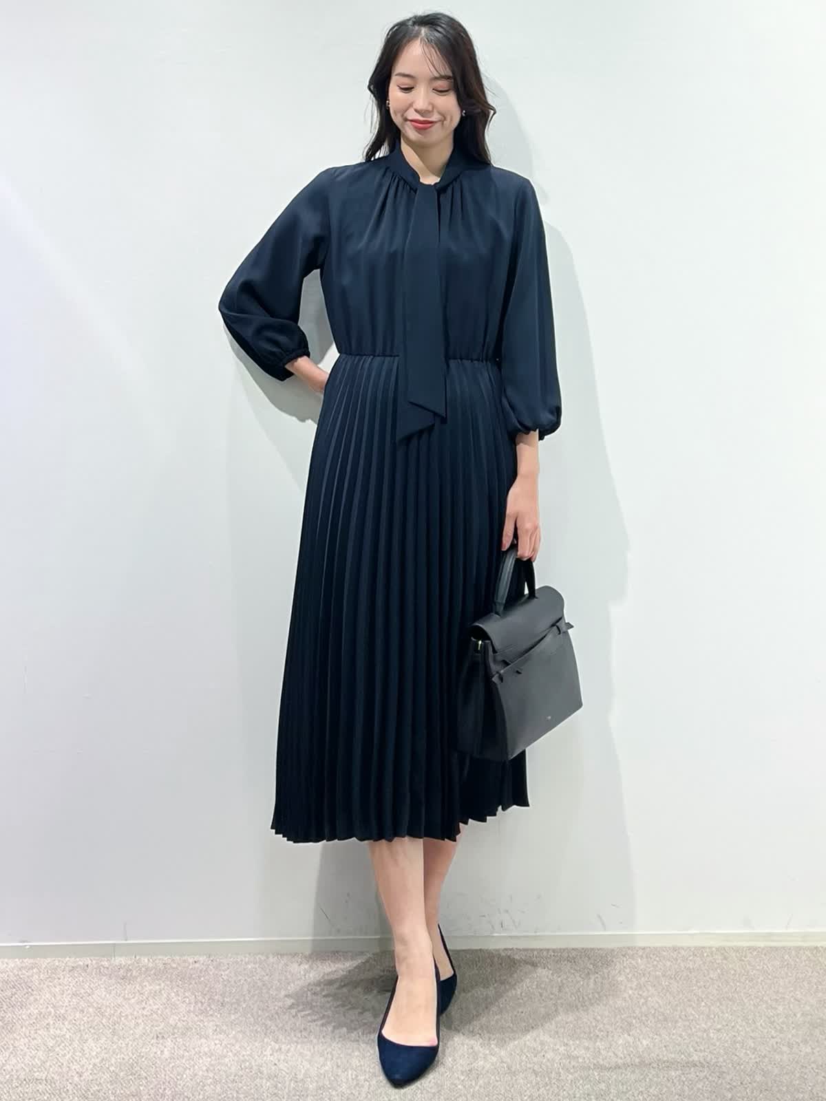 【着用サイズ】ワンピース:11号 【着用カラー】ワンピース:ネイビー バッグ:ブラック 「華やかボウタイワンピースセレモニースタイル」 セレモニーにも活躍するきちんと感のあるシフォン素材のプリーツワンピース。ウエストは、切り替えのゴム仕様で、ストレスフリーに着られるデザイン。ボウタイがアクセントになる万能ワンピース。1枚あると様々なシーンで活躍できるおすすめアイテムです。