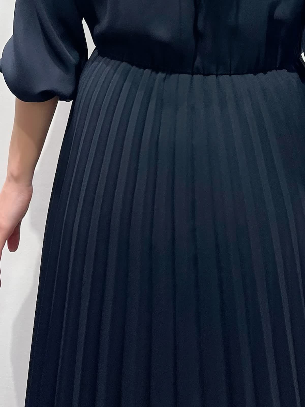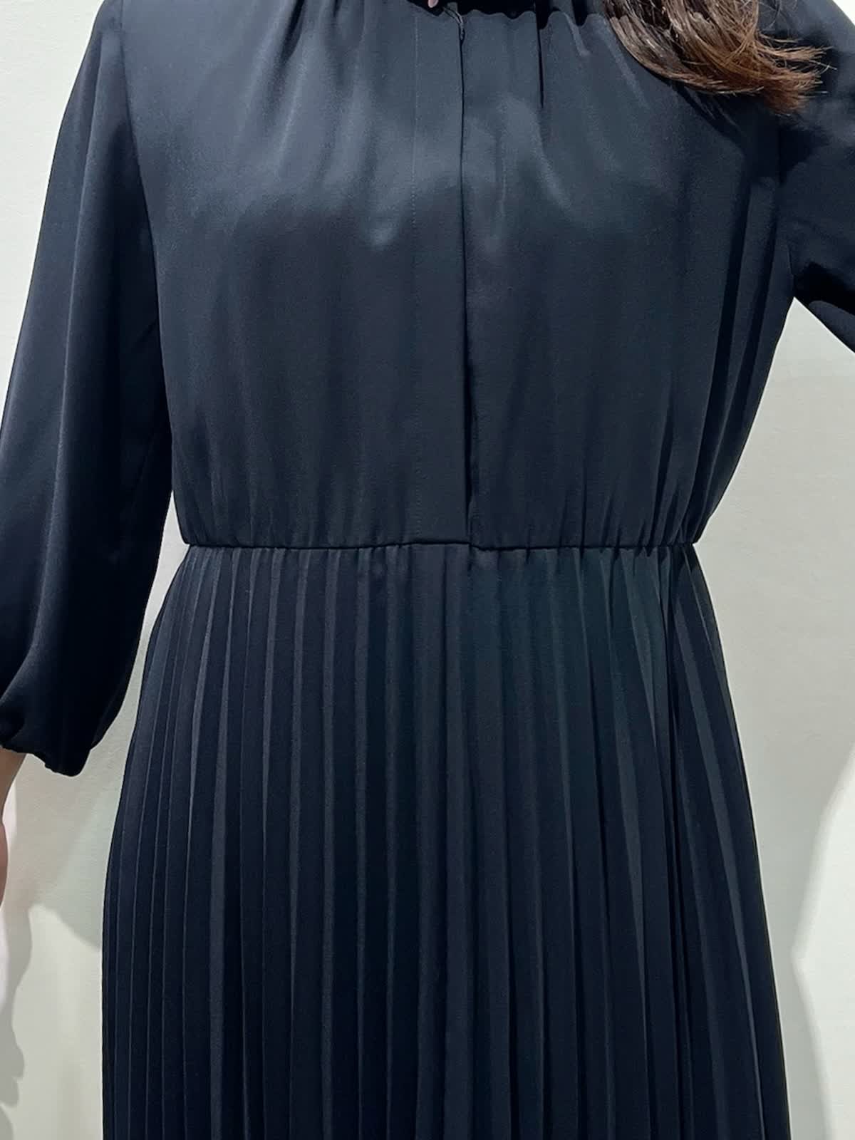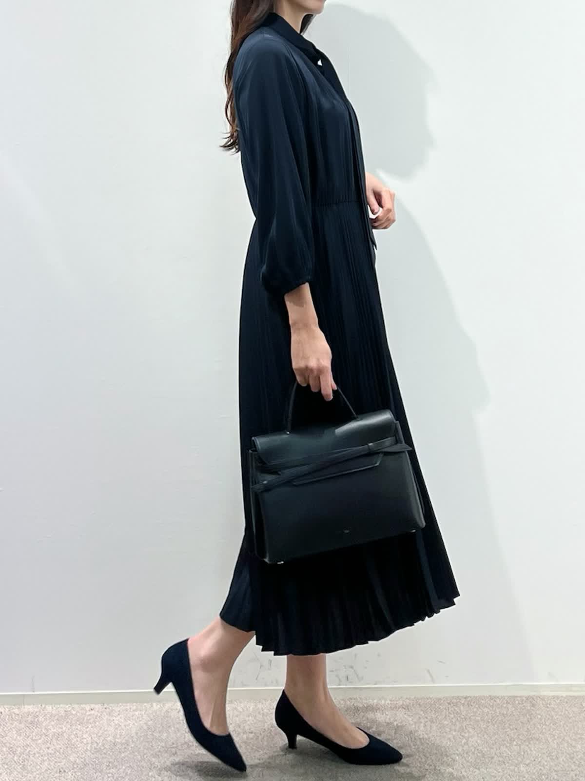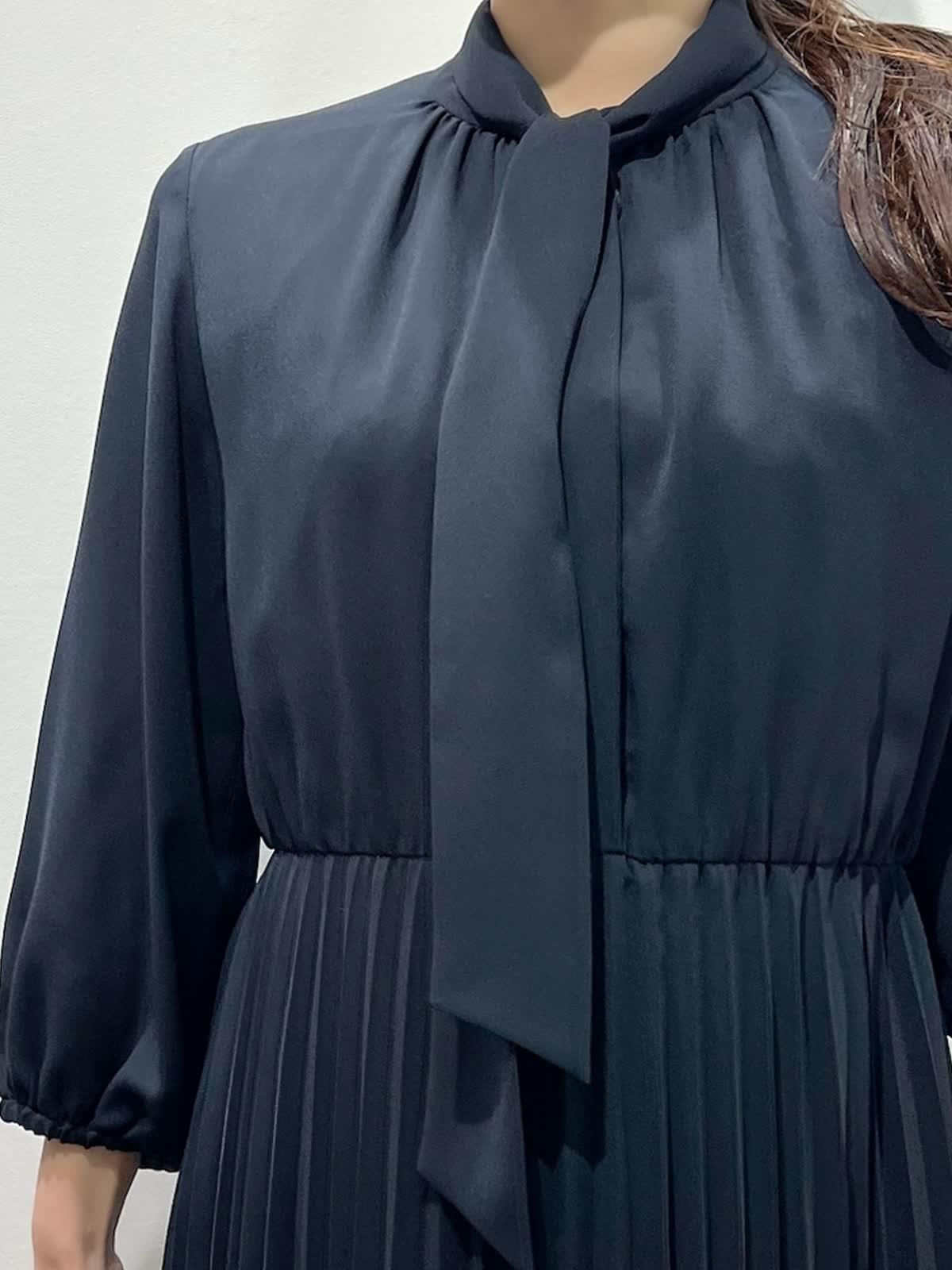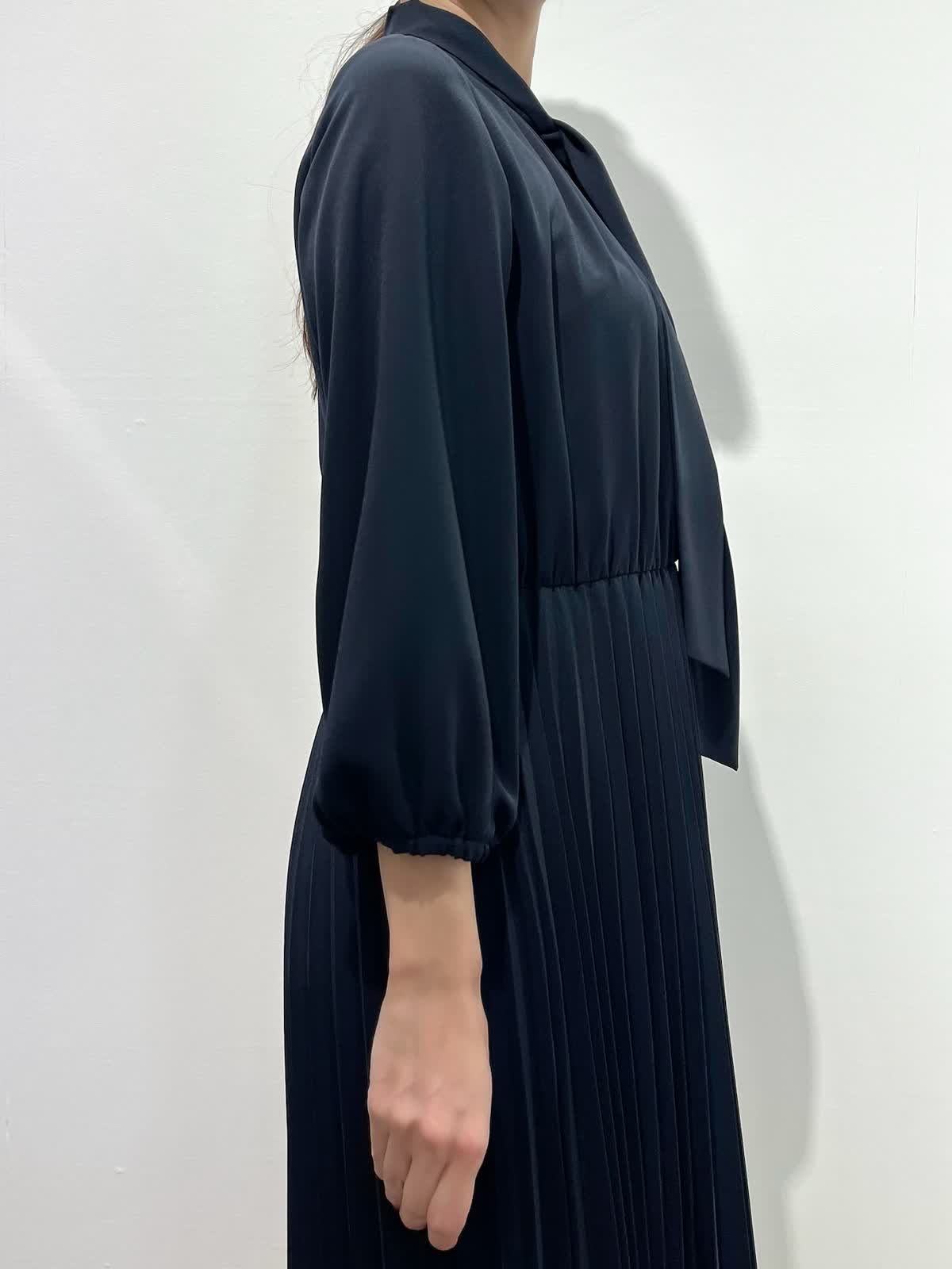 【着用サイズ】ワンピース:11号 【着用カラー】ワンピース:ネイビー バッグ:ブラック 「華やかボウタイワンピースセレモニースタイル」 セレモニーにも活躍するきちんと感のあるシフォン素材のプリーツワンピース。ウエストは、切り替えのゴム仕様で、ストレスフリーに着られるデザイン。ボウタイがアクセントになる万能ワンピース。1枚あると様々なシーンで活躍できるおすすめアイテムです。