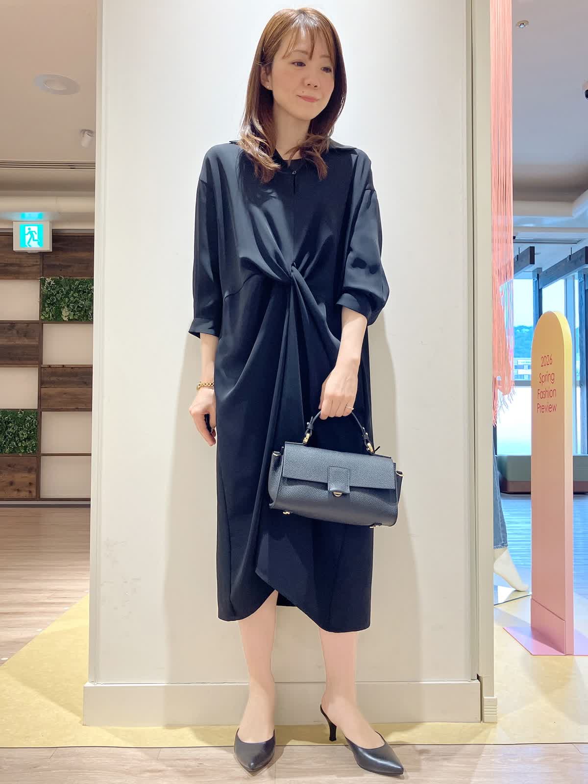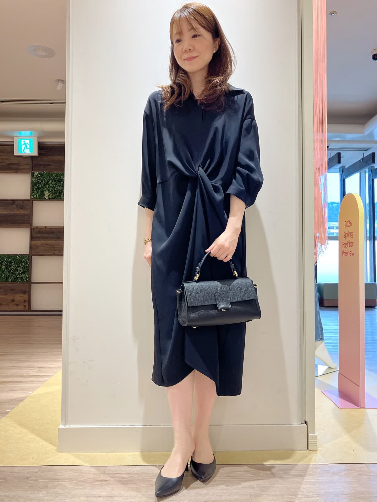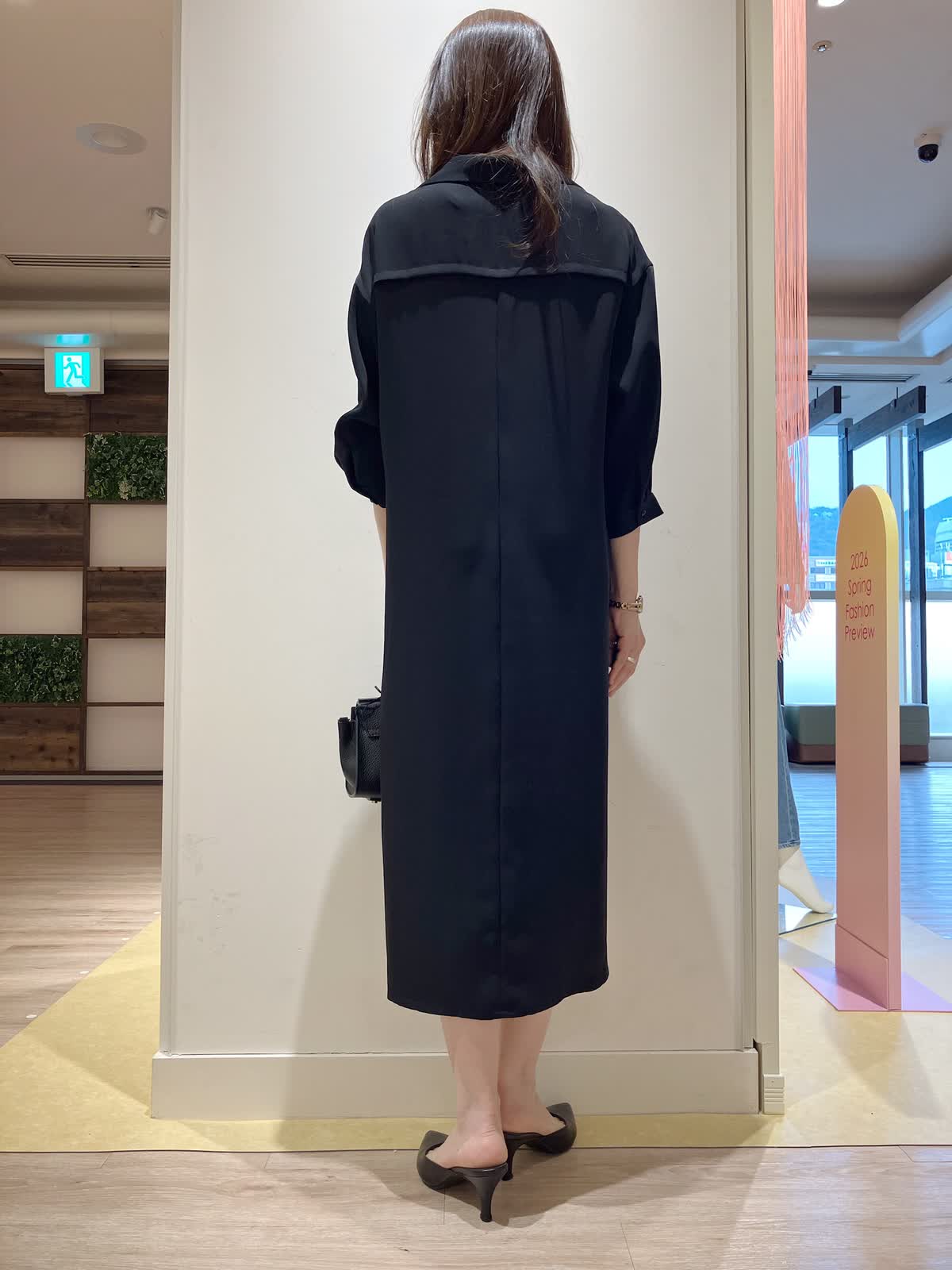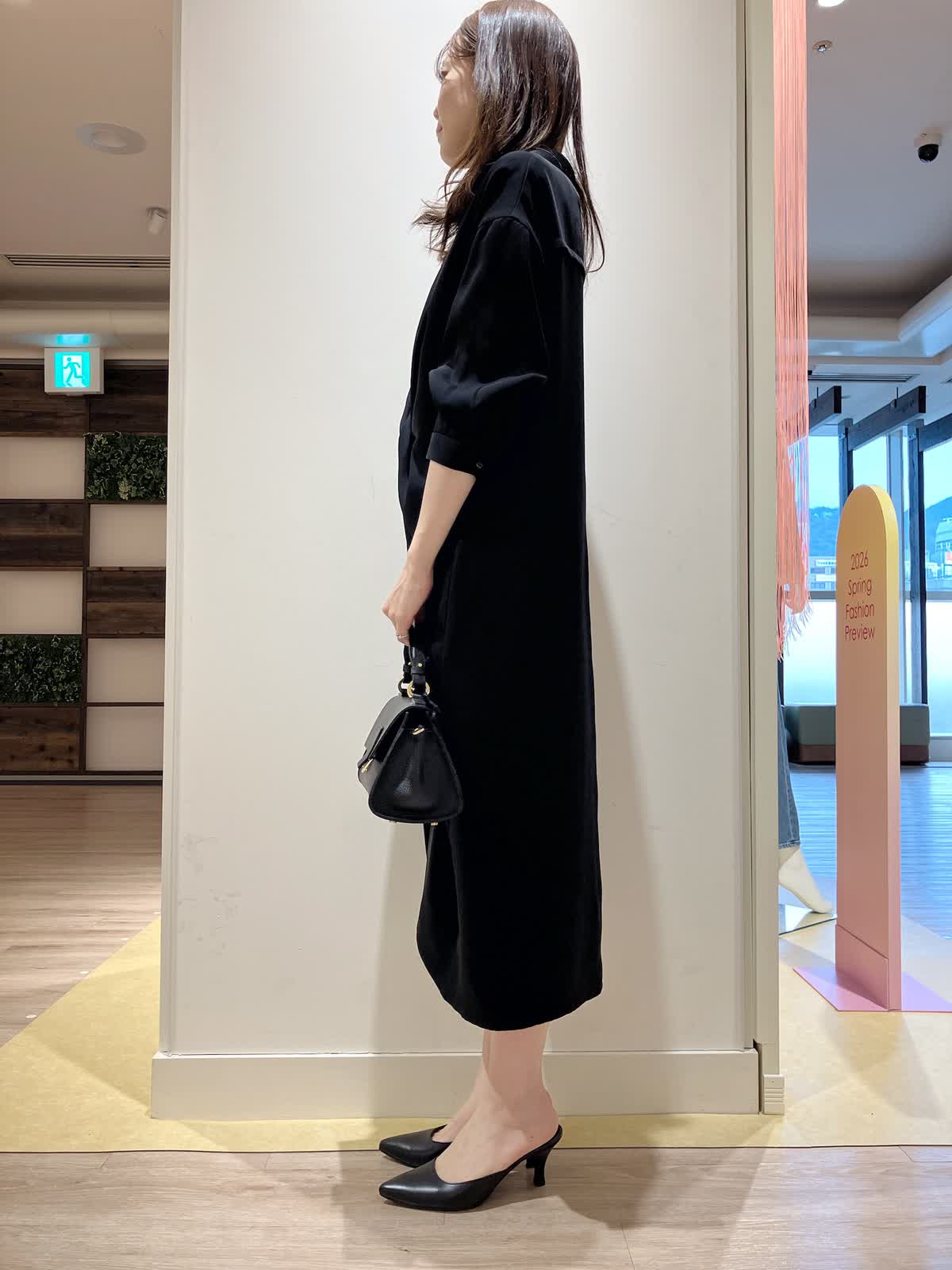 【着用サイズ】ワンピース:9号【着用カラー】ワンピース:ブラック コーディネートのテーマは1枚で決まるワンピーススタイリングです。 ウエストにツイストデザインを入れた、サテンの落ち感のあるシャツワンピースは、透け感もなく、1枚でサラッと着られて、1枚で様見えする優秀アイテム。オール黒で合わせて、お出かけ仕様に。