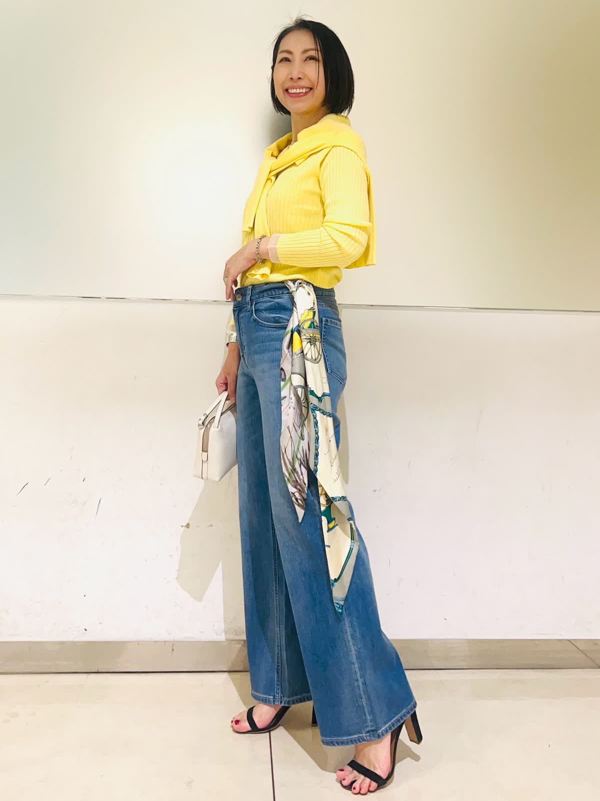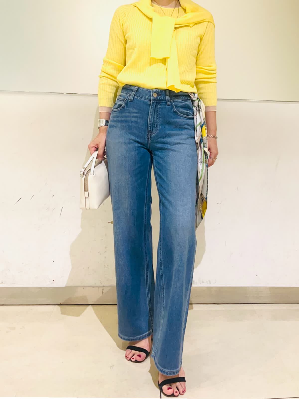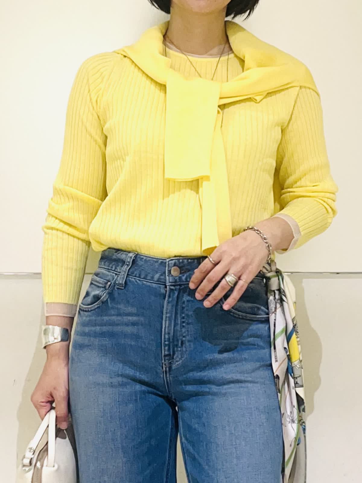 【着用アイテム】すべて9号 【着用カラー】ニット、カーディガン:イエロー パンツ:インディゴ 春のカジュアルコーディネート。明るいイエローが心ときめく春色ニット。シルク混てわしっとりとした着心地のいい肌触り。ワイドリブなので体のラインを拾いません。イエローに相性のいいインディゴのデニムを合わせて、春のカジュアルスタイリング。お花見など、外でのイベントが楽しみになるコーディネートです。