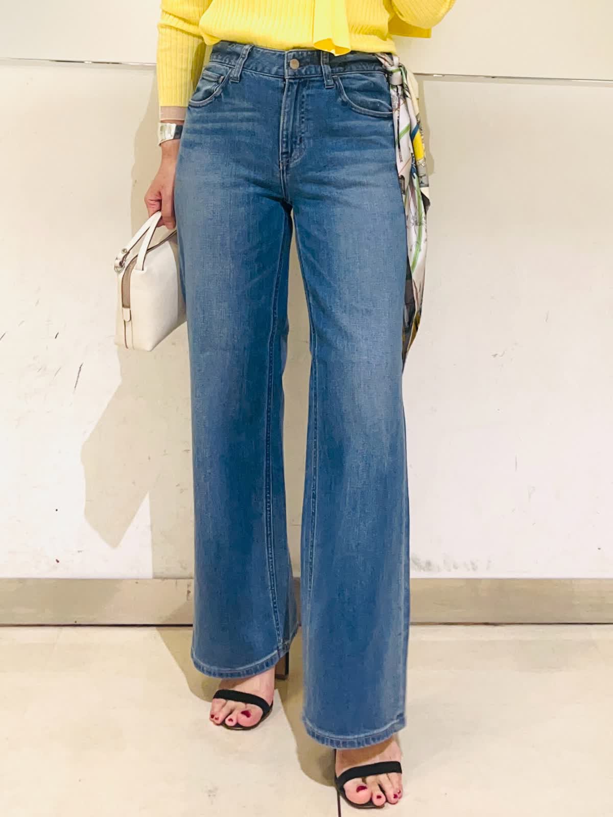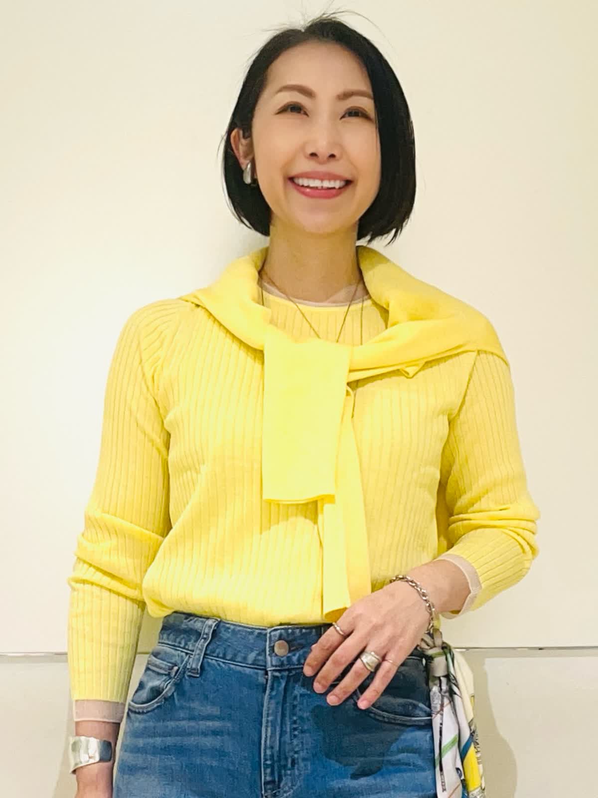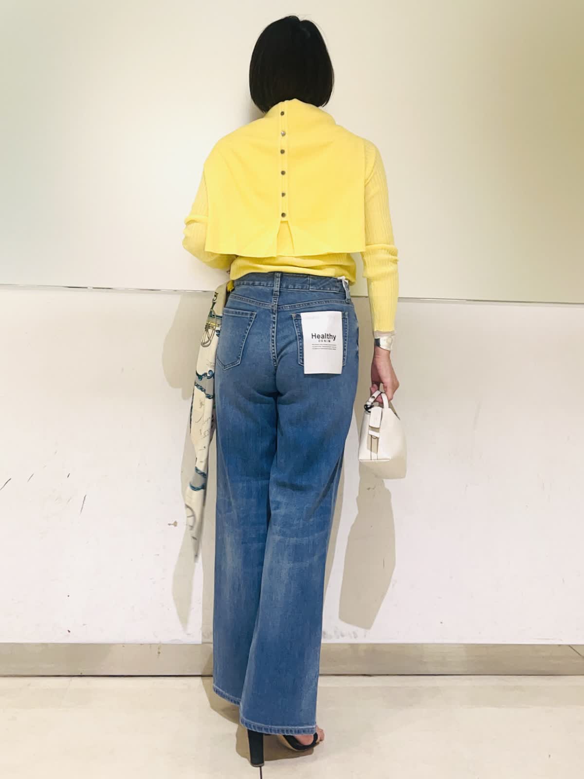 【着用アイテム】すべて9号 【着用カラー】ニット、カーディガン:イエロー パンツ:インディゴ 春のカジュアルコーディネート。明るいイエローが心ときめく春色ニット。シルク混てわしっとりとした着心地のいい肌触り。ワイドリブなので体のラインを拾いません。イエローに相性のいいインディゴのデニムを合わせて、春のカジュアルスタイリング。お花見など、外でのイベントが楽しみになるコーディネートです。