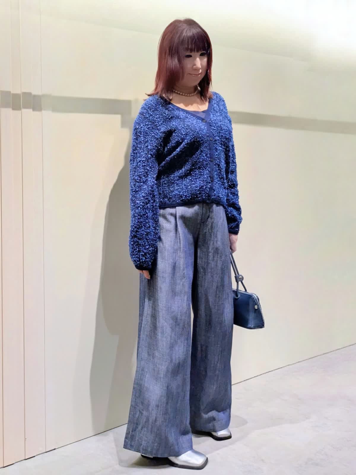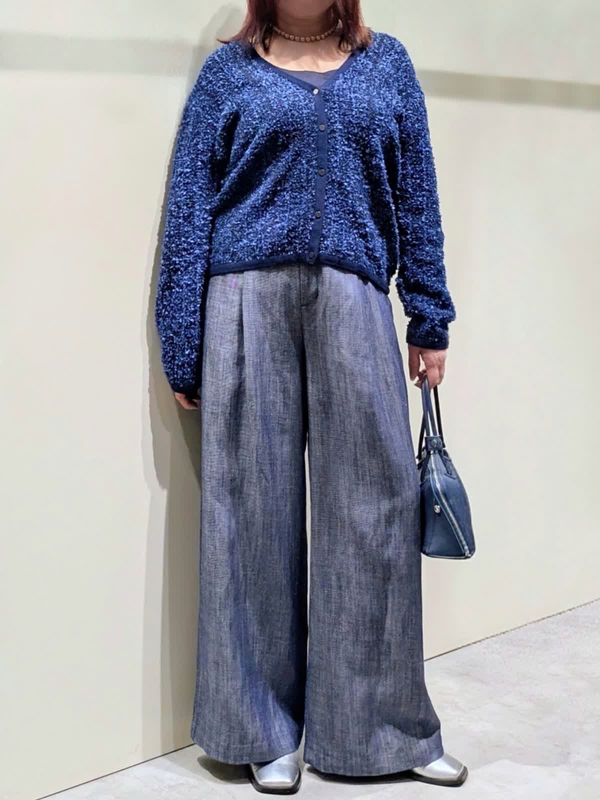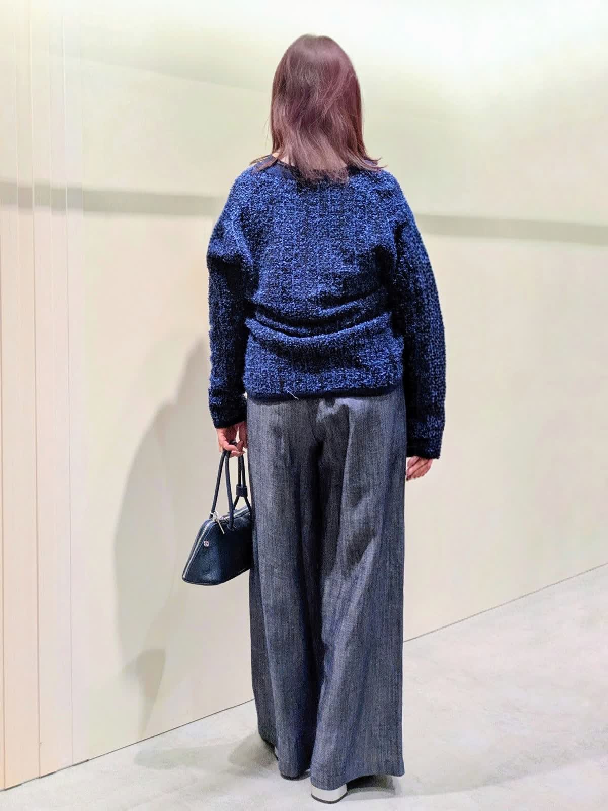 【着用サイズ】カーディガン:フリーサイズ パンツ:9号【着用カラー】カーディガン、パンツ:ネイビー 春のデニムコーディネート ツィード調のニットカーディガンは、ジャケットのような上品さと華やかさがあり、着心地も柔らかく軽やかです。デニムパンツは、フロントのタックやハイウエストで腰回りもスッキリ見えできれいなシルエットです。ウエスト後ろゴム仕様で、穿き心地も楽ちんです。
