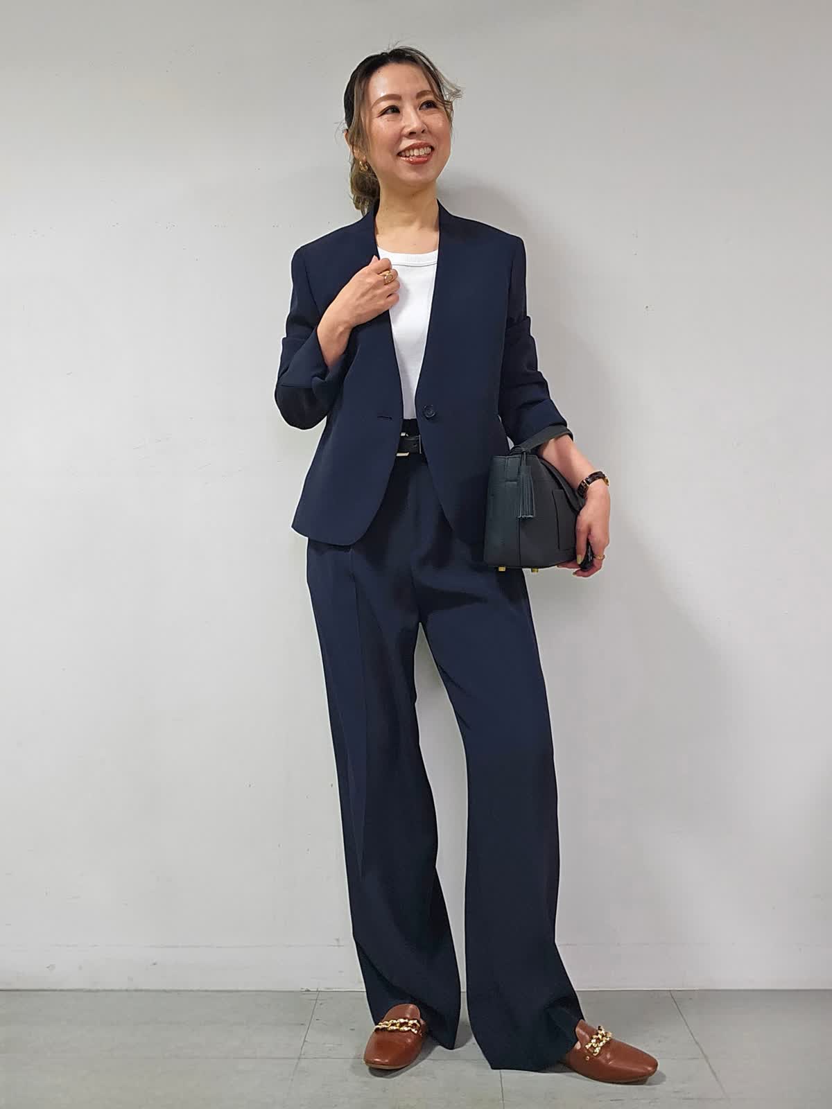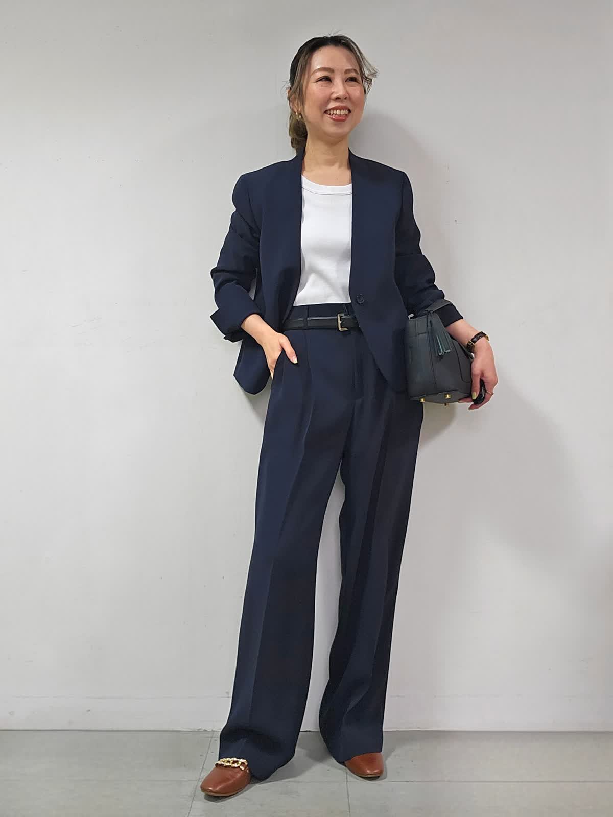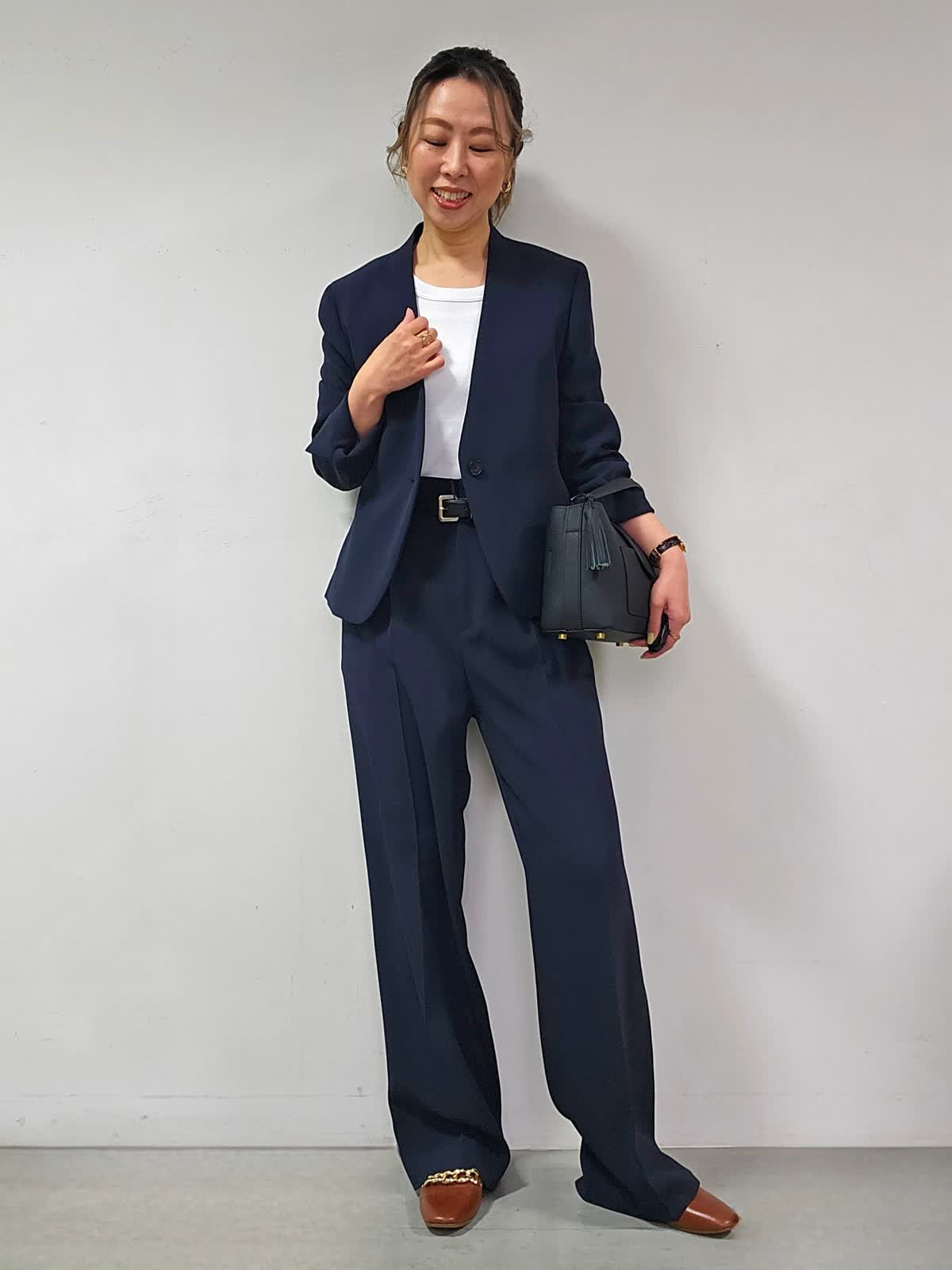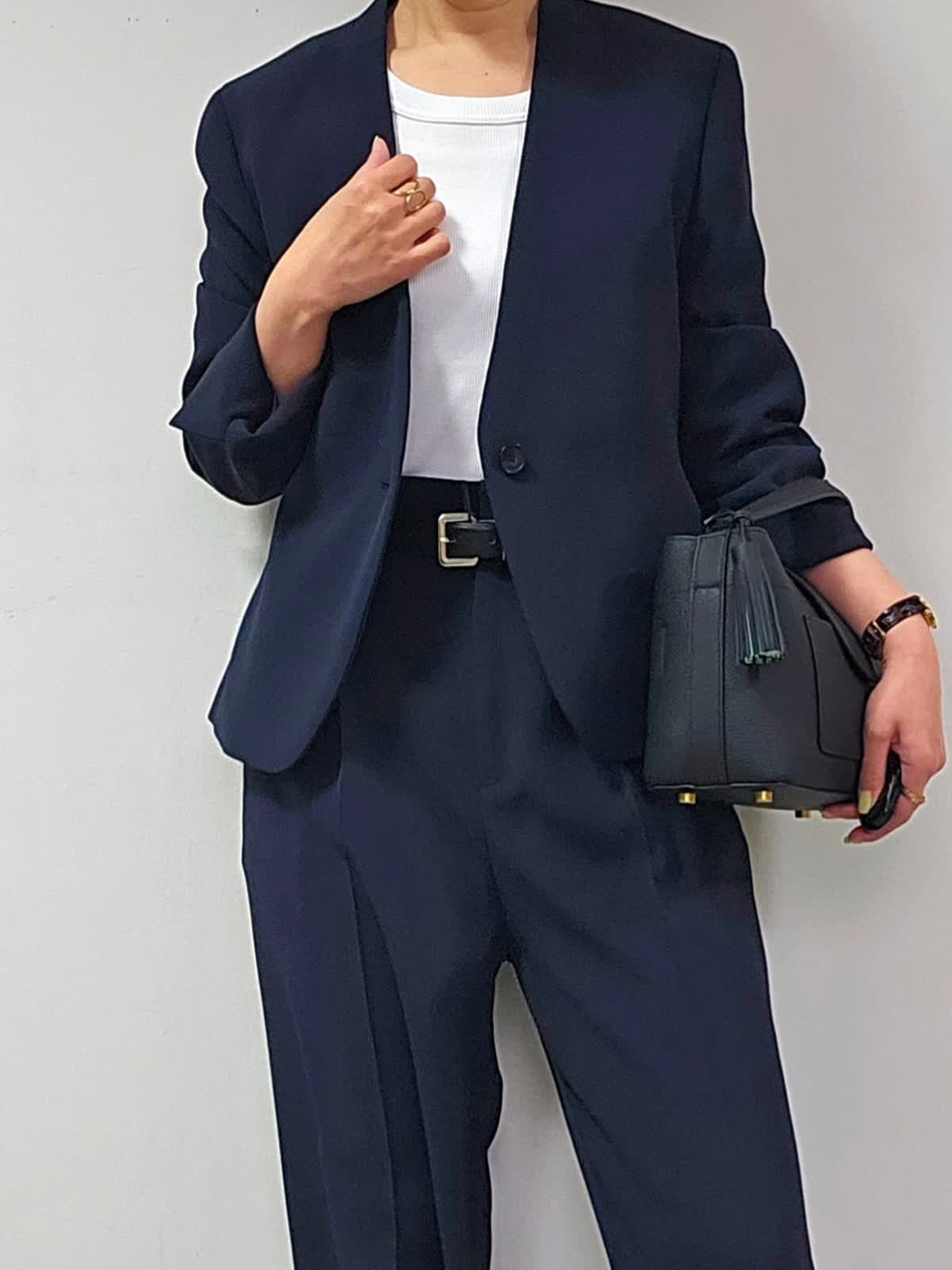 【着用カラー・サイズ】ジャケット:パンツ:ネイビー・7号 カットソー:オフホワイト・9号 バッグ:ベルト:ブラック 清潔さ、上品さ、真面目さ、きちんとシーンにほしいすべてを着るだけで叶えてくれるネイビースーツ。 トレンド感やこなれ感ある着こなしで遊び心がほしいときは、小物で調整すると、いつもの通勤コーデがアップデートしますよ!