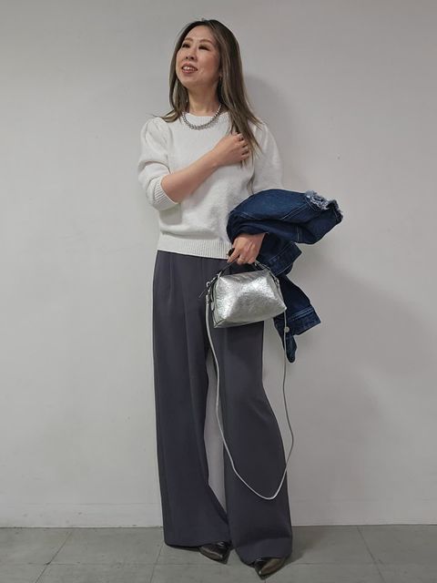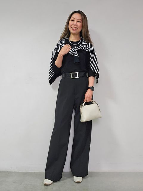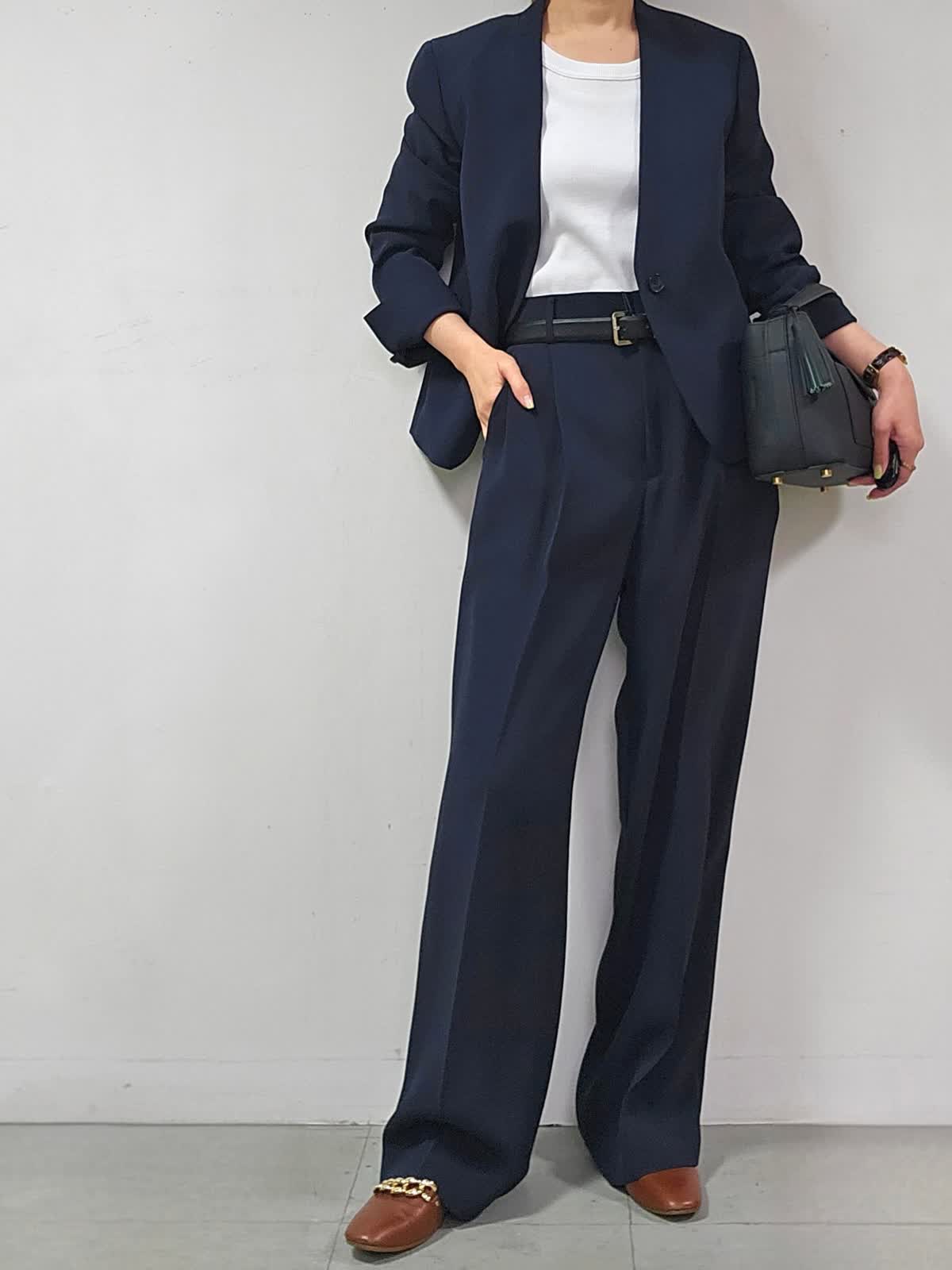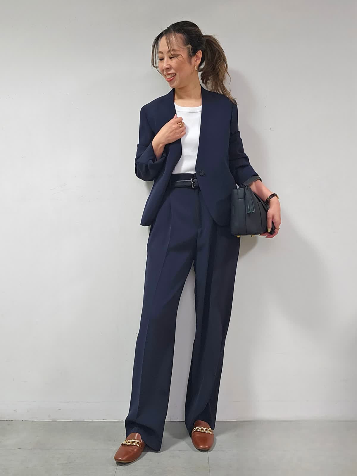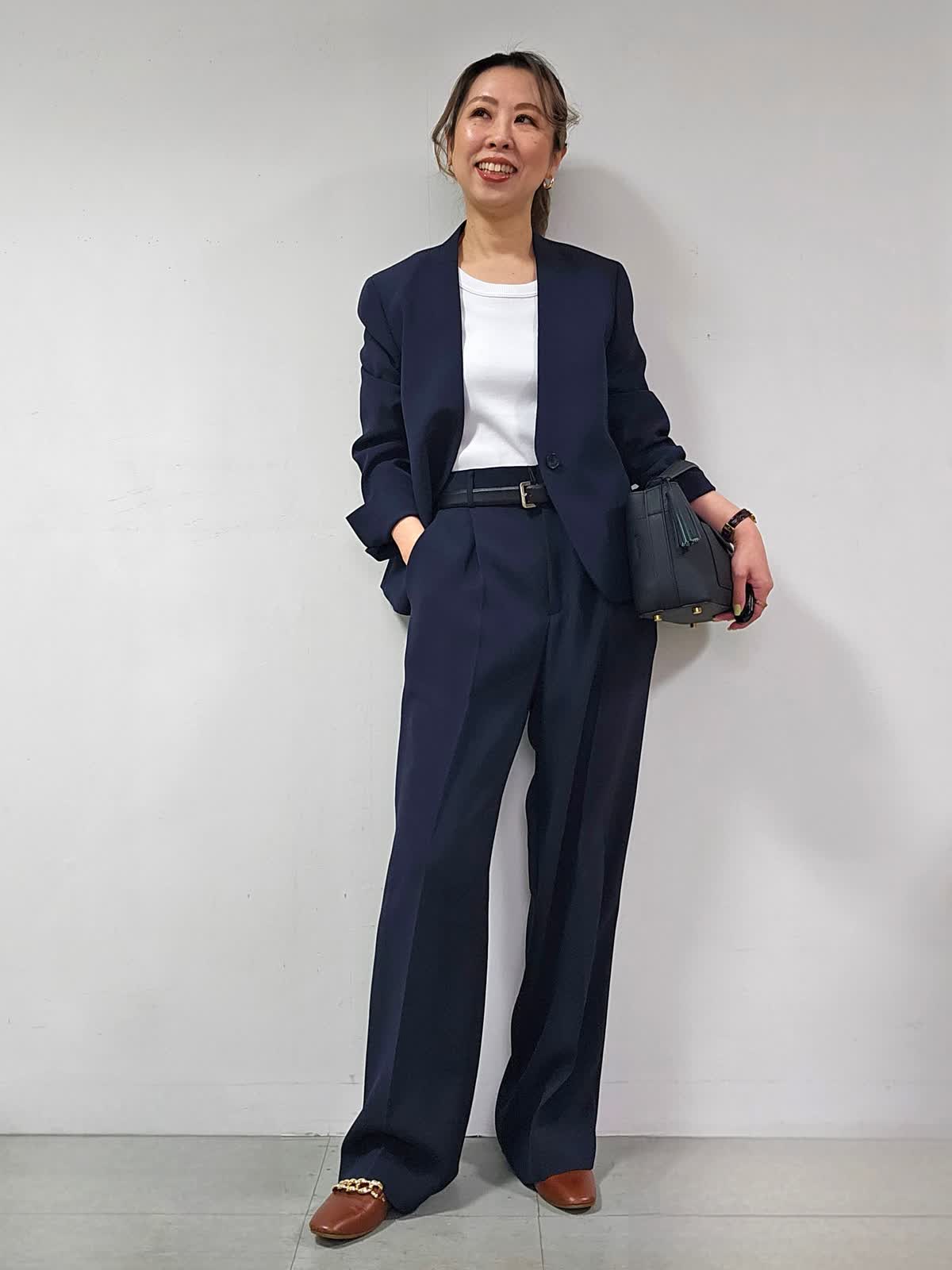 【着用カラー・サイズ】ジャケット:パンツ:ネイビー・7号 カットソー:オフホワイト・9号 バッグ:ベルト:ブラック 清潔さ、上品さ、真面目さ、きちんとシーンにほしいすべてを着るだけで叶えてくれるネイビースーツ。 トレンド感やこなれ感ある着こなしで遊び心がほしいときは、小物で調整すると、いつもの通勤コーデがアップデートしますよ!