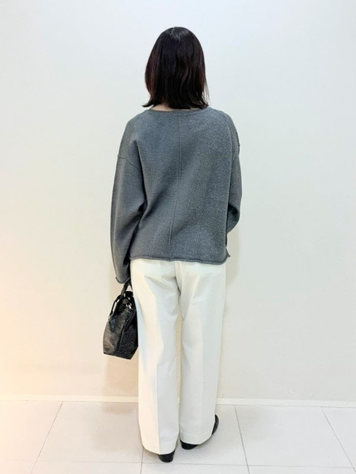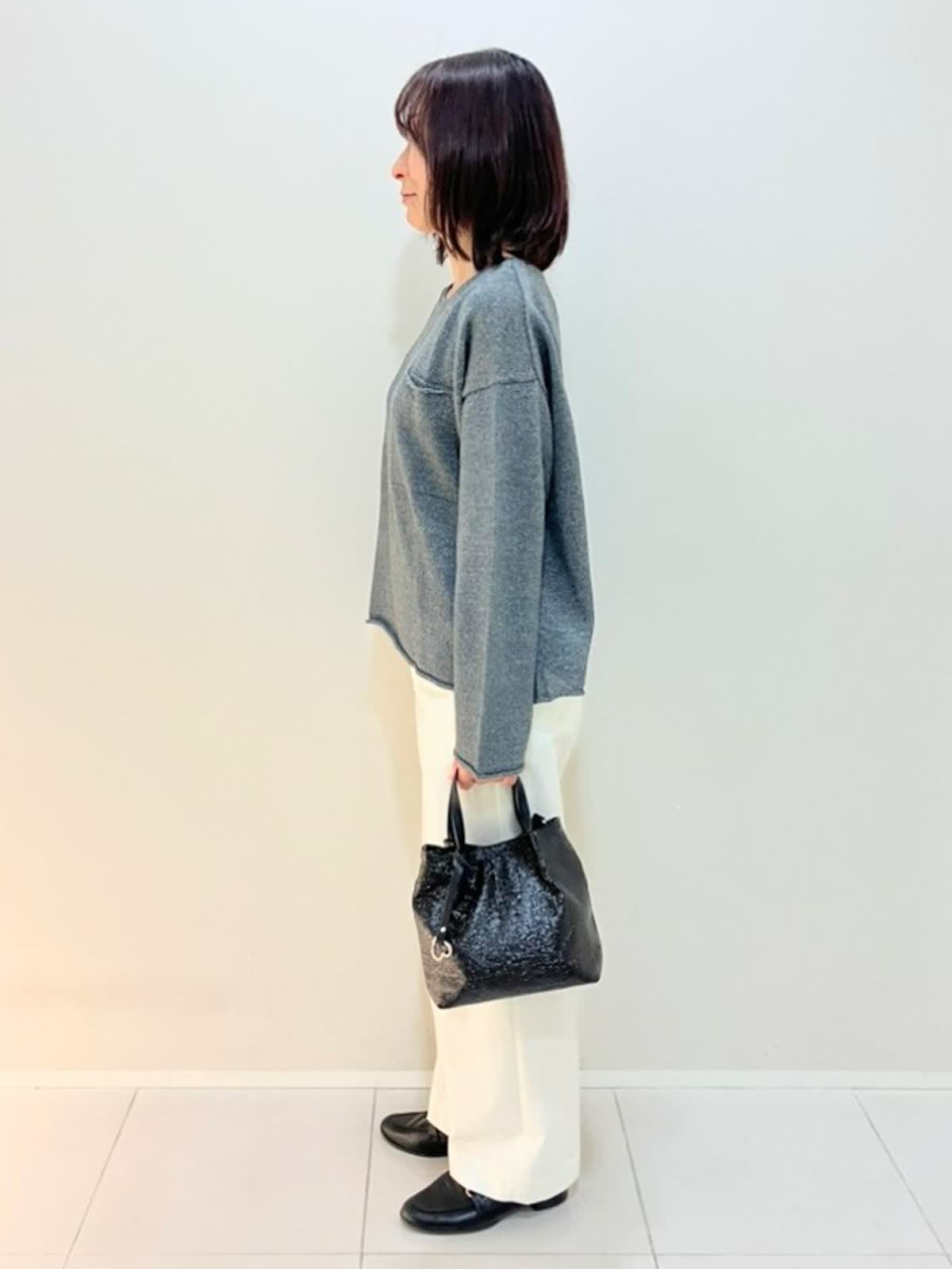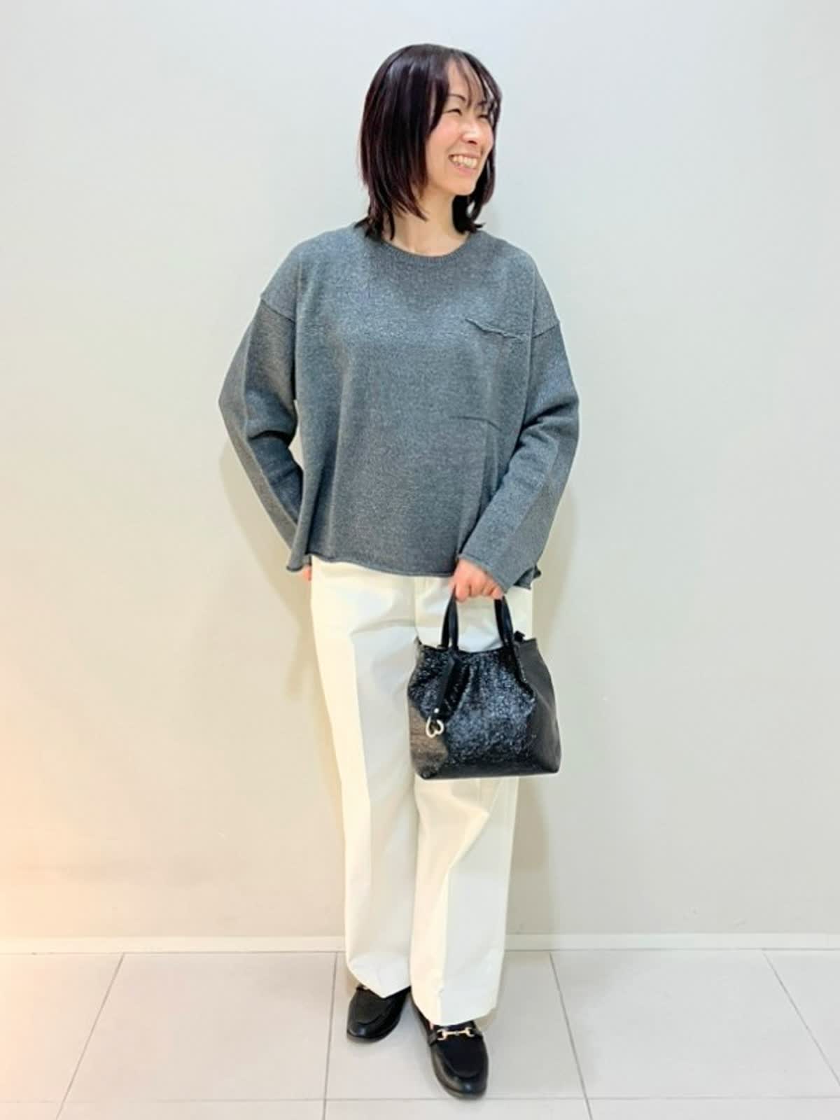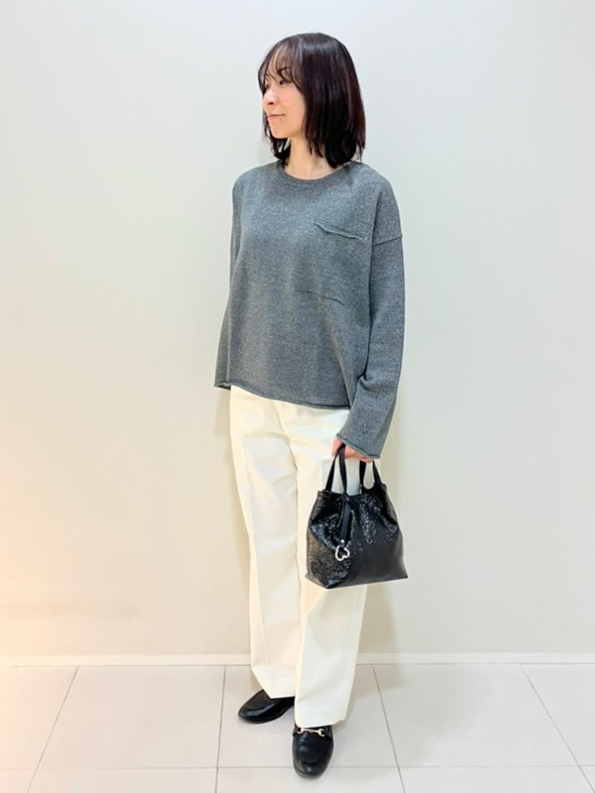 【着用サイズ】ニット:フリー パンツ:7号【着用カラー】ニット:ミディアムグレー パンツ:オフホワイト 春のおでかけスタイル ゆったりデザインのニットは、サラッとした肌触りでウール入りなので、肌寒い時期から活躍するアイテム。パンツは、スッキリと見えるストーレートデザイン。綿素材なので適度なハリ感があり、かっこいい印象になります。