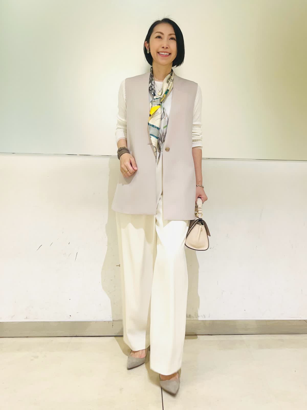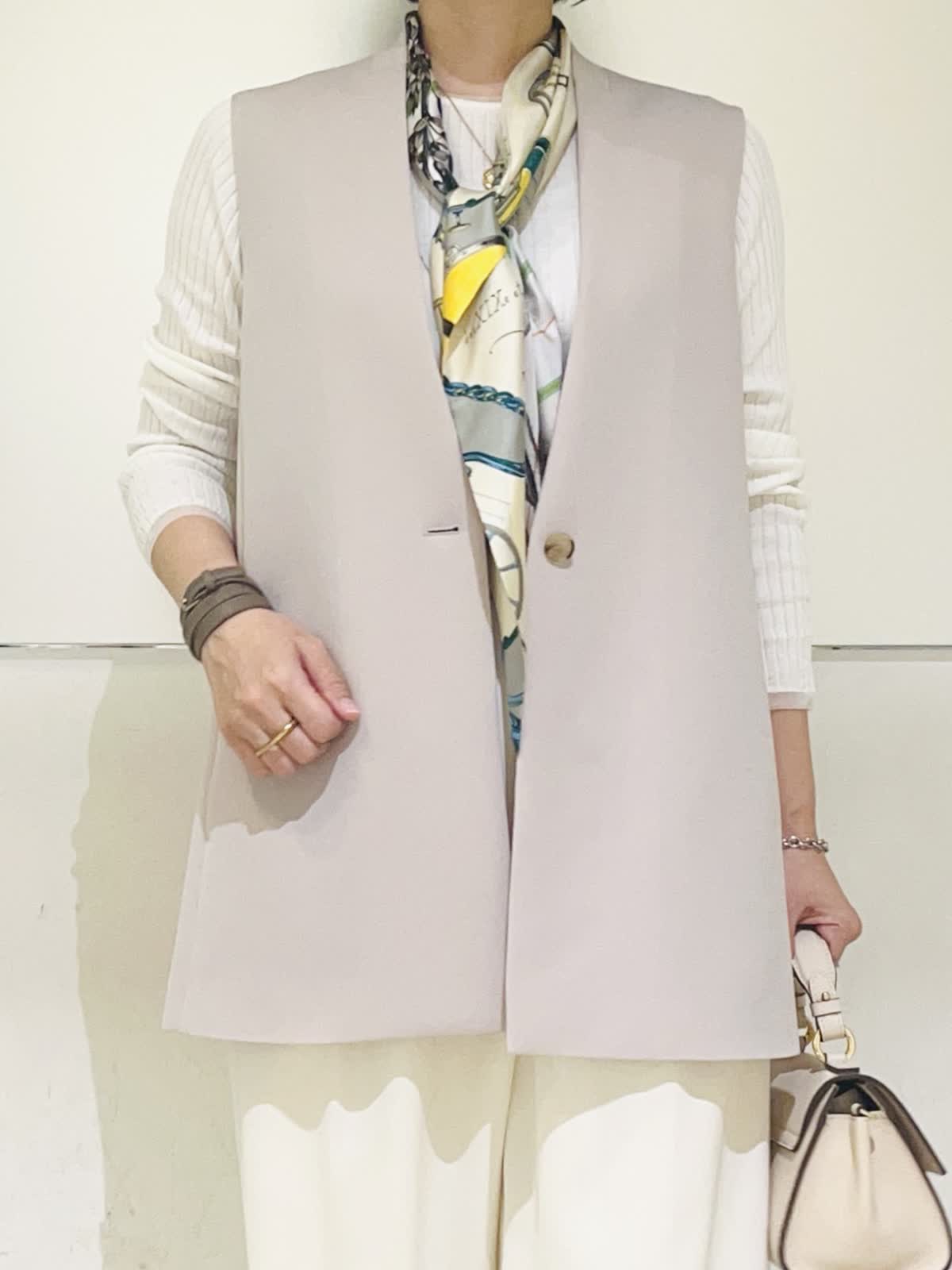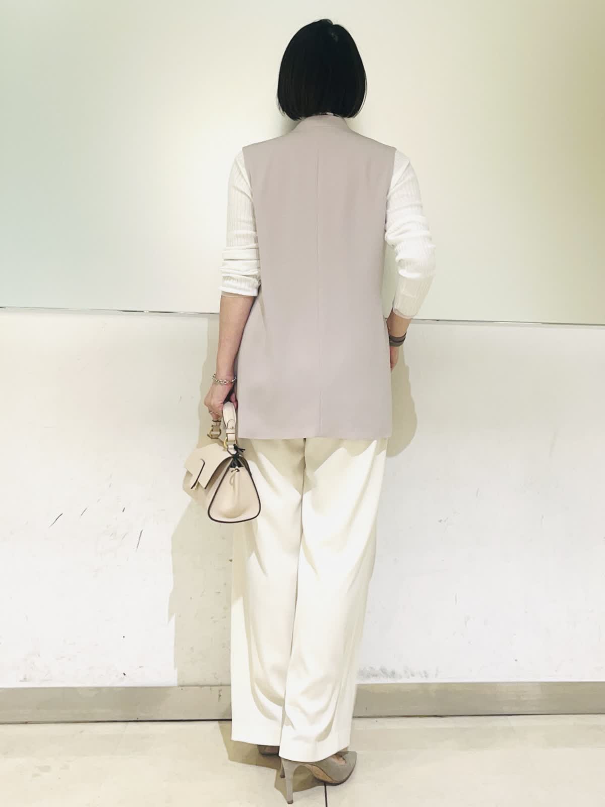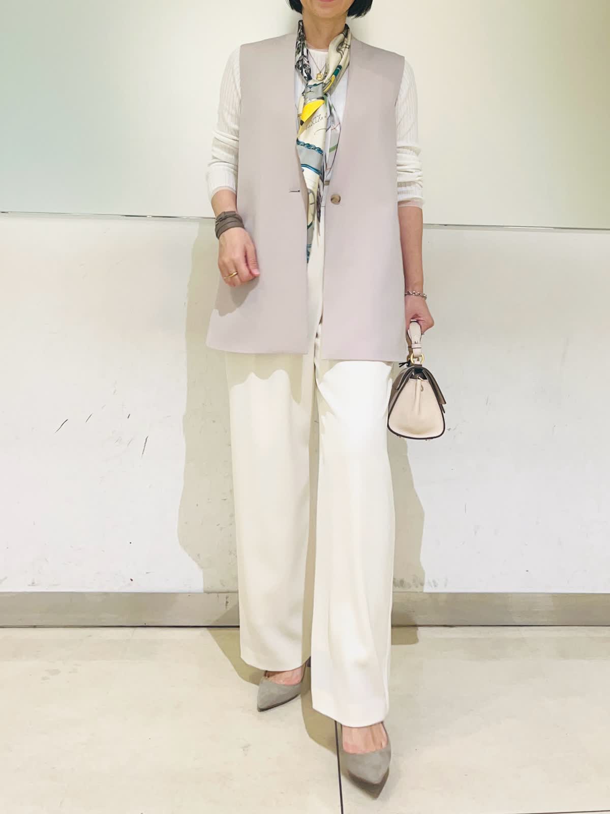 【着用アイテム】すべて9号 【着用カラー】ジレ:グレーベージュ パンツ:オフホワイト 春のきれい目コーディネート。グレージュ×ホワイトの品のある組み合わせ。ジレはきちんと感がありながらおしゃれな雰囲気も楽しめる優秀アイテムです。お仕事からお食事会まで、大人のきれい目スタイリングが楽しめます。