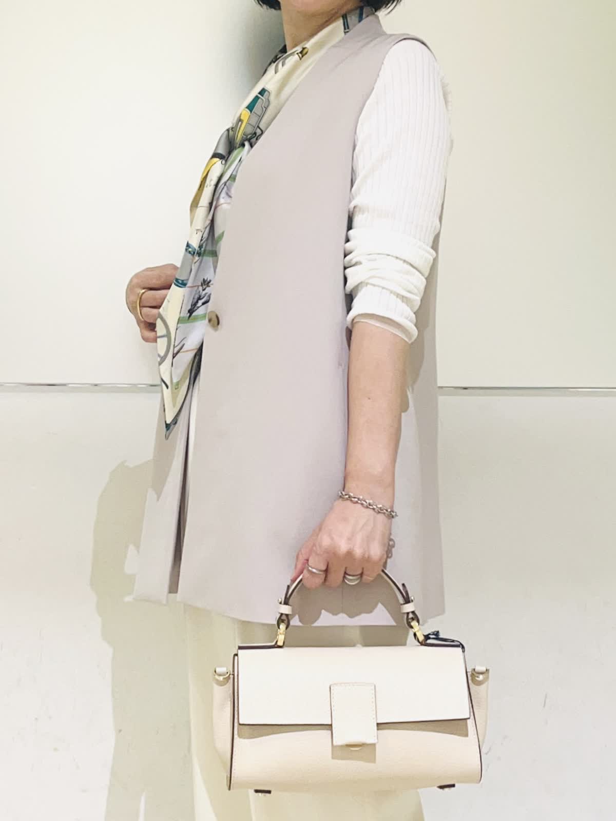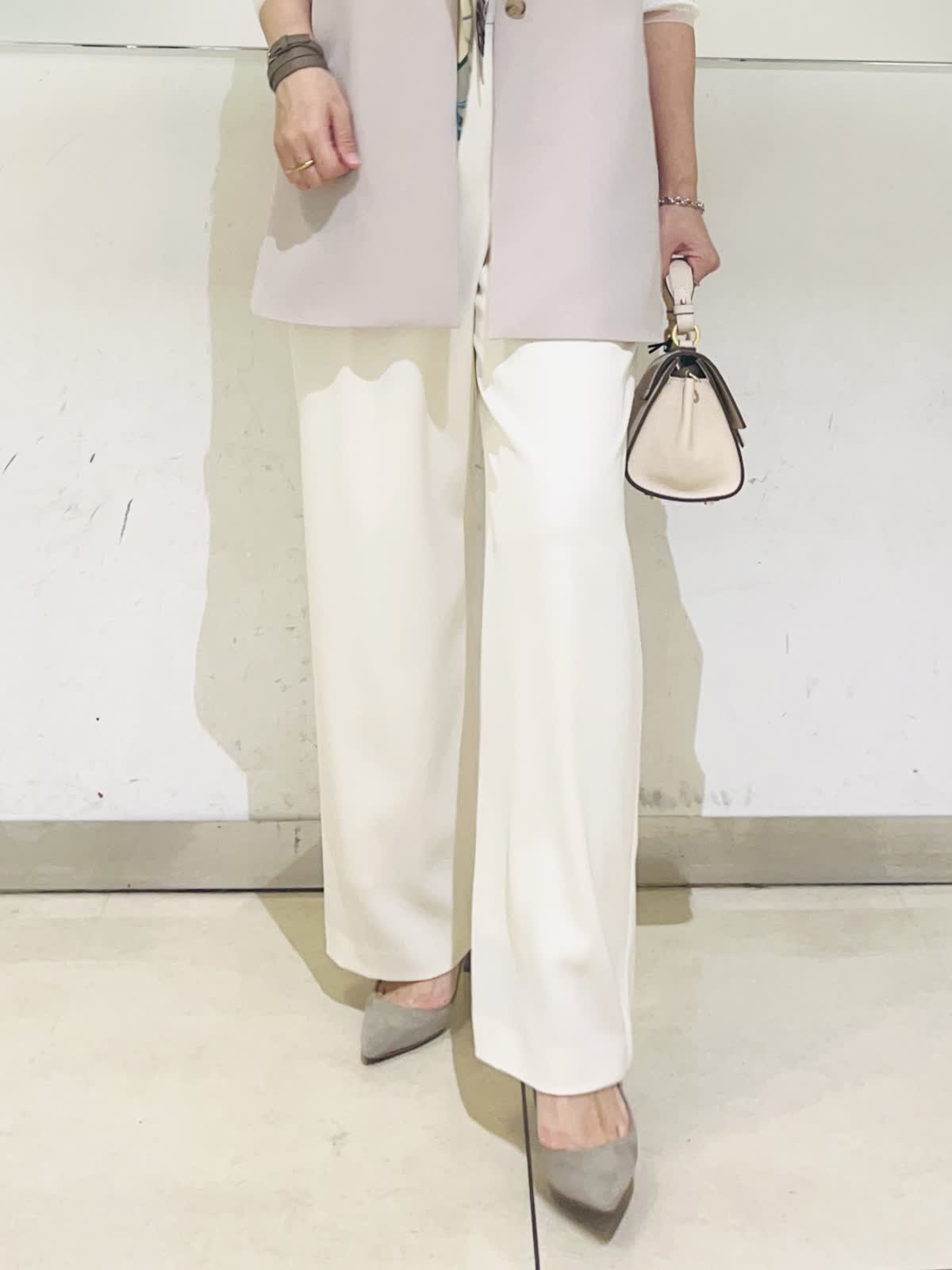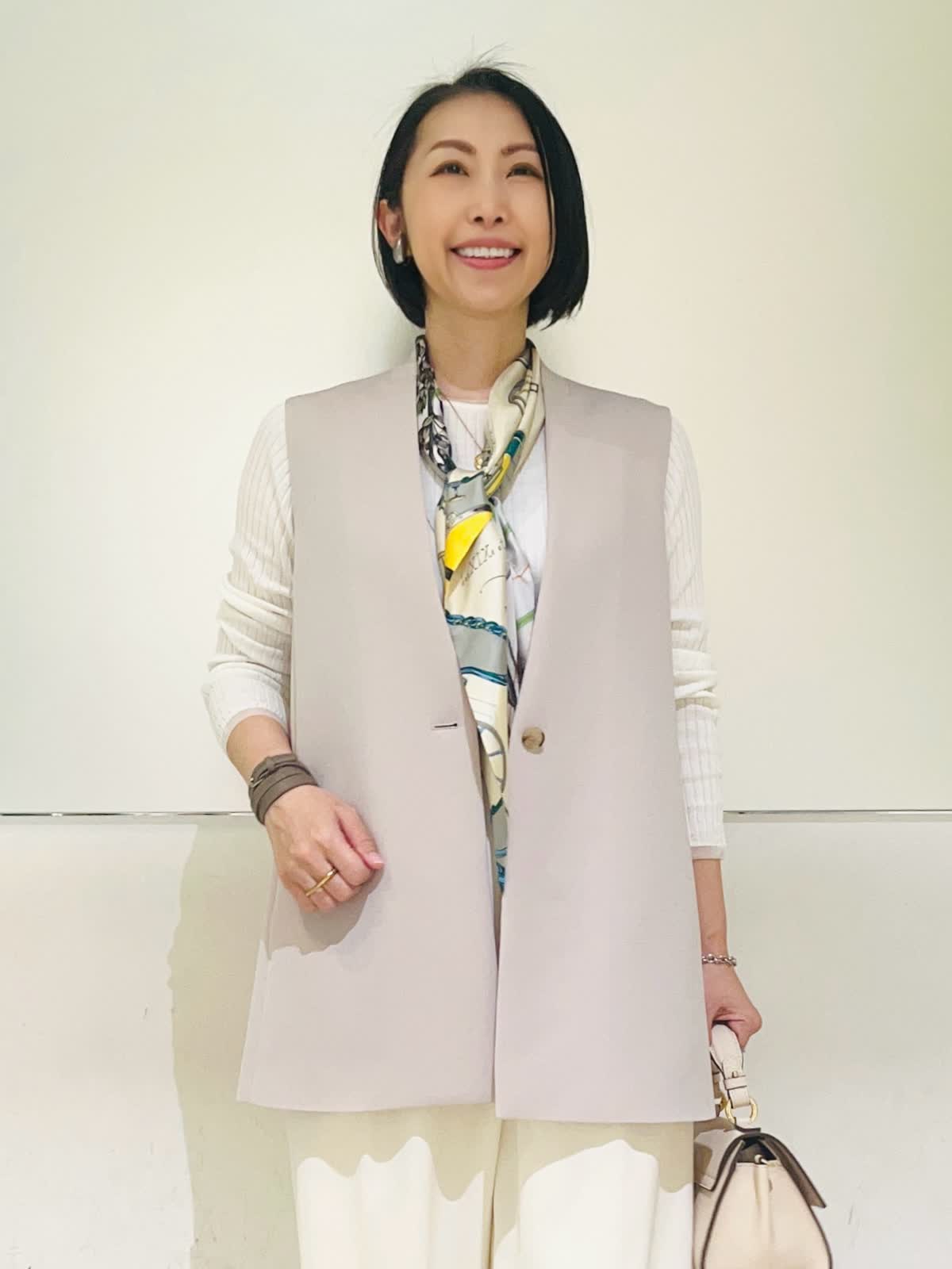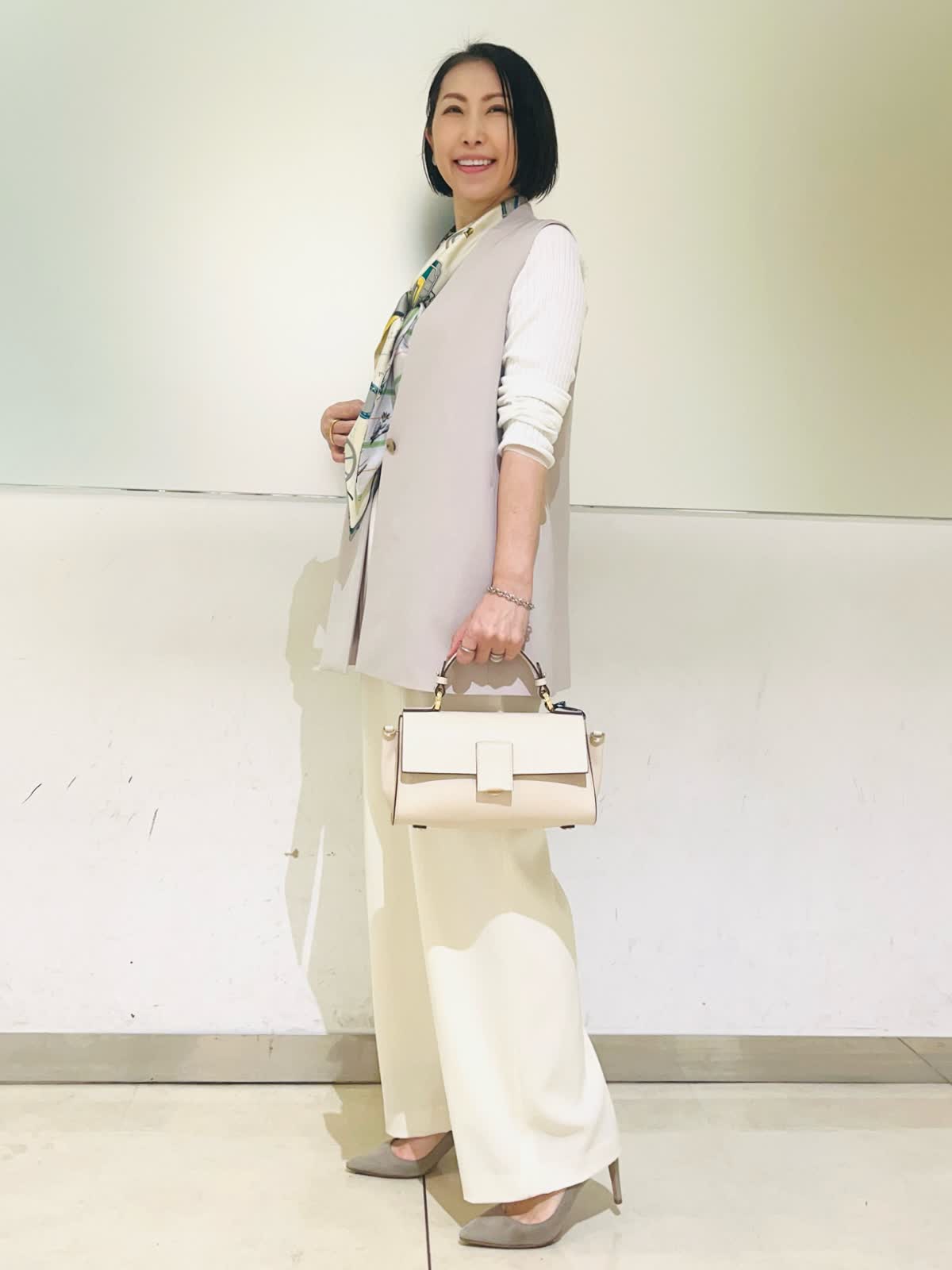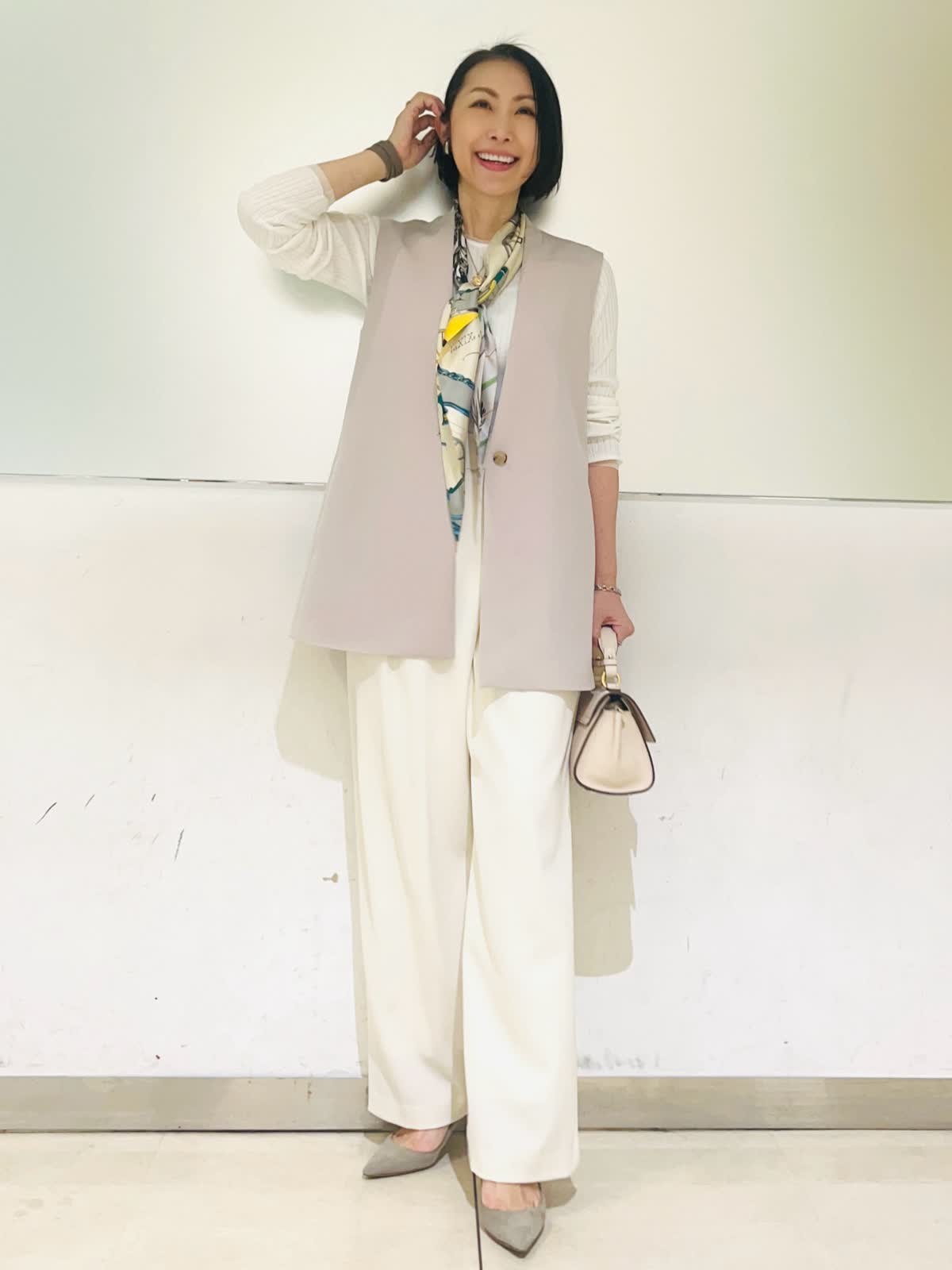 【着用アイテム】すべて9号 【着用カラー】ジレ:グレーベージュ パンツ:オフホワイト 春のきれい目コーディネート。グレージュ×ホワイトの品のある組み合わせ。ジレはきちんと感がありながらおしゃれな雰囲気も楽しめる優秀アイテムです。お仕事からお食事会まで、大人のきれい目スタイリングが楽しめます。
