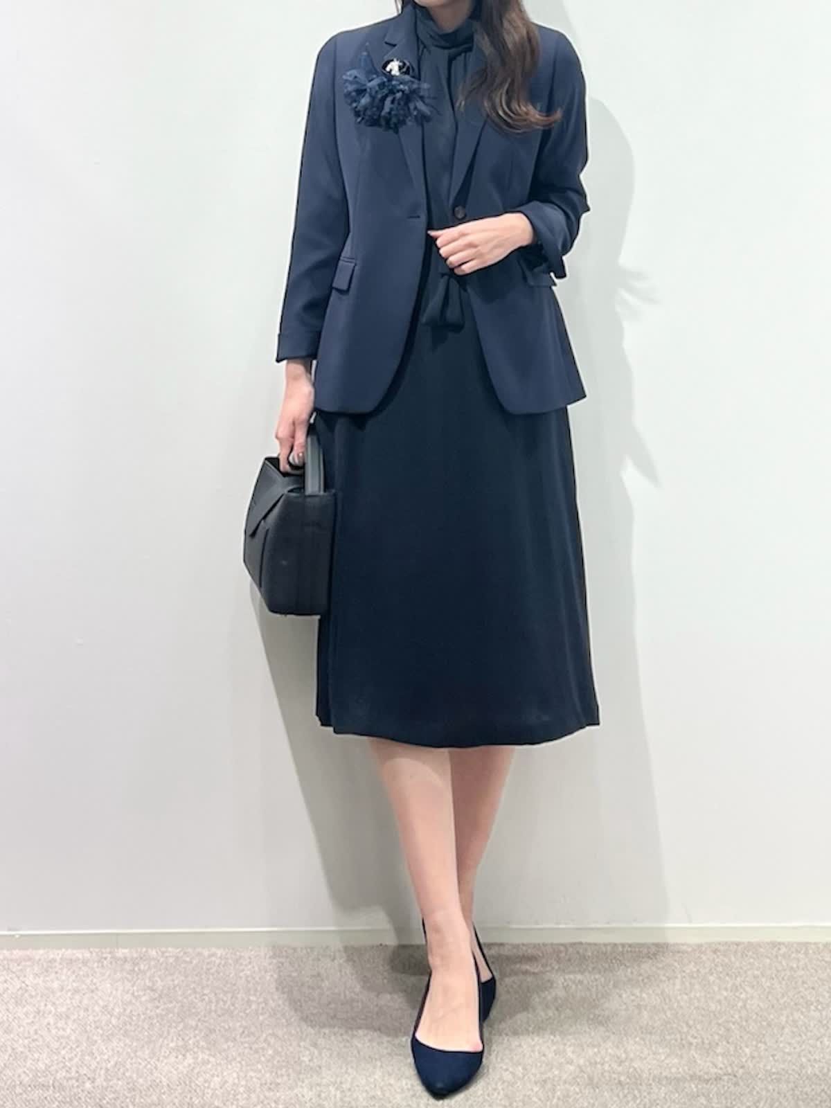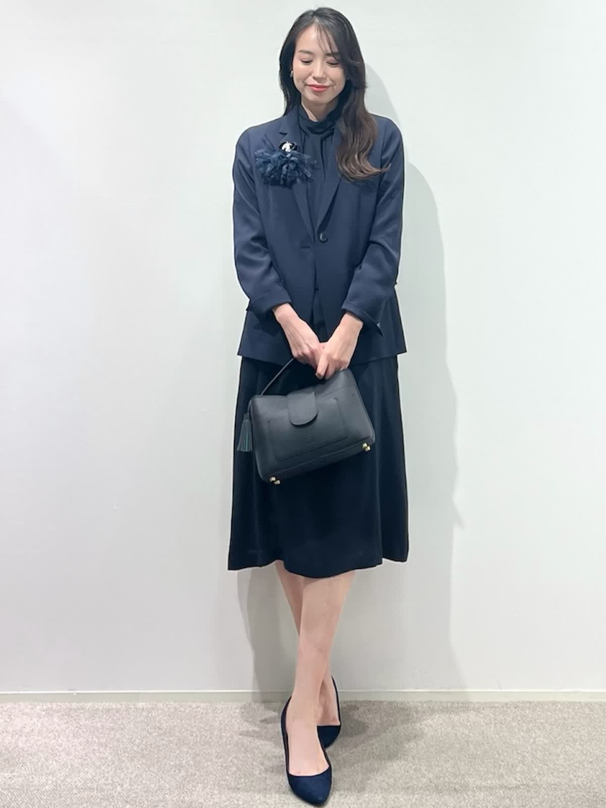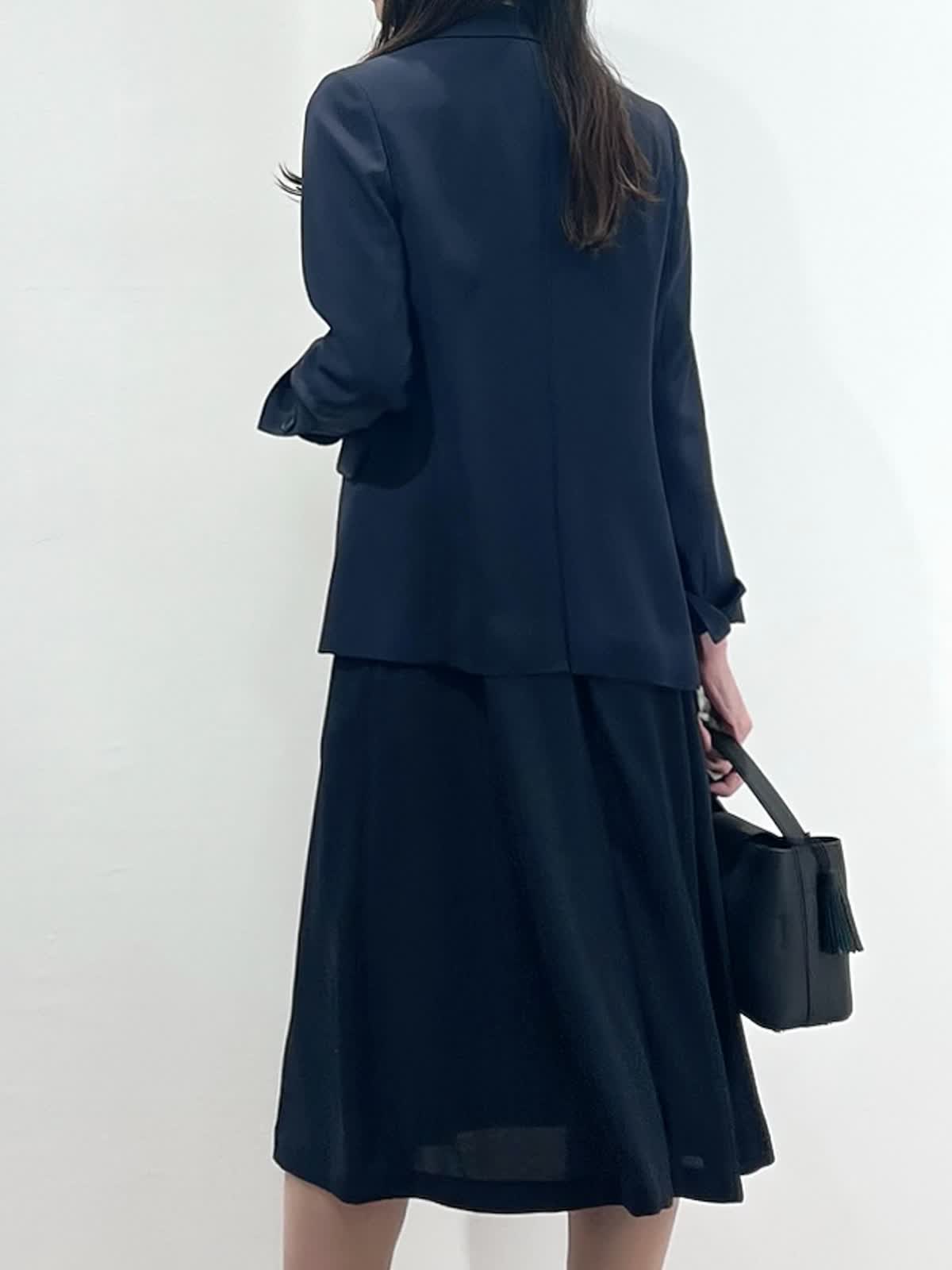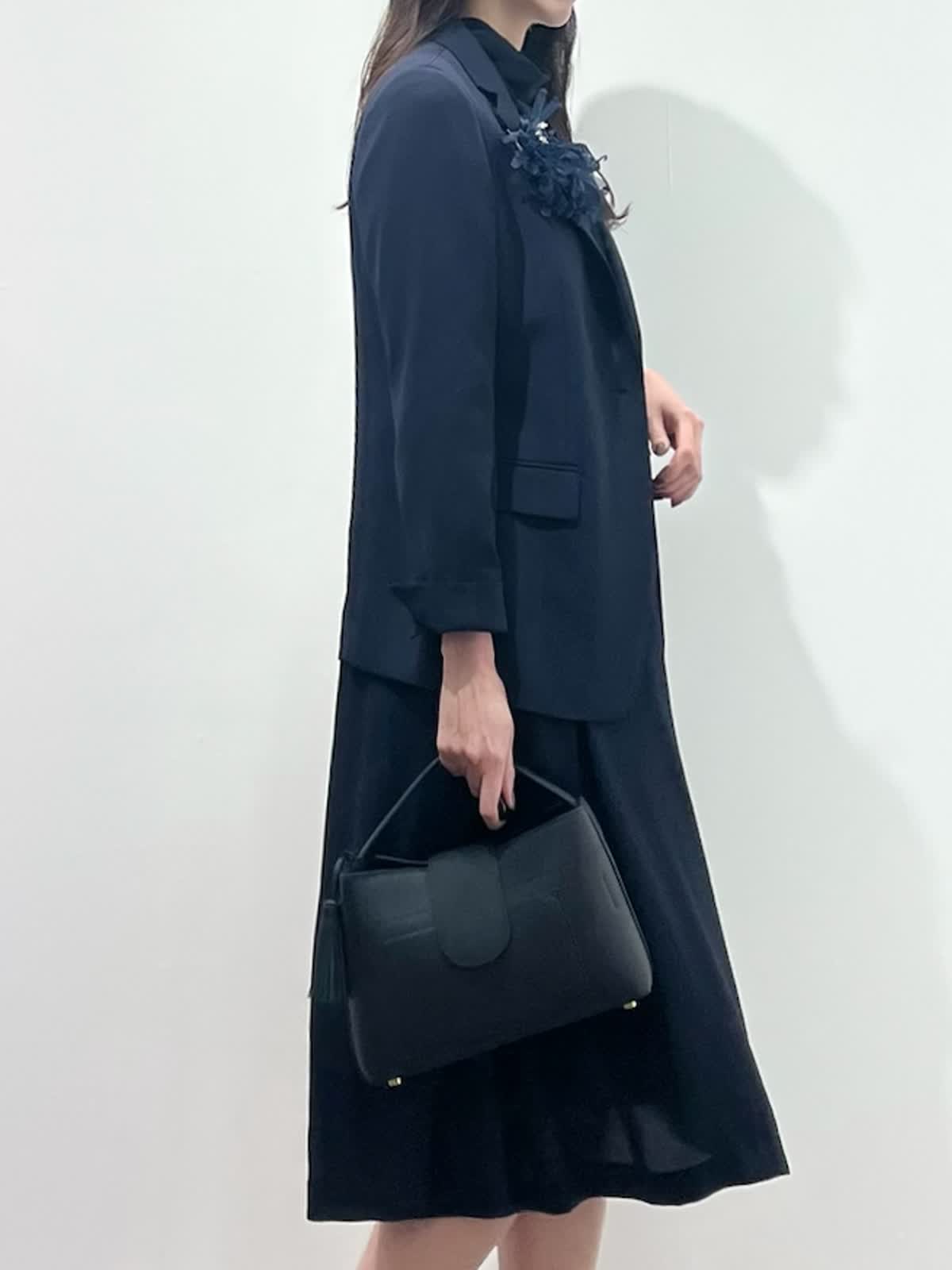 【着用サイズ】ジャケット:11号 ワンピース:9号 【着用カラー】ジャケット:ネイビー ワンピース:ネイビー バッグ:ブラック 「万能セレモニースタイル」 ベーシックなデザインの王道テーラードジャケットと、ボウタイ付きフレアワンピース。 ジャケットは、通年着られてシーズンレスの素材感なので、お仕事やフォーマルにもあると便利で着回し抜群のデザイン。ヒップが隠れる着丈でシャープなシルエットなので、ボトムを選ばず万能です。ワンピースは、ストンと落ち感のあるシルエットがストレスフリーで、首元のボウタイでアレンジ可能。単品でお仕事にも活躍しやすいアイテムの、おすすめセレモニースタイルです。