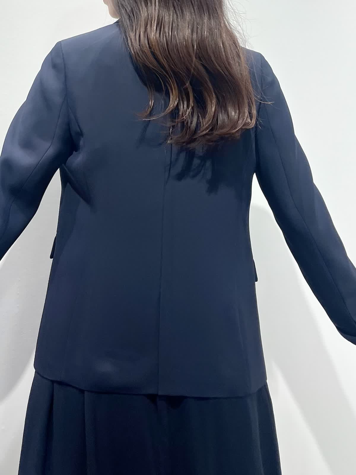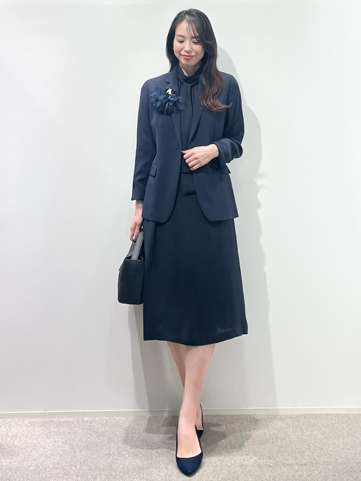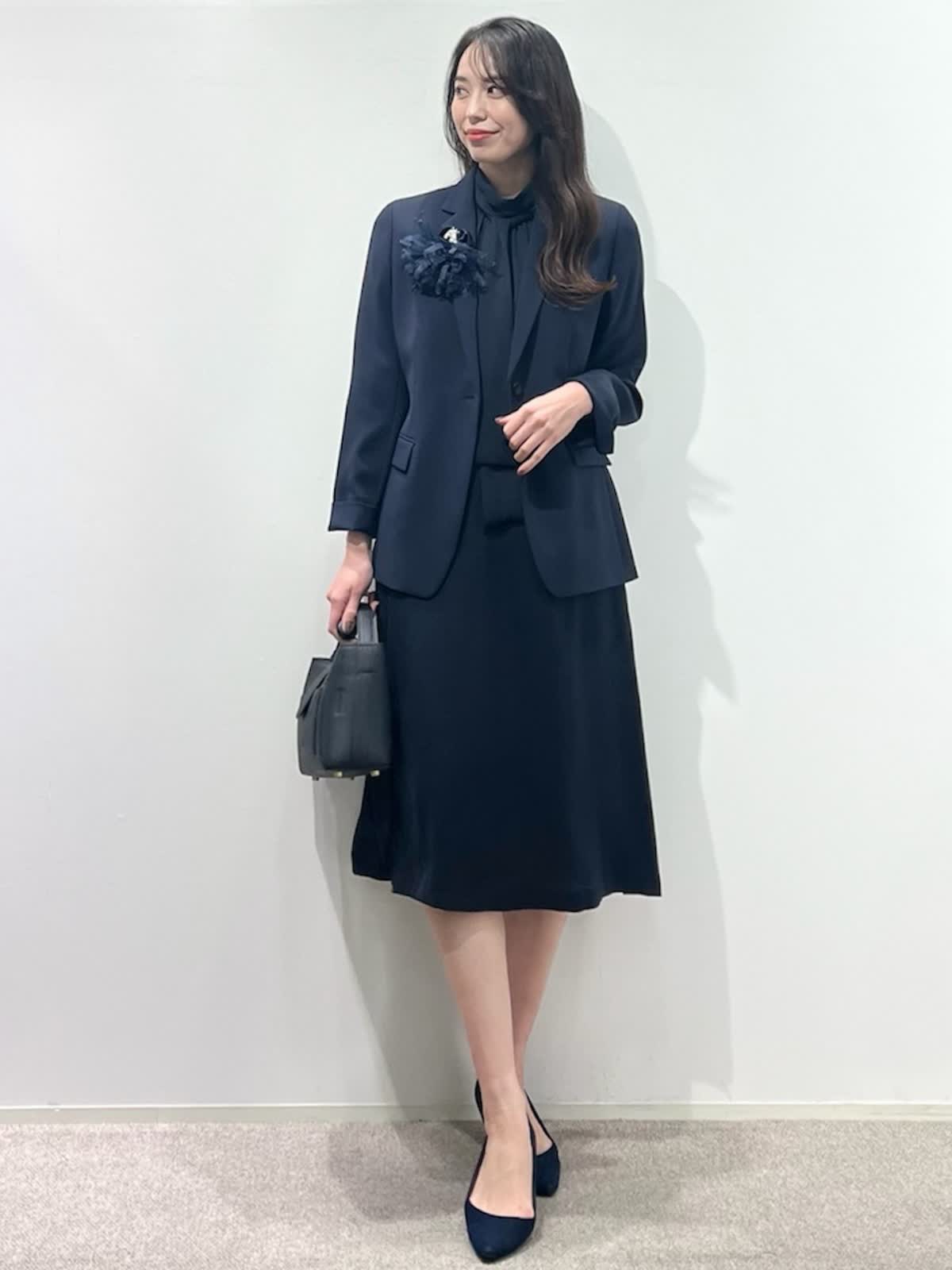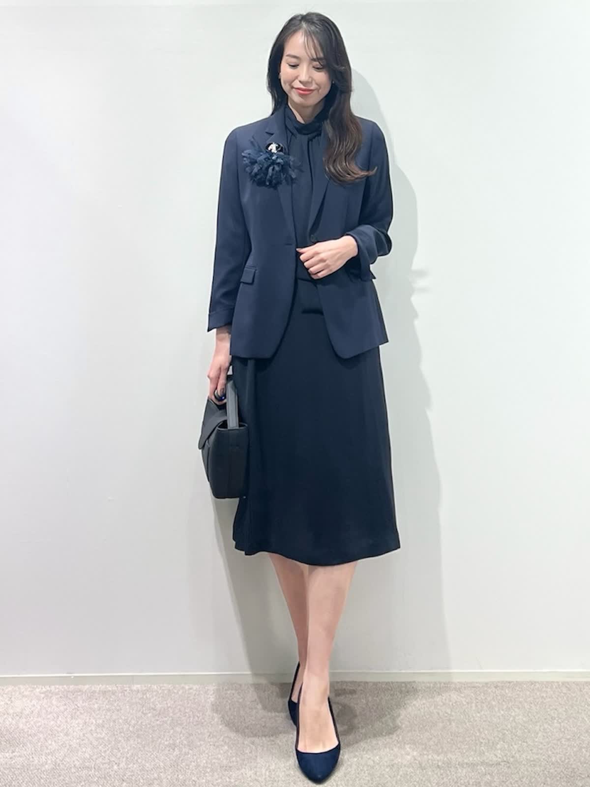 【着用サイズ】ジャケット:11号 ワンピース:9号 【着用カラー】ジャケット:ネイビー ワンピース:ネイビー バッグ:ブラック 「万能セレモニースタイル」 ベーシックなデザインの王道テーラードジャケットと、ボウタイ付きフレアワンピース。 ジャケットは、通年着られてシーズンレスの素材感なので、お仕事やフォーマルにもあると便利で着回し抜群のデザイン。ヒップが隠れる着丈でシャープなシルエットなので、ボトムを選ばず万能です。ワンピースは、ストンと落ち感のあるシルエットがストレスフリーで、首元のボウタイでアレンジ可能。単品でお仕事にも活躍しやすいアイテムの、おすすめセレモニースタイルです。