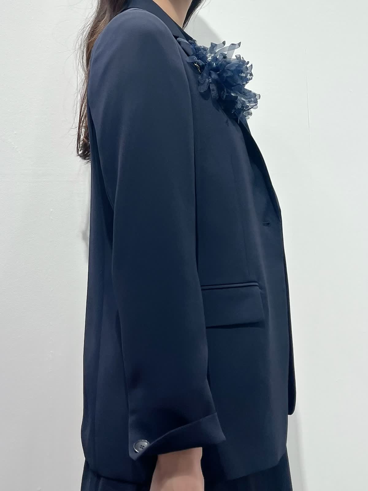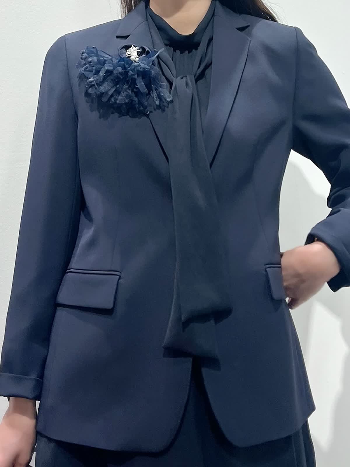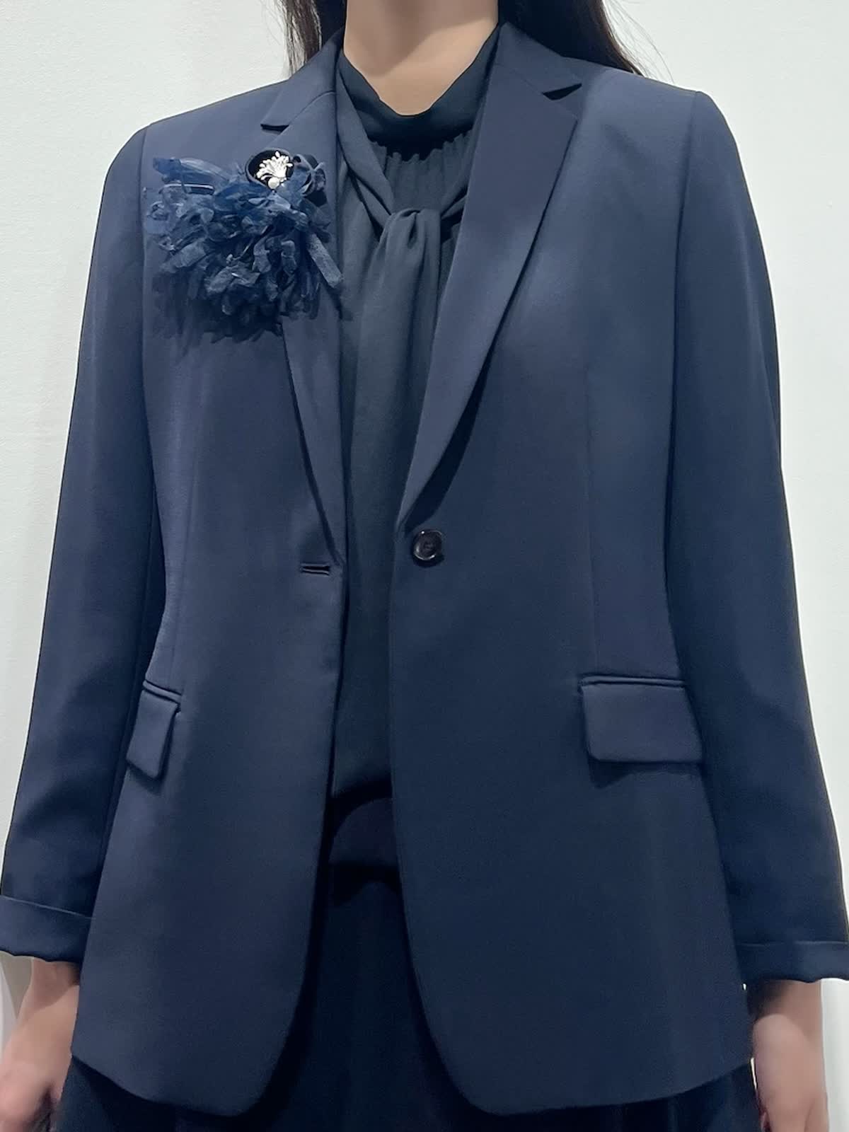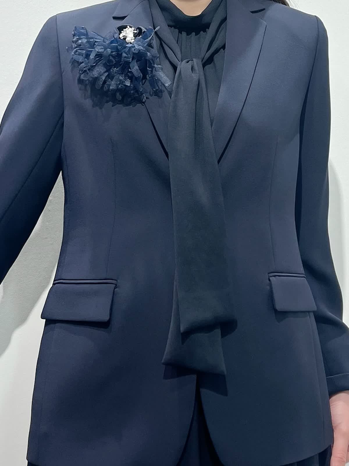 【着用サイズ】ジャケット:11号 ワンピース:9号 【着用カラー】ジャケット:ネイビー ワンピース:ネイビー バッグ:ブラック 「万能セレモニースタイル」 ベーシックなデザインの王道テーラードジャケットと、ボウタイ付きフレアワンピース。 ジャケットは、通年着られてシーズンレスの素材感なので、お仕事やフォーマルにもあると便利で着回し抜群のデザイン。ヒップが隠れる着丈でシャープなシルエットなので、ボトムを選ばず万能です。ワンピースは、ストンと落ち感のあるシルエットがストレスフリーで、首元のボウタイでアレンジ可能。単品でお仕事にも活躍しやすいアイテムの、おすすめセレモニースタイルです。