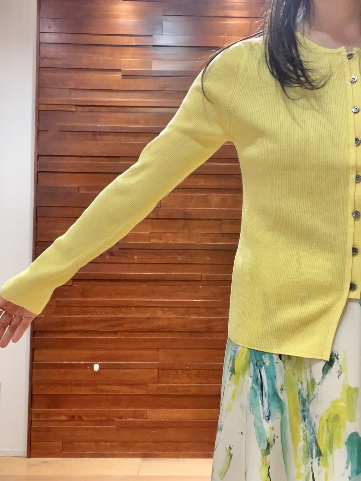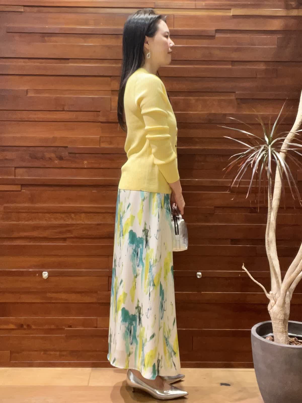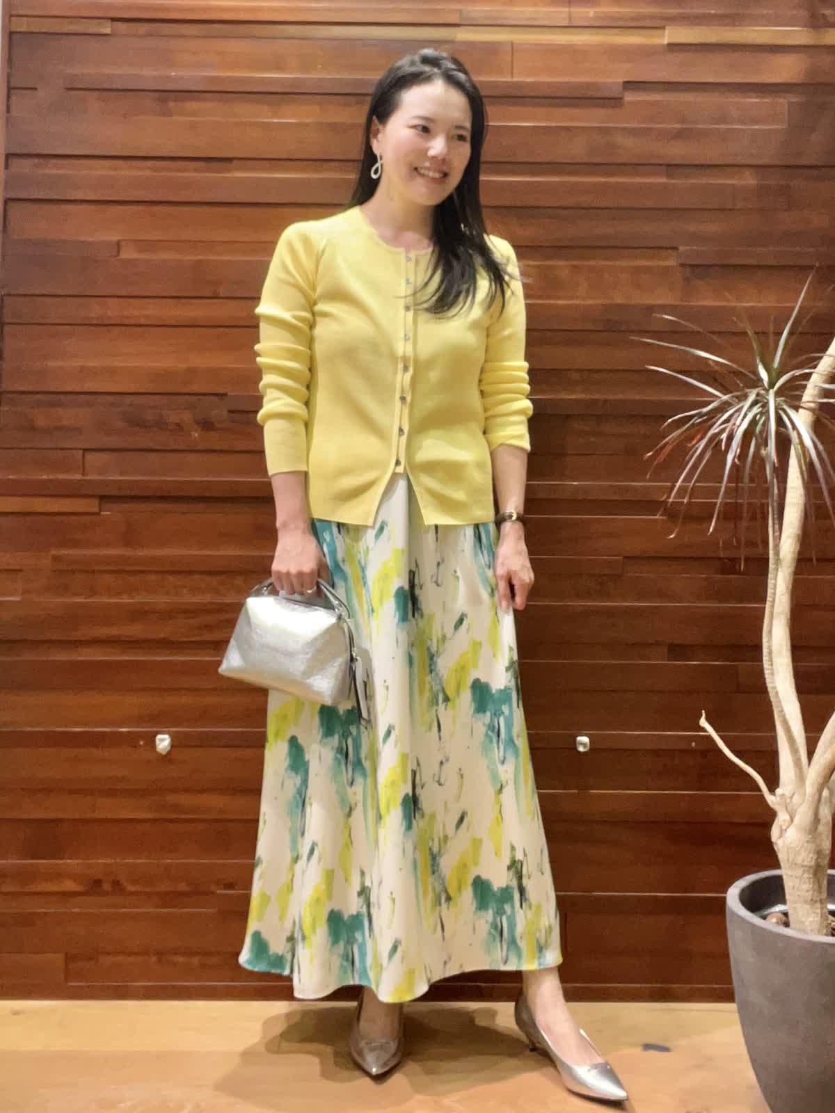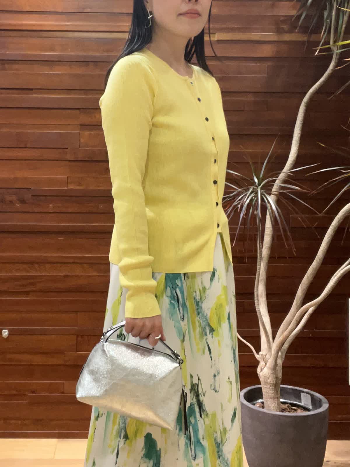 【着用サイズ/カラー】 カーディガン:9号 イエロー スカート:9号 ペパーミント バッグ:シルバー パッと華やかなイエローのカーディガン。リブで柔らかく伸びがいいので、張り付く感じが無く着やすいです。スカートはウエストゴム仕様で、見た目はエレガントでも履き心地は楽なので、デイリー使いにおすすめです。