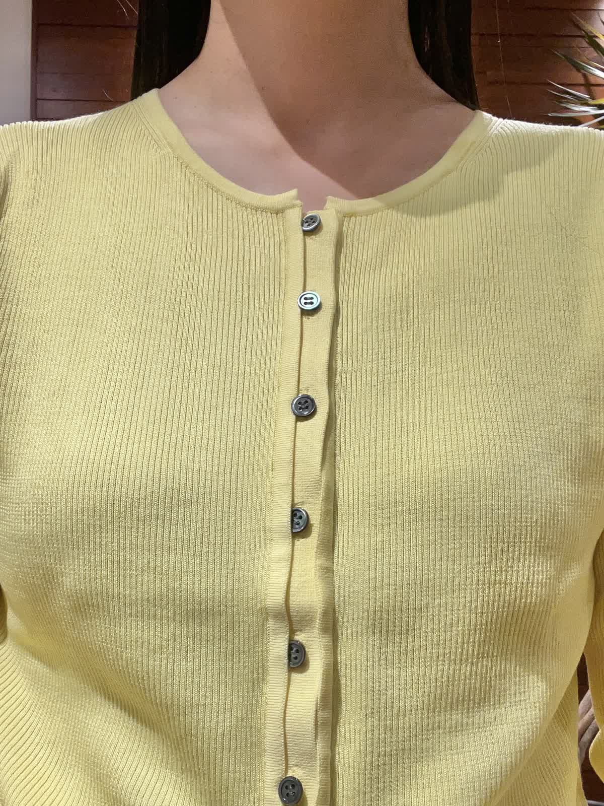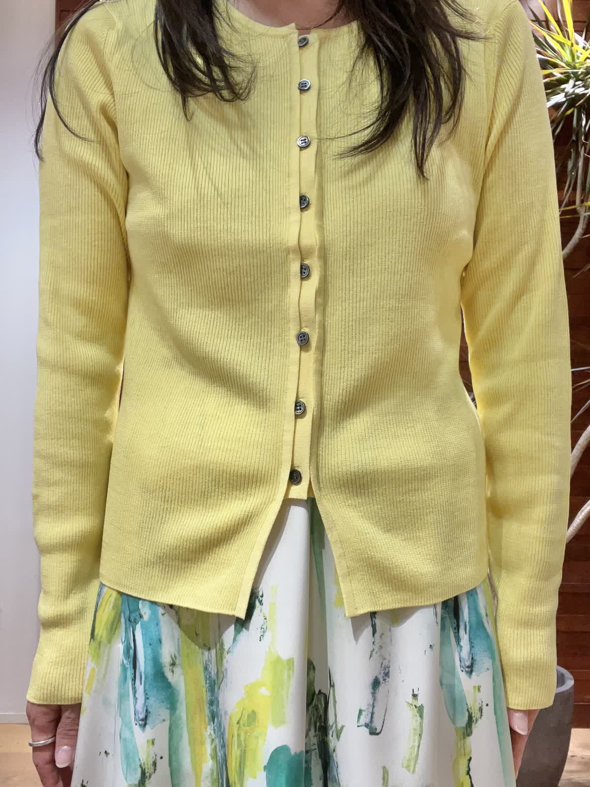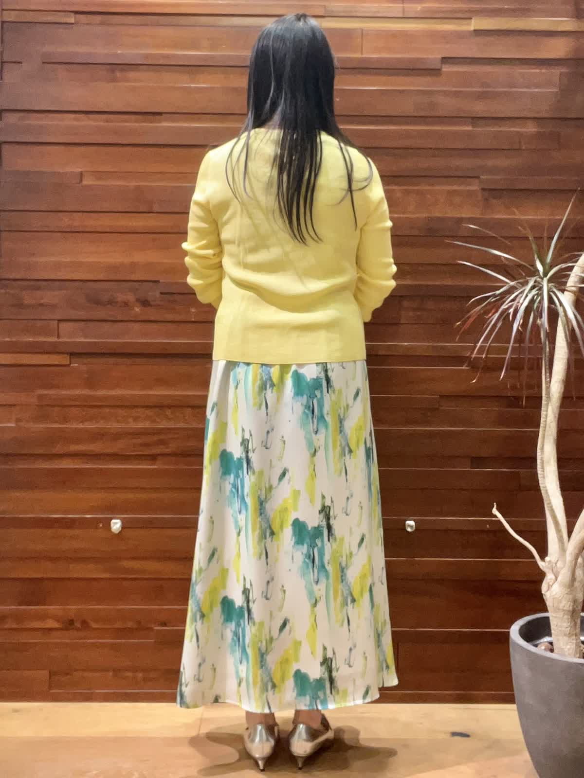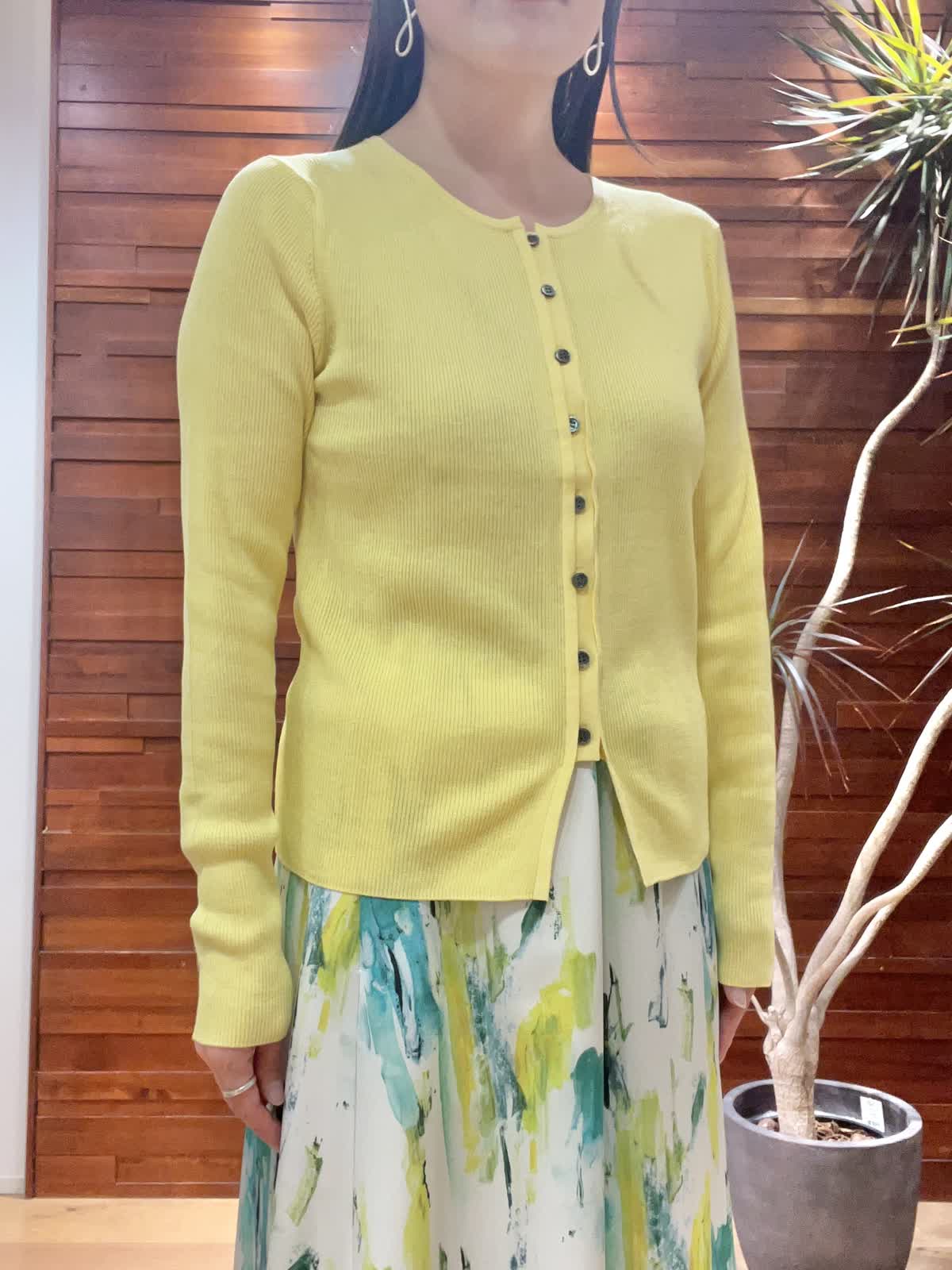 【着用サイズ/カラー】 カーディガン:9号 イエロー スカート:9号 ペパーミント バッグ:シルバー パッと華やかなイエローのカーディガン。リブで柔らかく伸びがいいので、張り付く感じが無く着やすいです。スカートはウエストゴム仕様で、見た目はエレガントでも履き心地は楽なので、デイリー使いにおすすめです。