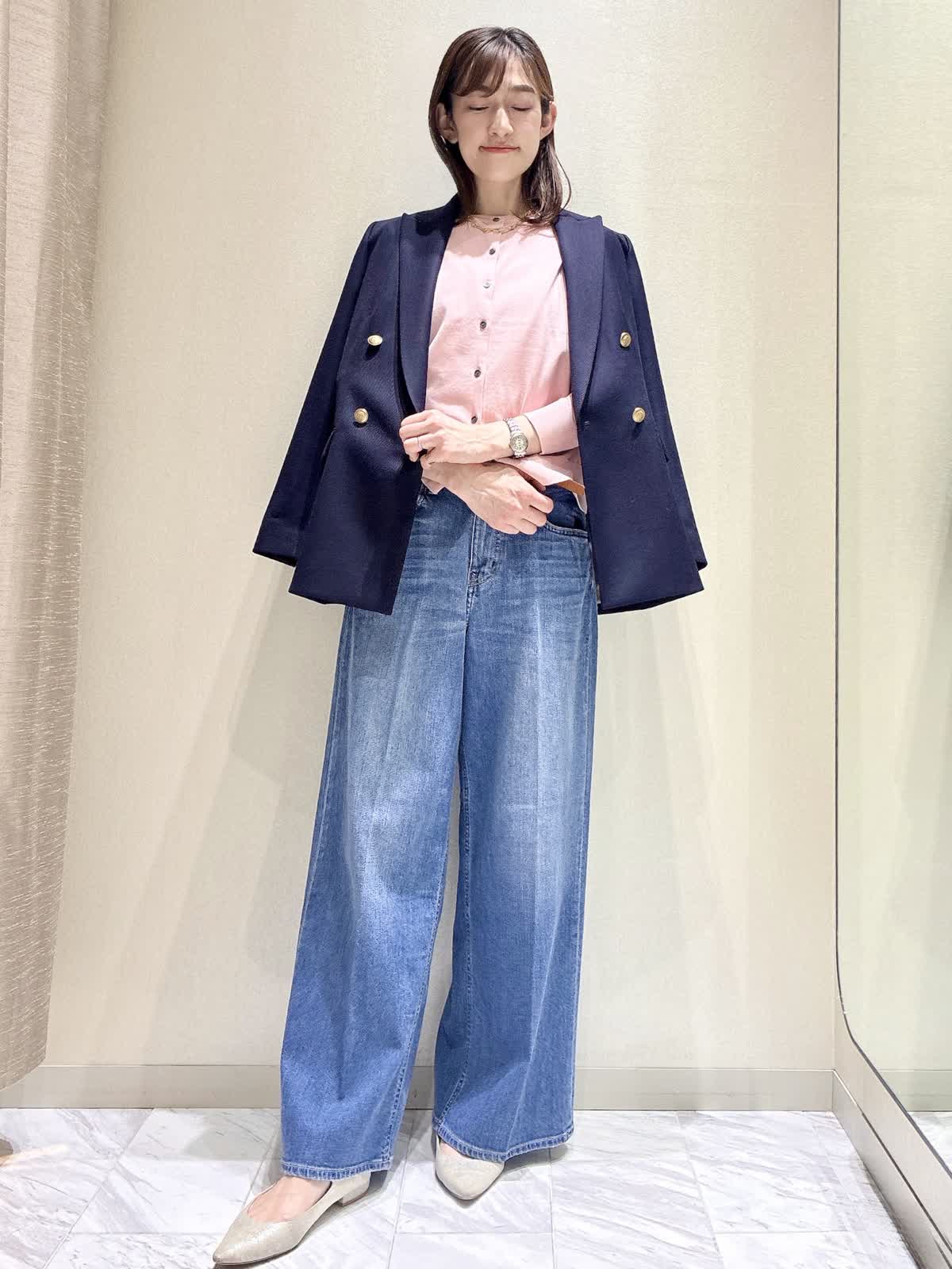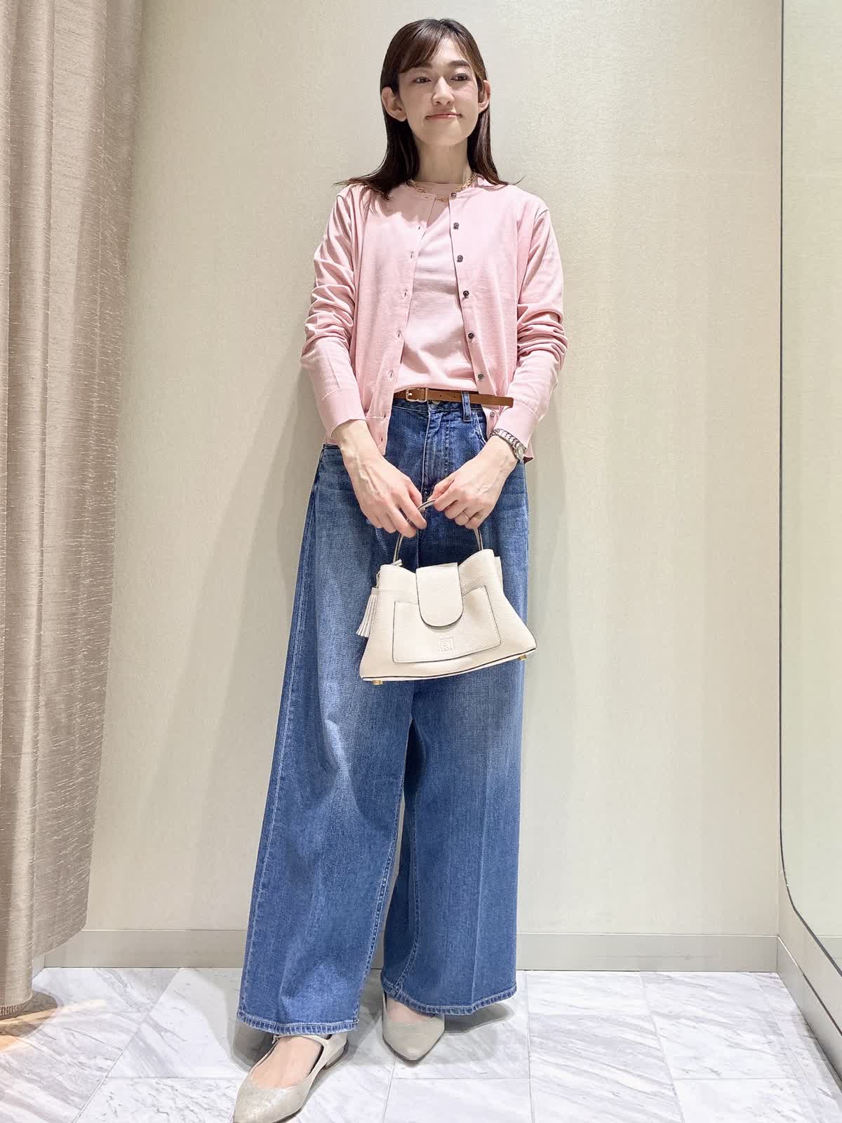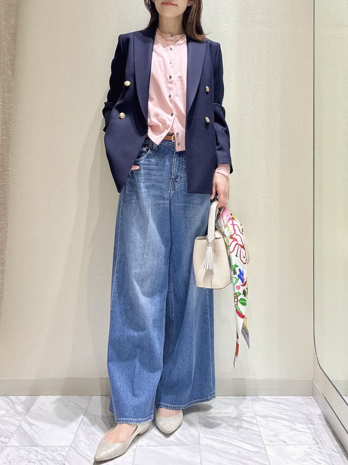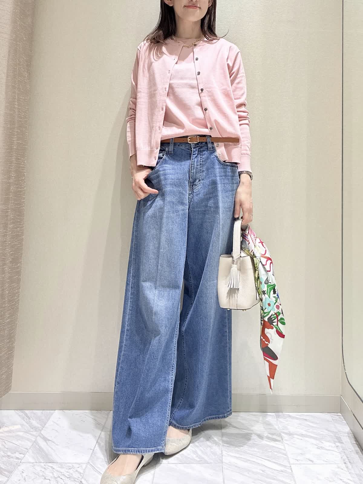 【着用サイズ】ニット/ジャケット:9号 デニム:11号 【着用カラー】ジャケット:ネイビー ニット/カーディガン:ピンク デニム:インディゴ ベルト:キャメル バッグ:オフホワイト スカーフ:グレー ネックレス:ゴールド 休日のお出かけにもおすすめ、INEDのデニムスタイルのご紹介です。 デニムはとても柔らかく履き心地の良い素材です。ワイドシルエットですが広がりすぎず、程良い太さです。 トップスには、INEDの定番ダブルジャケットを合わせました。ネイビーカラーは色合わせがしやすく、羽織るだけで様になります。 インナーは春らしい淡いピンクのニットを合わせました。ハイゲージでとても柔らかい素材です。シンプルなデザインで、着回しもしていただきやすいです。