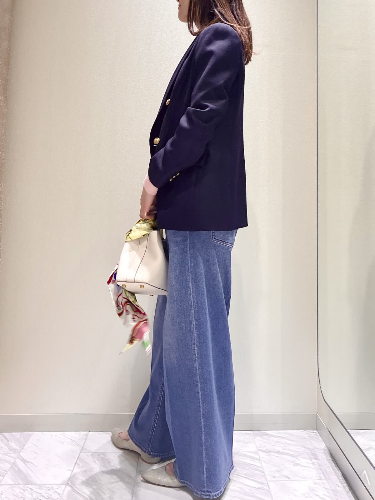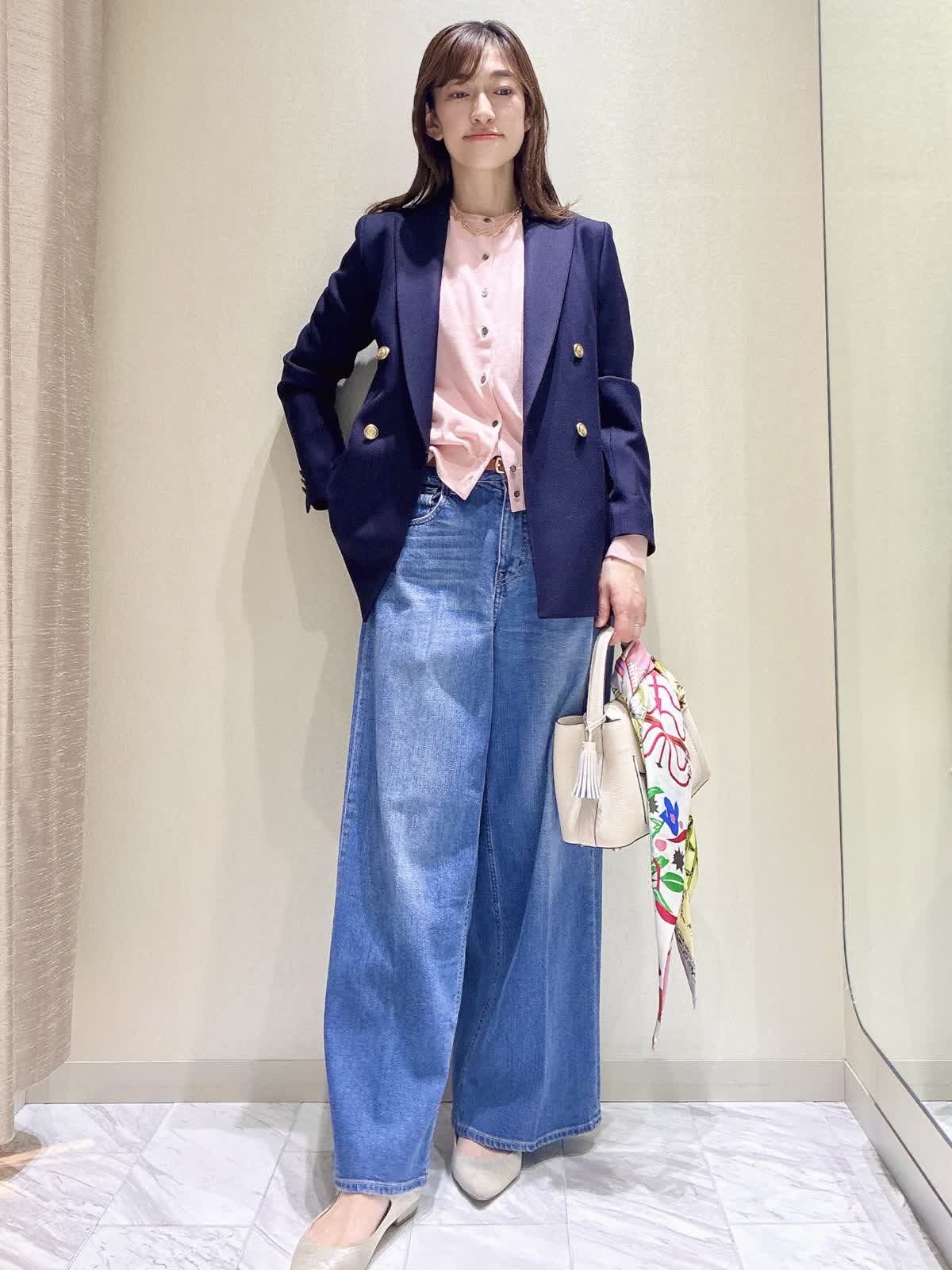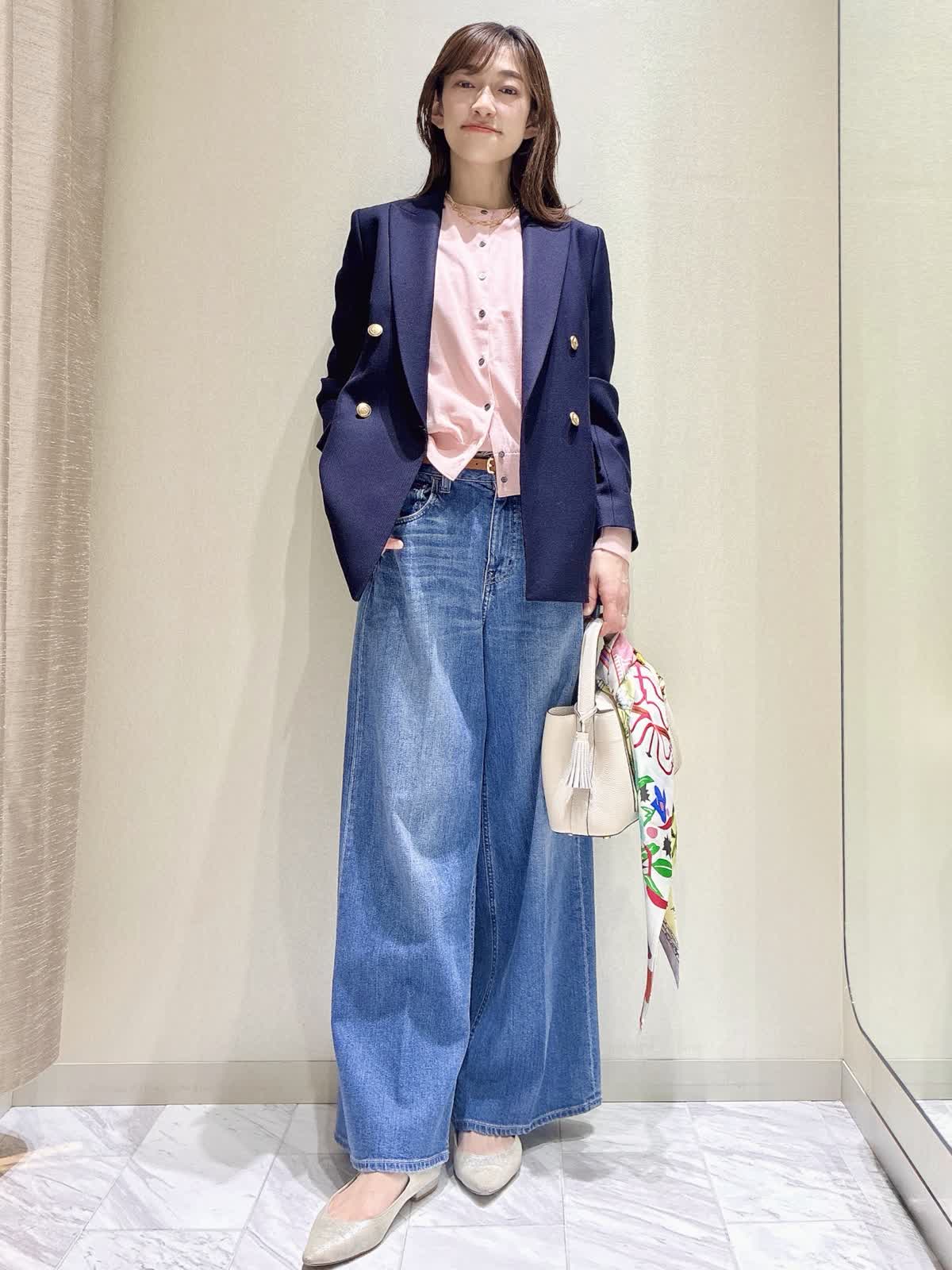 【着用サイズ】ニット/ジャケット:9号 デニム:11号 【着用カラー】ジャケット:ネイビー ニット/カーディガン:ピンク デニム:インディゴ ベルト:キャメル バッグ:オフホワイト スカーフ:グレー ネックレス:ゴールド 休日のお出かけにもおすすめ、INEDのデニムスタイルのご紹介です。 デニムはとても柔らかく履き心地の良い素材です。ワイドシルエットですが広がりすぎず、程良い太さです。 トップスには、INEDの定番ダブルジャケットを合わせました。ネイビーカラーは色合わせがしやすく、羽織るだけで様になります。 インナーは春らしい淡いピンクのニットを合わせました。ハイゲージでとても柔らかい素材です。シンプルなデザインで、着回しもしていただきやすいです。