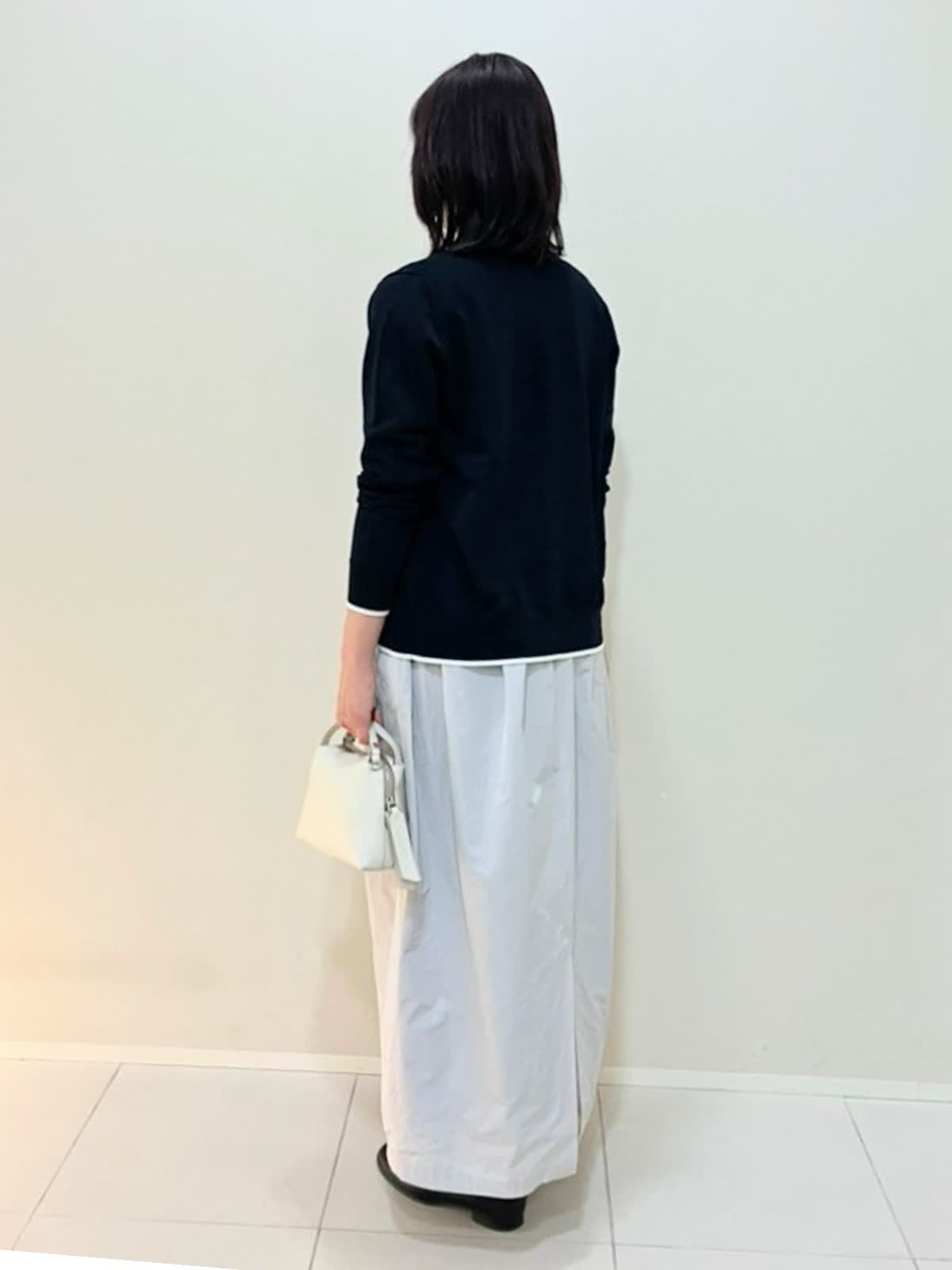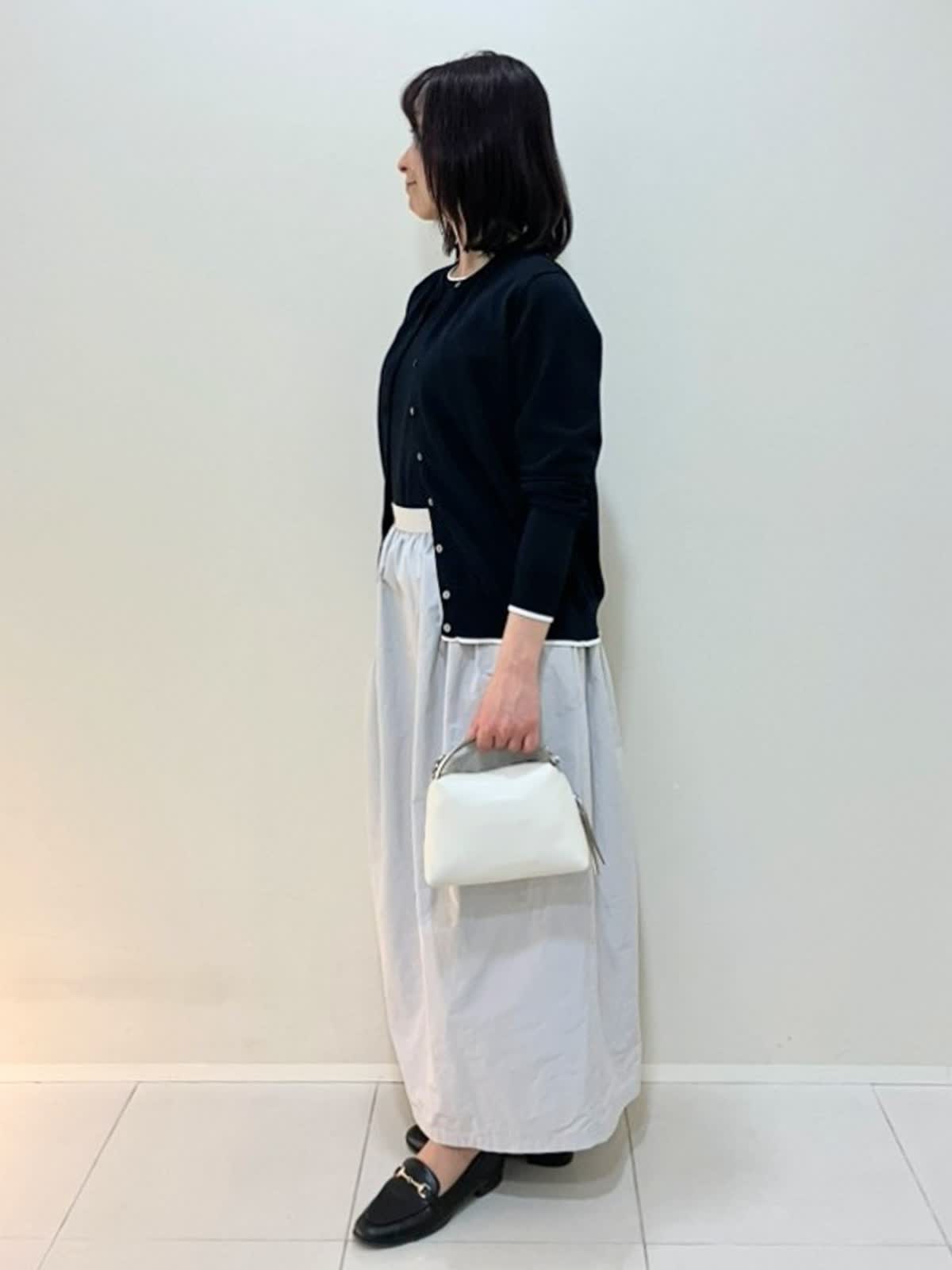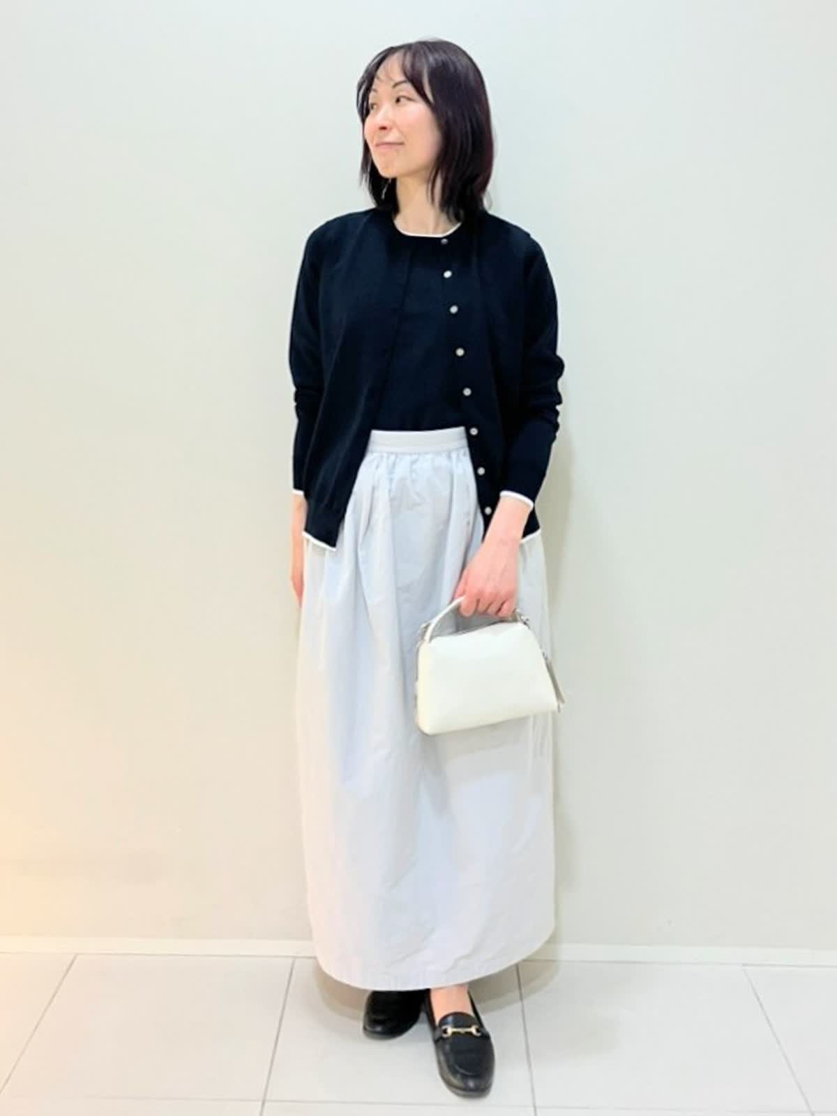 【着用サイズ】アンサンブル:9号 スカート:9号【着用カラー】 アンサンブル:ネイビー スカート:グレー 春のお買い物スタイル ライン配色が綺麗なアンサンブルは、清涼感のある肌触りで着心地が良く、セットでも単品でも活躍するアイテム。暖かい日には、カーディガンを肩がけするのもお勧めです。スカートはおなかまわりをカバーしてくれるコクーンデザイン。軽くてウエストも楽な後ろゴム仕様になっています。