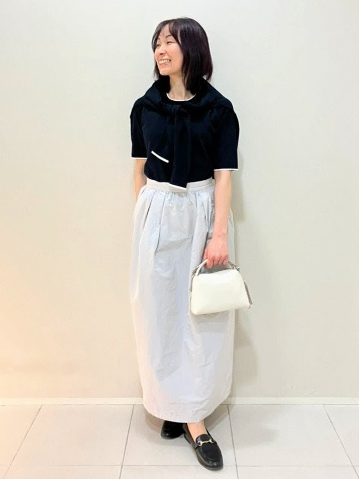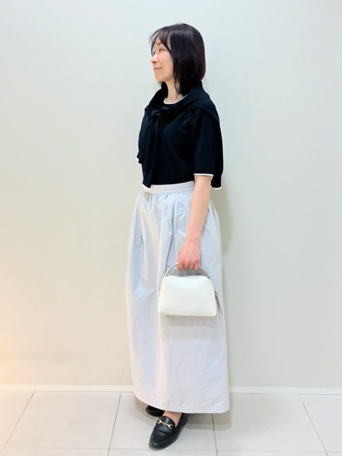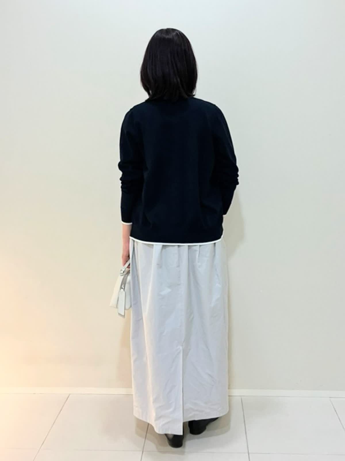 【着用サイズ】アンサンブル:9号 スカート:9号【着用カラー】 アンサンブル:ネイビー スカート:グレー 春のお買い物スタイル ライン配色が綺麗なアンサンブルは、清涼感のある肌触りで着心地が良く、セットでも単品でも活躍するアイテム。暖かい日には、カーディガンを肩がけするのもお勧めです。スカートはおなかまわりをカバーしてくれるコクーンデザイン。軽くてウエストも楽な後ろゴム仕様になっています。