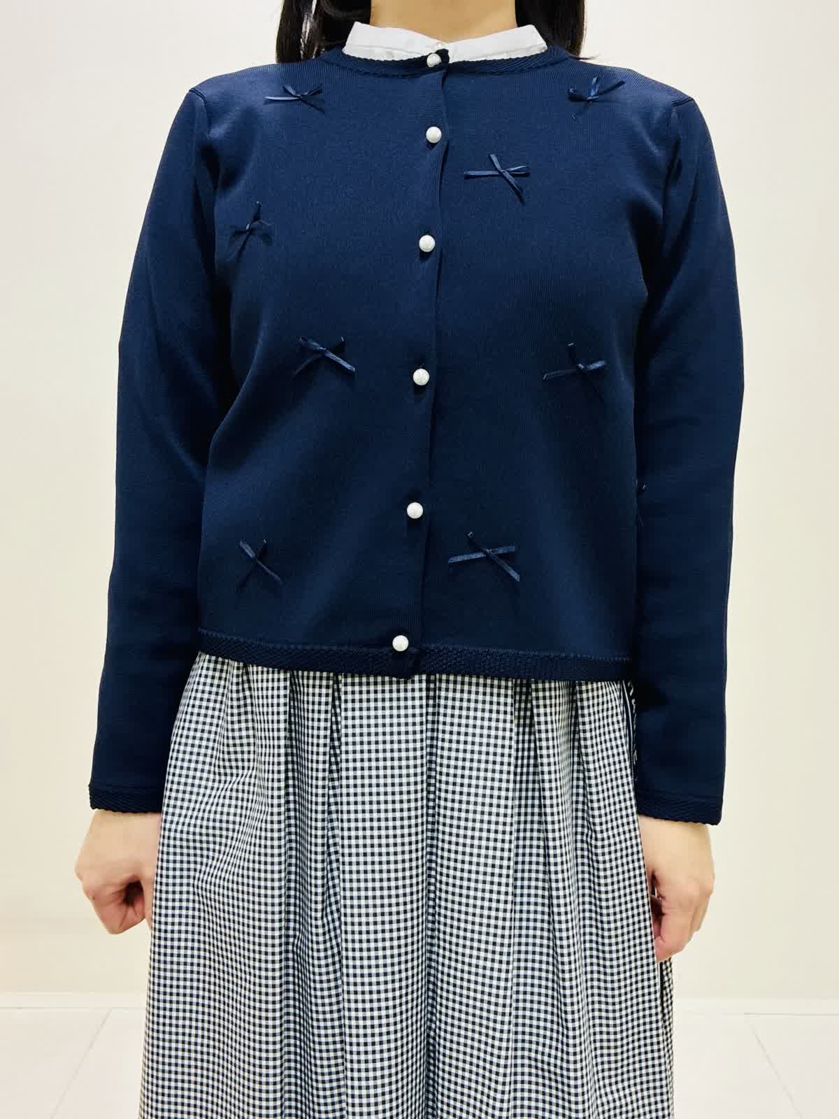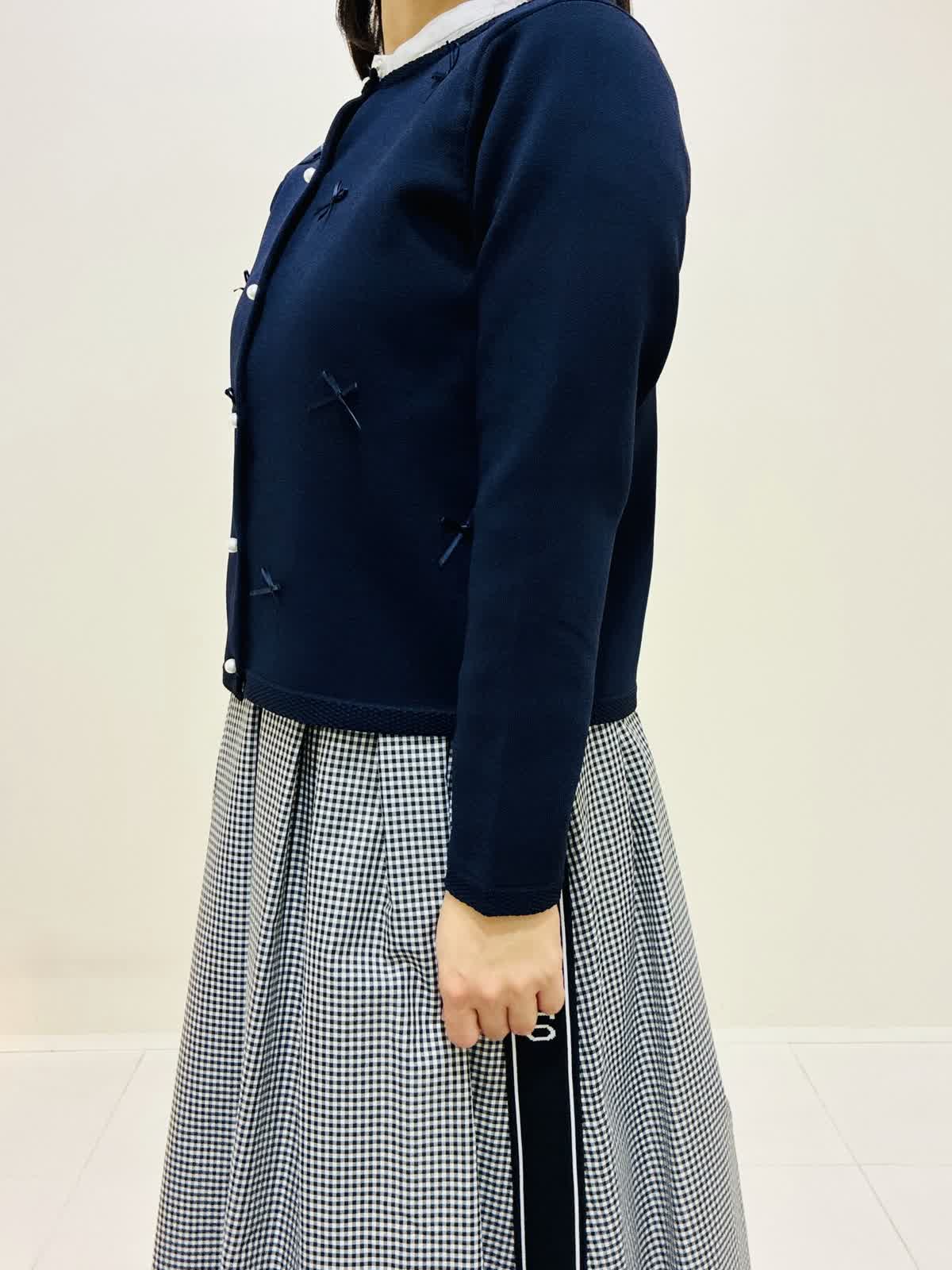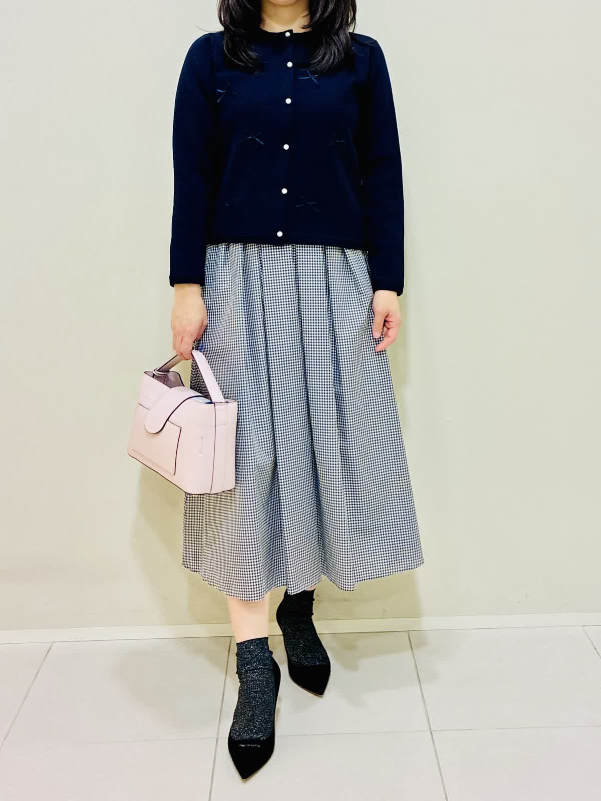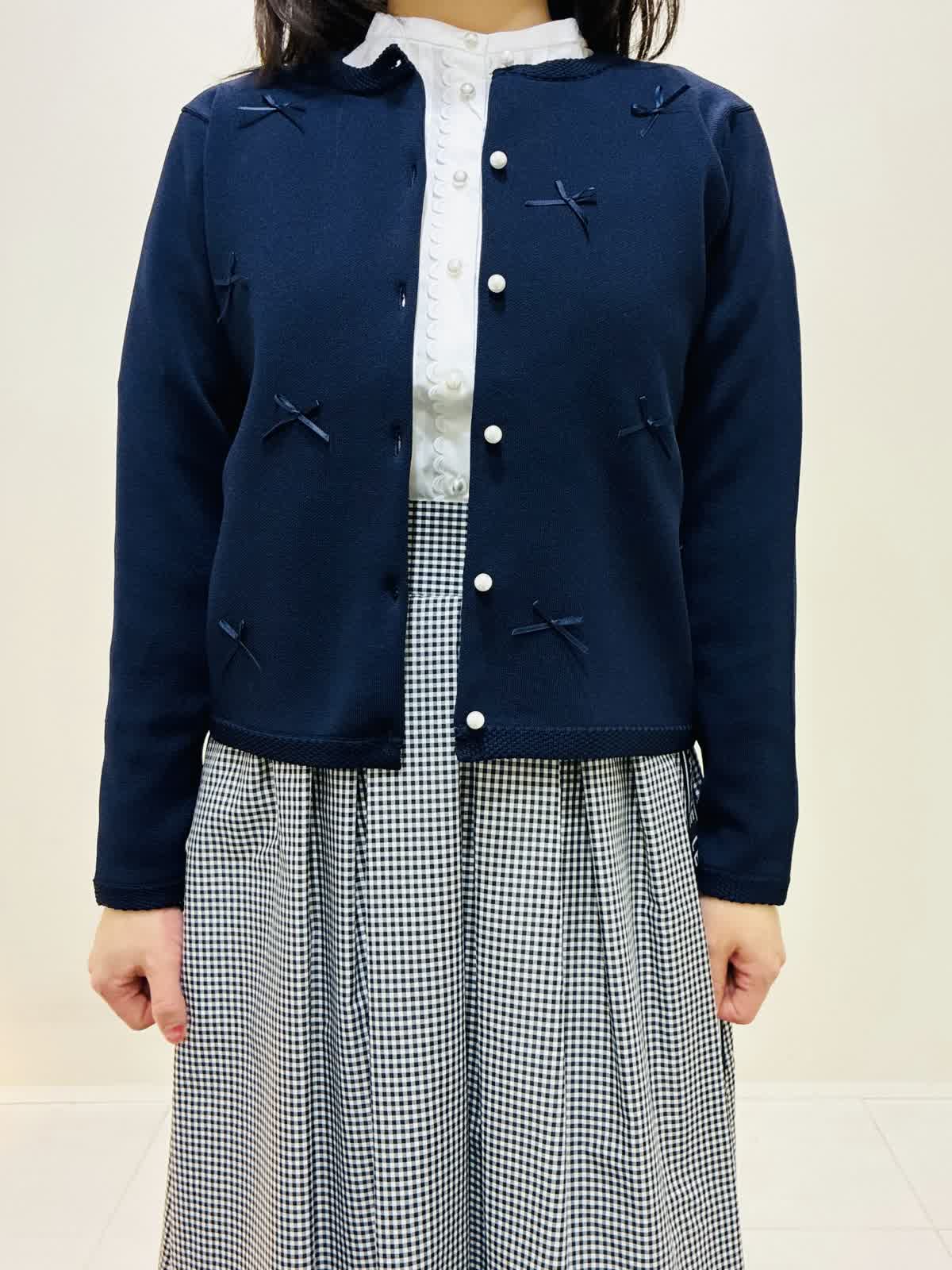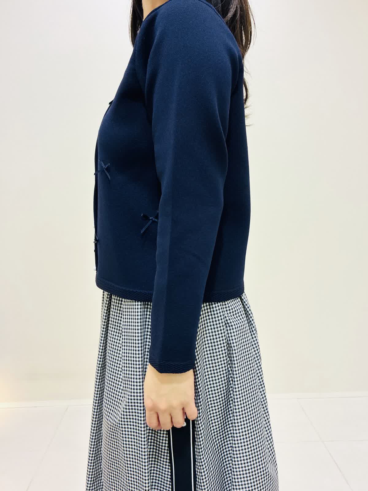 【着用サイズ】 リボンニットジャケット:ネイビー:9号サイズ ブラウス:オフホワイト:9号サイズ スカート:格子:9号サイズ バッグ:ピンク 『通勤にも着れるきれいめスタイリング』 リボンニットジャケットは軽く、カーディガンのように使えてワンピースワンピースの羽織りにもなります。リボンもニットと同色なので甘すぎない可愛さがあります。 ブラウスは透けにくく、一枚で主役になるデザインなので、季節が暖かくなったら一枚着でもお出かけできます。