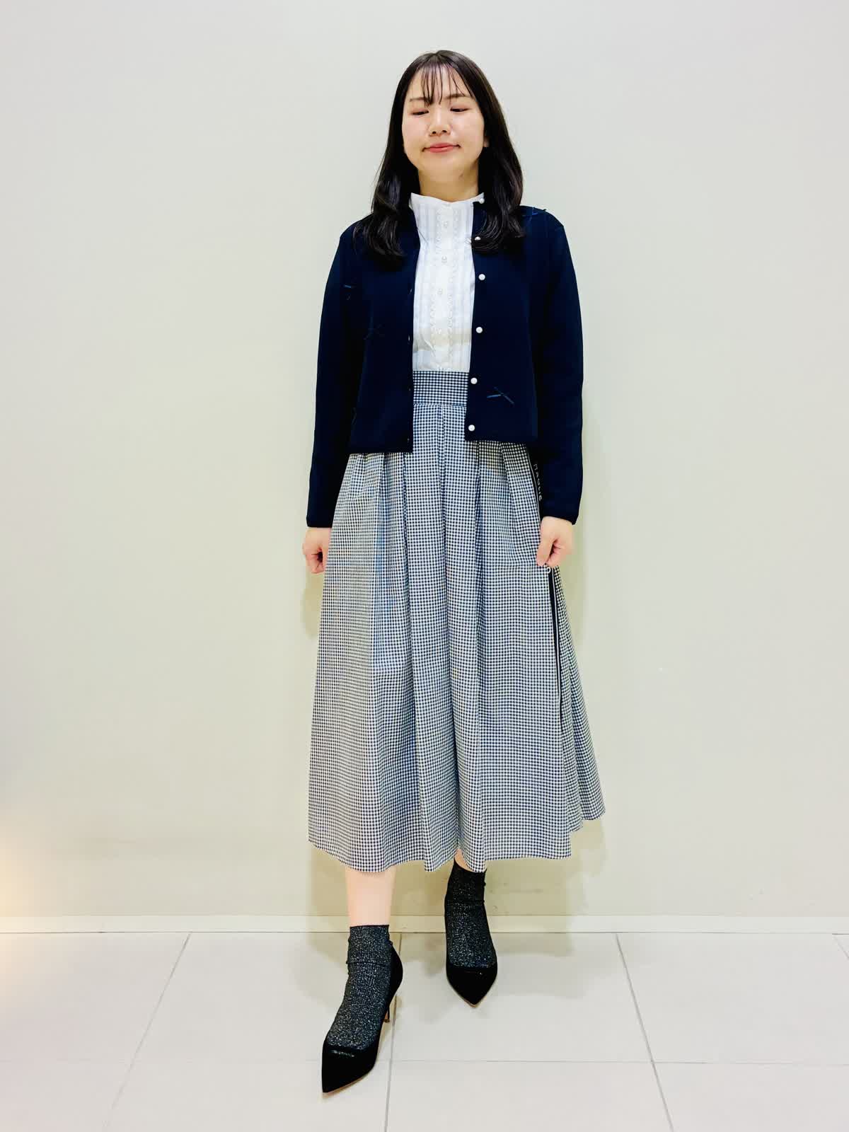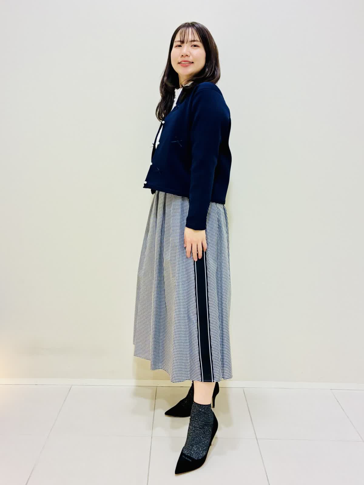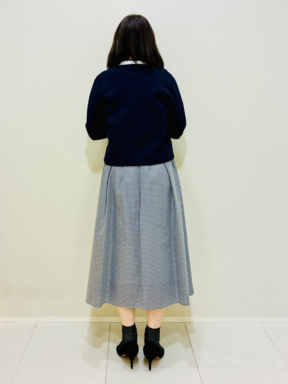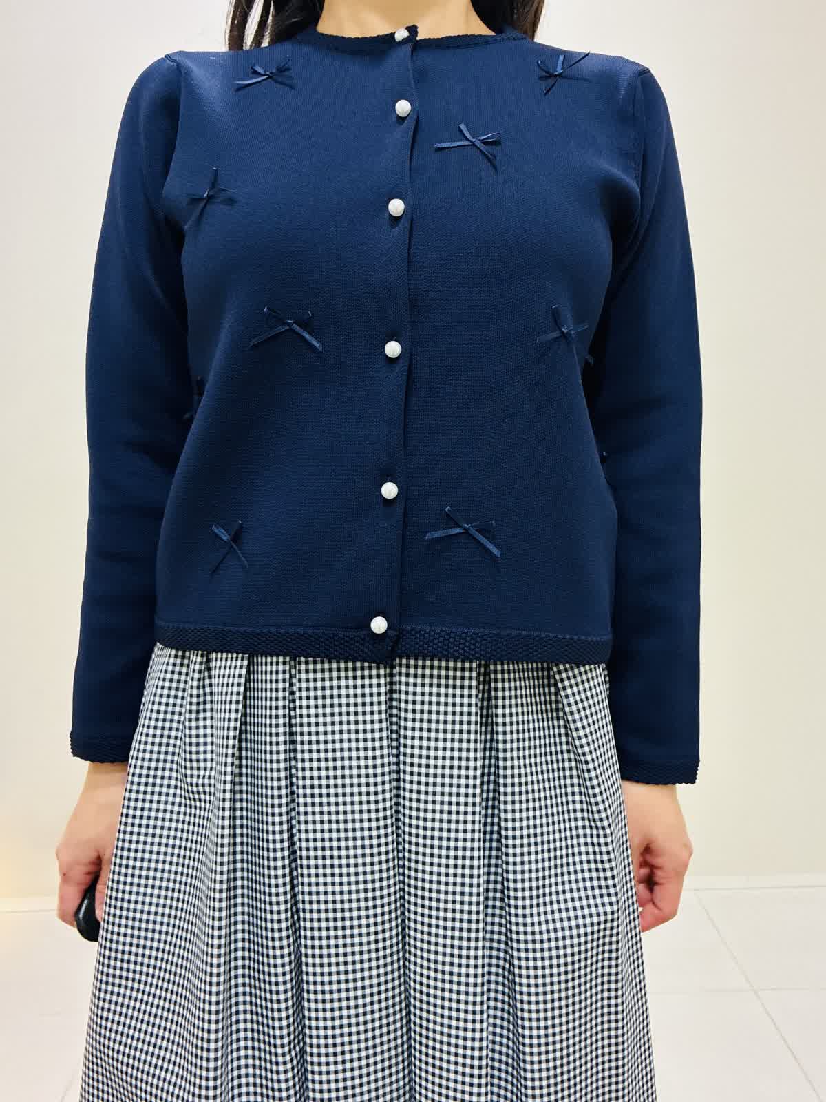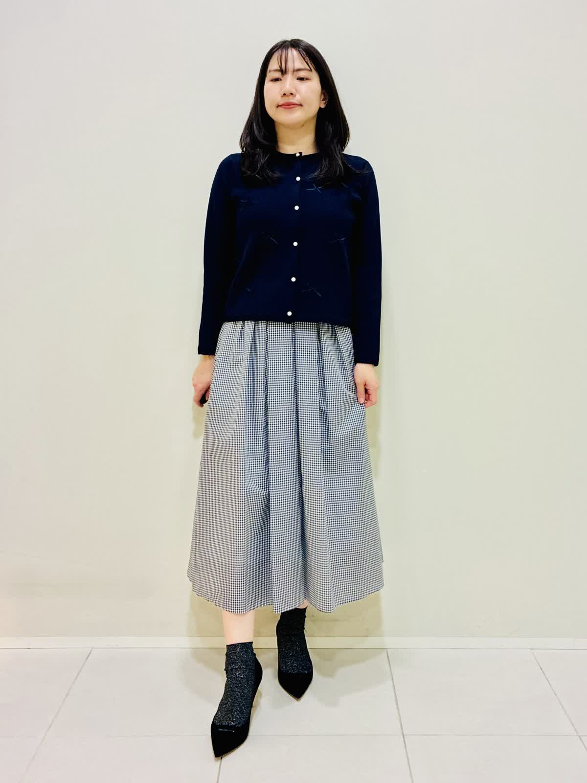 【着用サイズ】 リボンニットジャケット:ネイビー:9号サイズ ブラウス:オフホワイト:9号サイズ スカート:格子:9号サイズ バッグ:ピンク 『通勤にも着れるきれいめスタイリング』 リボンニットジャケットは軽く、カーディガンのように使えてワンピースワンピースの羽織りにもなります。リボンもニットと同色なので甘すぎない可愛さがあります。 ブラウスは透けにくく、一枚で主役になるデザインなので、季節が暖かくなったら一枚着でもお出かけできます。