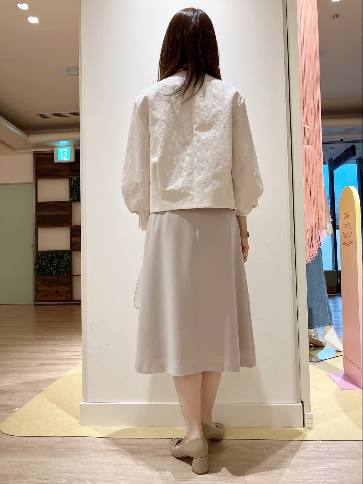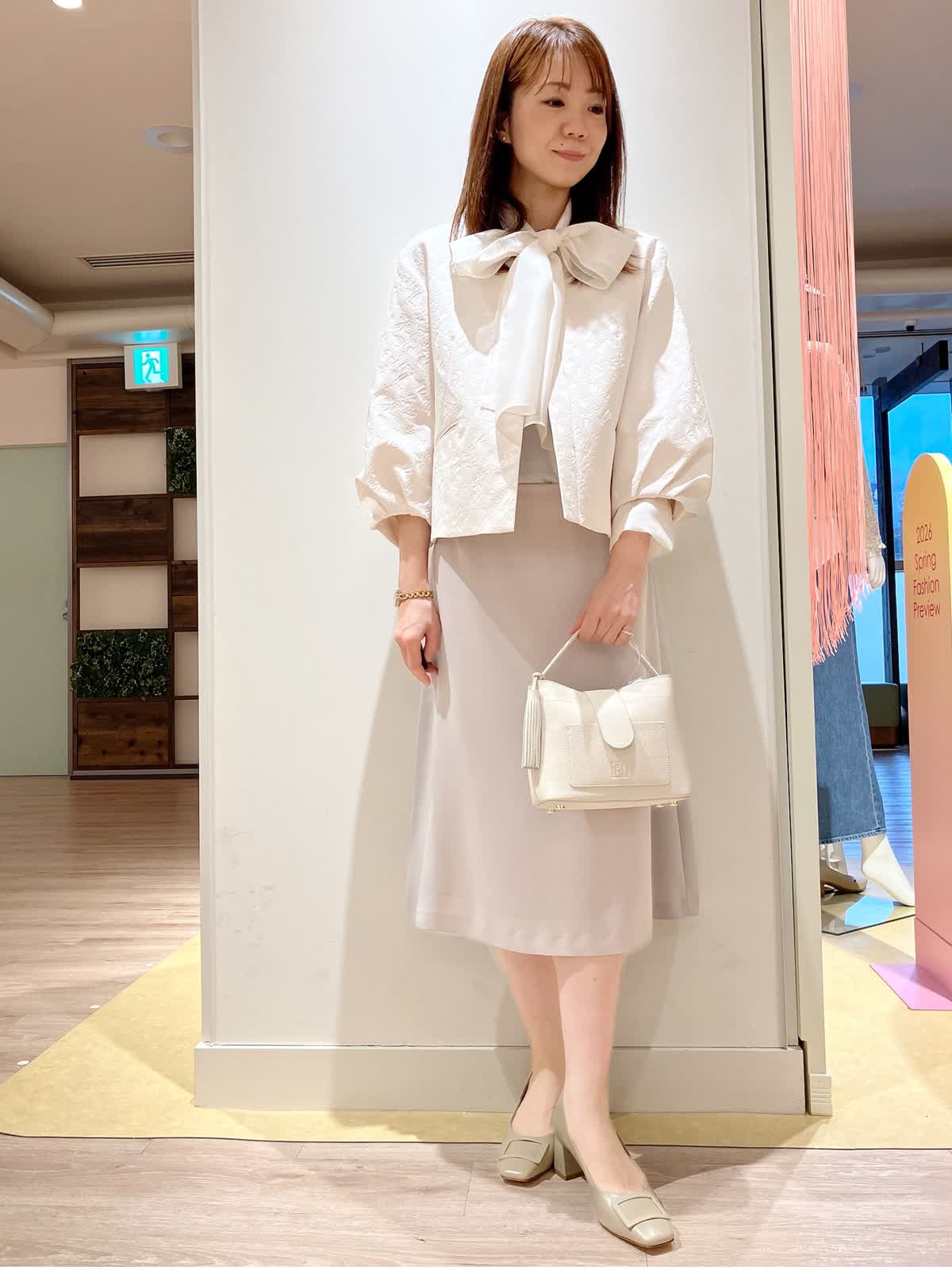 【着用サイズ】ジャケット:9号 ブラウス:9号 スカート:7号 【着用カラー】ジャケット:アイボリー ブラウス:アイボリー スカート:グレージュ コーディネートのテーマは入学入園スタイリングです。 ジャガードのお洒落なデザインのジャケットに、大きめリボンで、華やかで女性らしいコーディネート。スカートの着丈が絶妙で、バランスが良いです。入学入園に人と差のつくセレモニースタイリングはいかがですか?