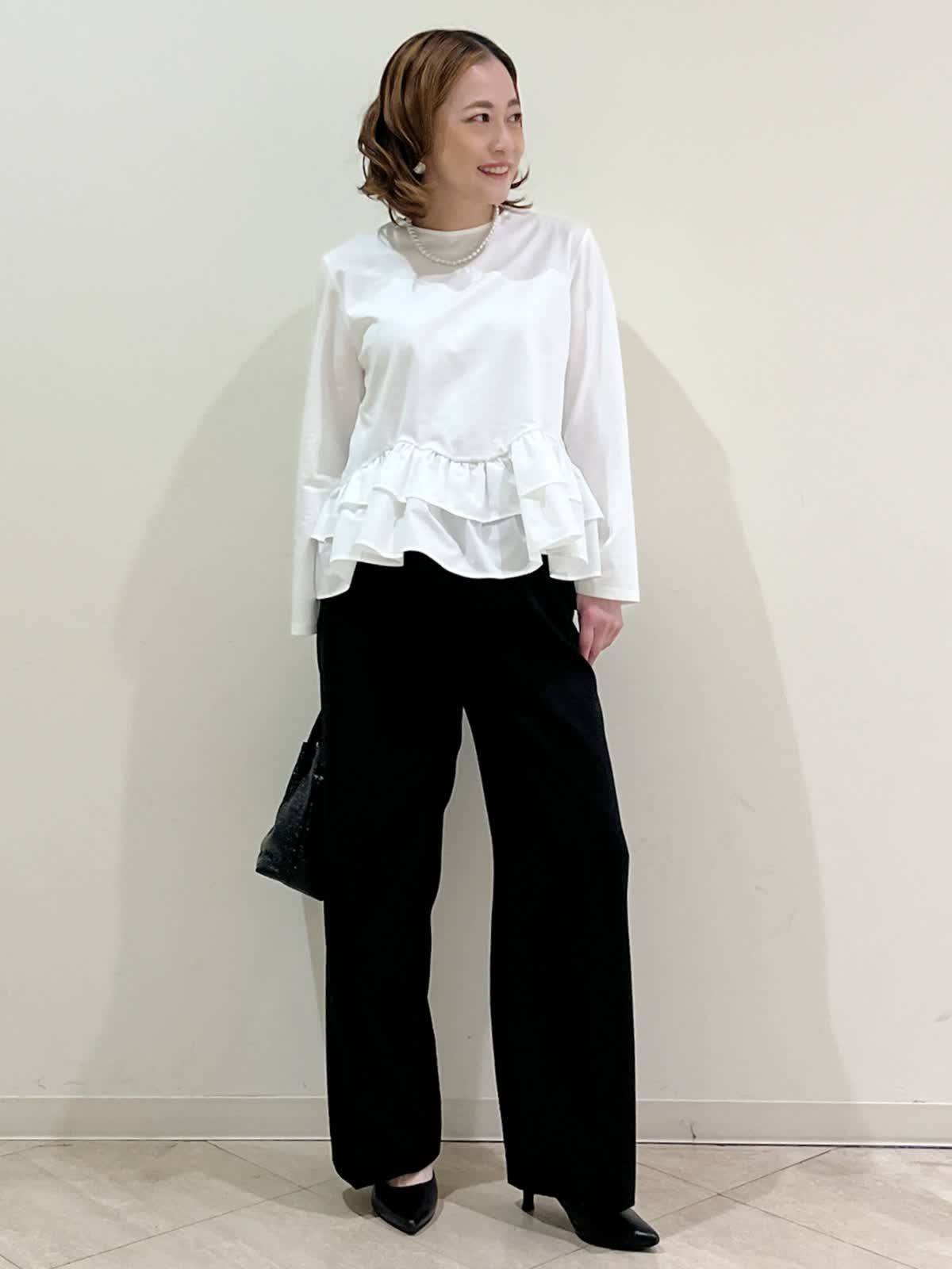 【着用サイズ】カットソー:フリーサイズ パンツ:9号 【着用カラー】カットソー:オフホワイト パンツ:ブラック 春のお食事会コーディネートです。立体的なシルエットと揺れ感が女性らしさを演出してくれるカットソーです。落ち感がきれいなセミワイドのパンツと合わせてスタイリングしてみました。