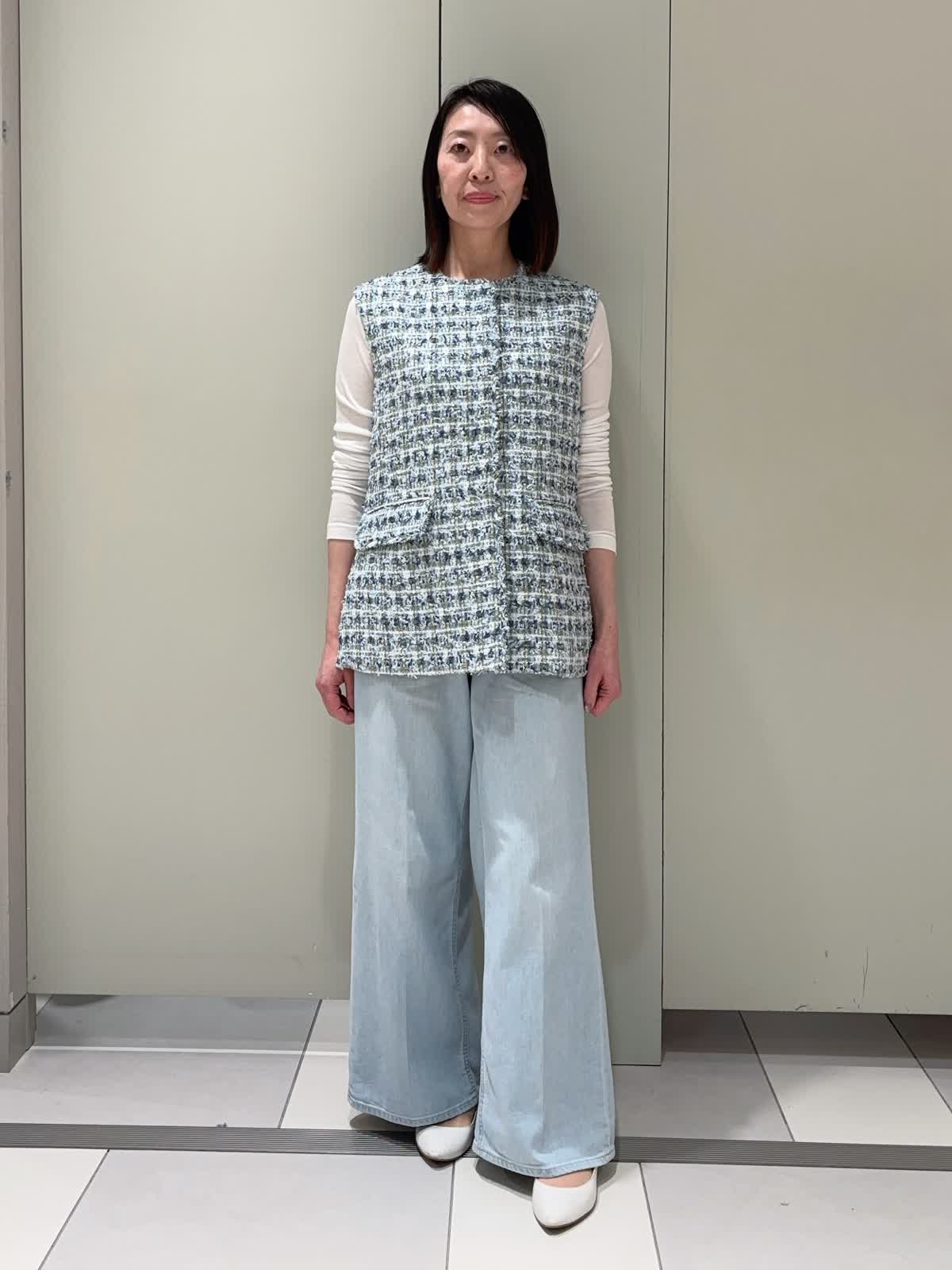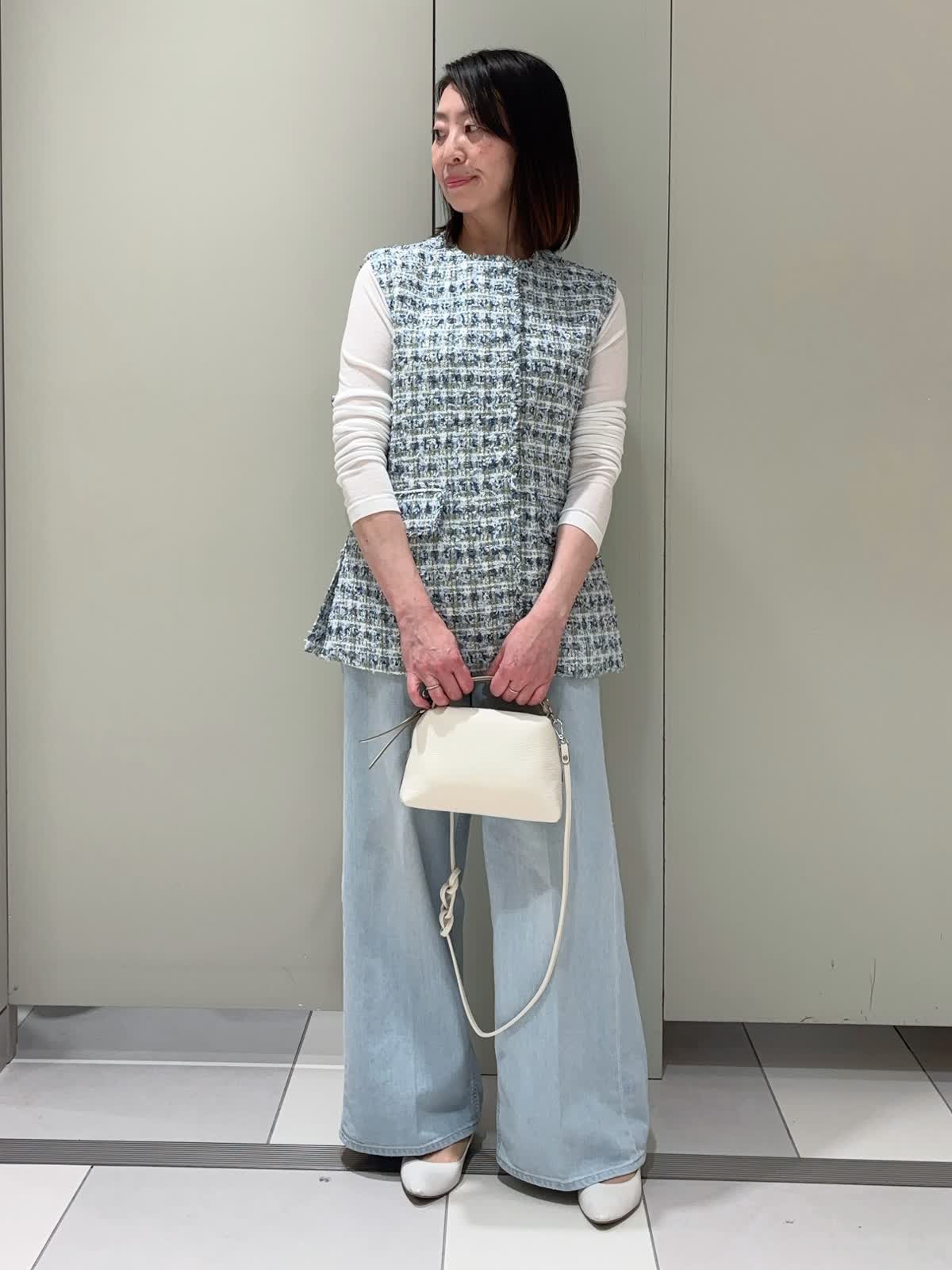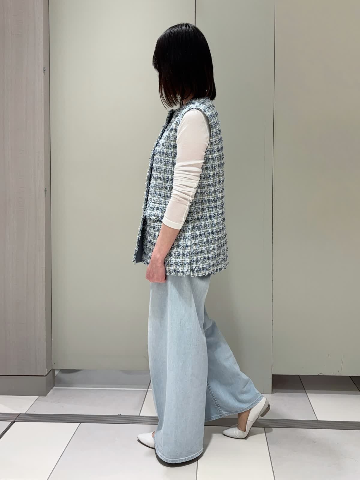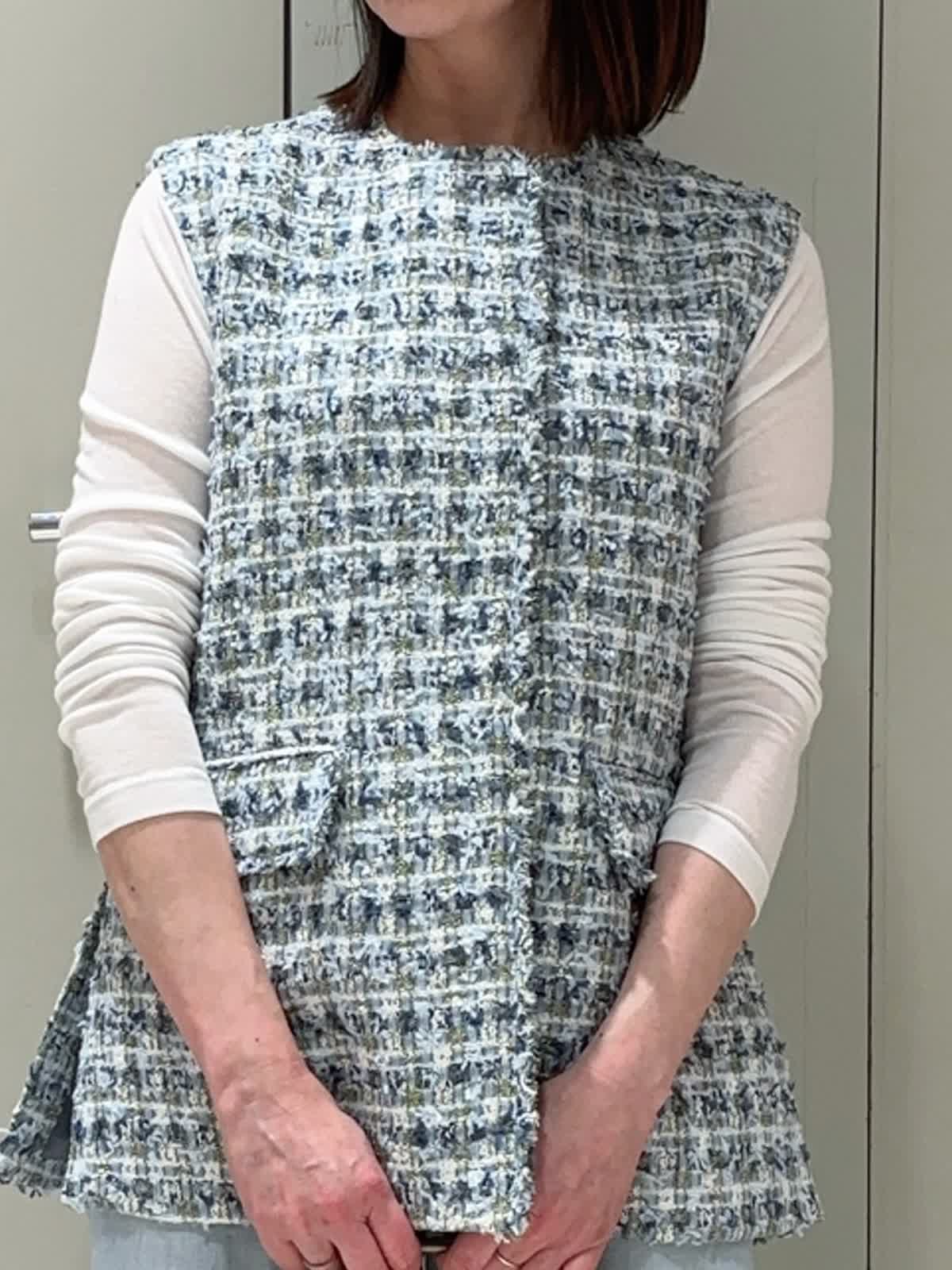 【着用サイズ】ジレ:9号 カットソー:9号 パンツ:5号 【着用カラー】ジレ: サックス カットソー:オフホワイト パンツ: サックス バッグ:オフホワイト 少しゆとりのある身幅とヒップにかかるミドル丈のツィードジレ。ラメ糸を織り込んだ素材で派手になりすぎないのがポイント。 デニムやカットソーと合わせてカジュアルにもブラウスやきれいめボトムと合わせればお仕事スタイルにも。羽織るだけでコーディネートが決まるオンオフ問わず活躍するおすすめのアイテムです。