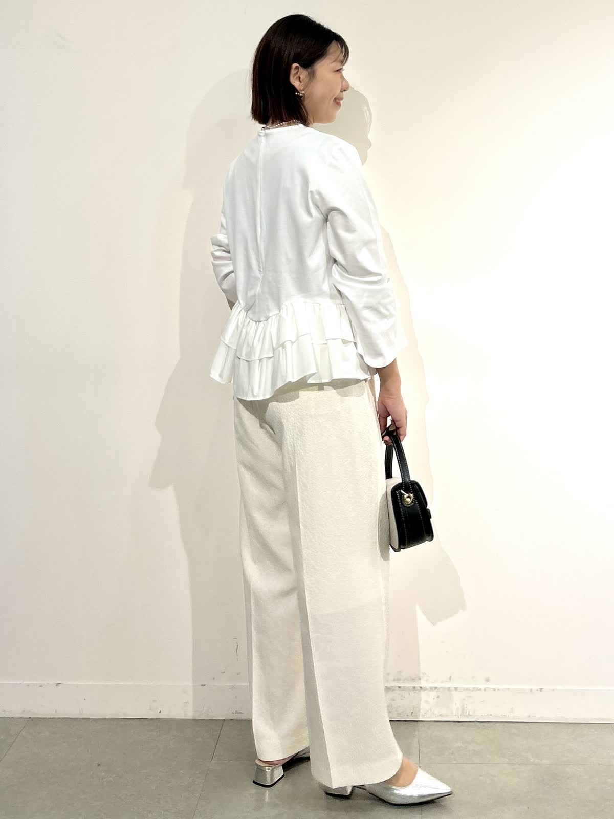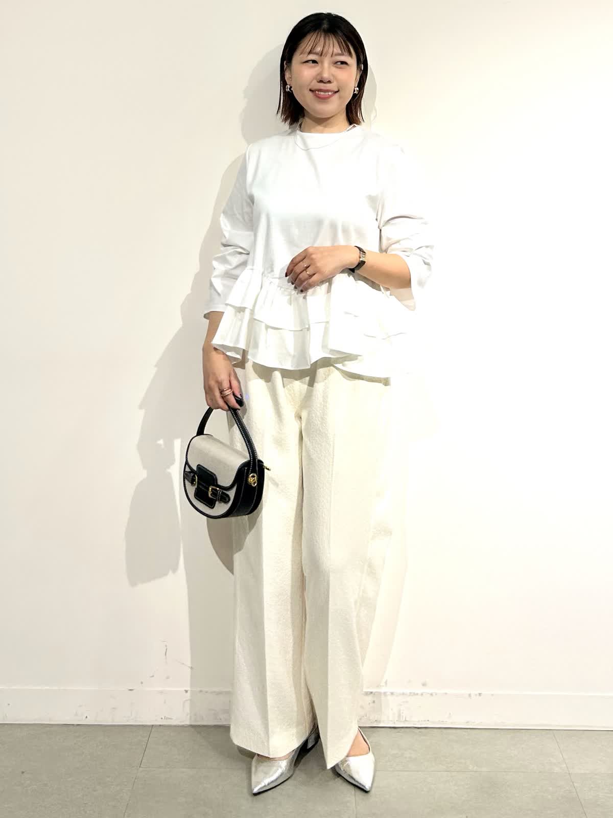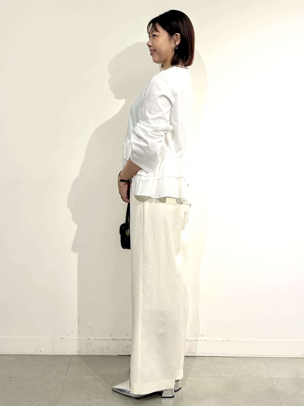《コラボSTORY》の裾フリルトップスをキレイめスタイルで。ウエスト高見えが叶うトップスはカジュアルにもキレイめにも合わせられます。
