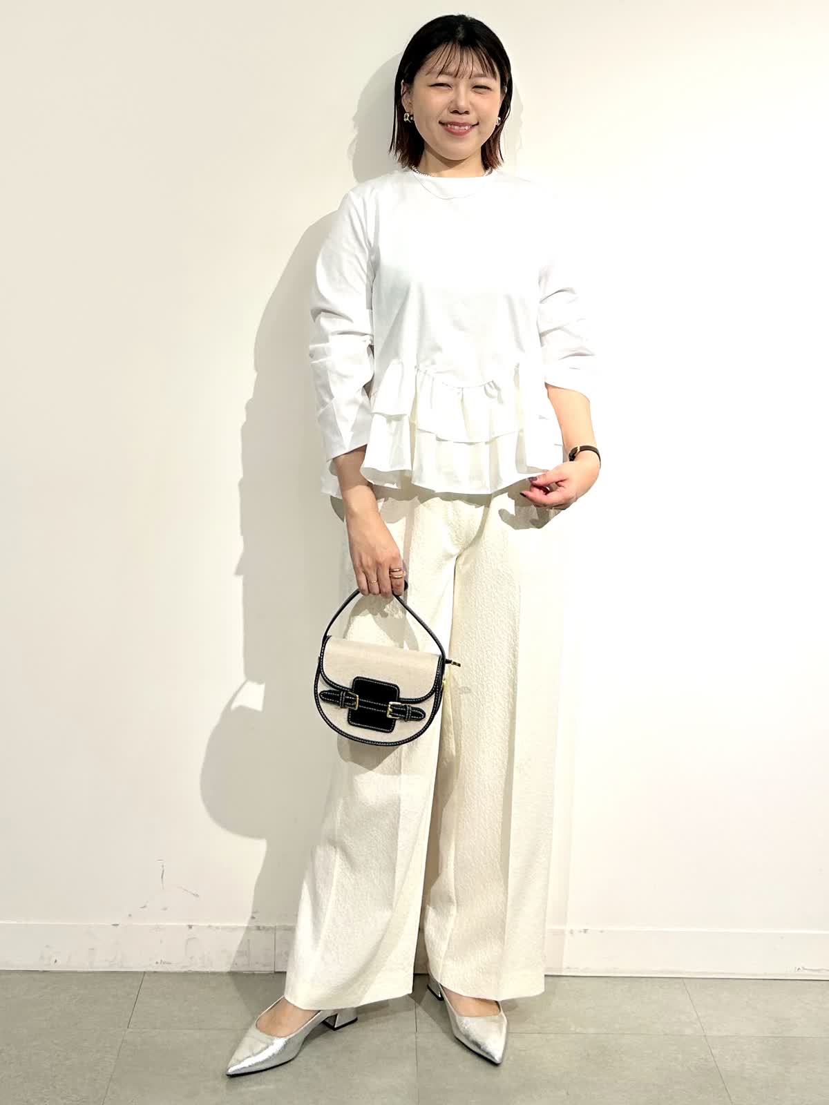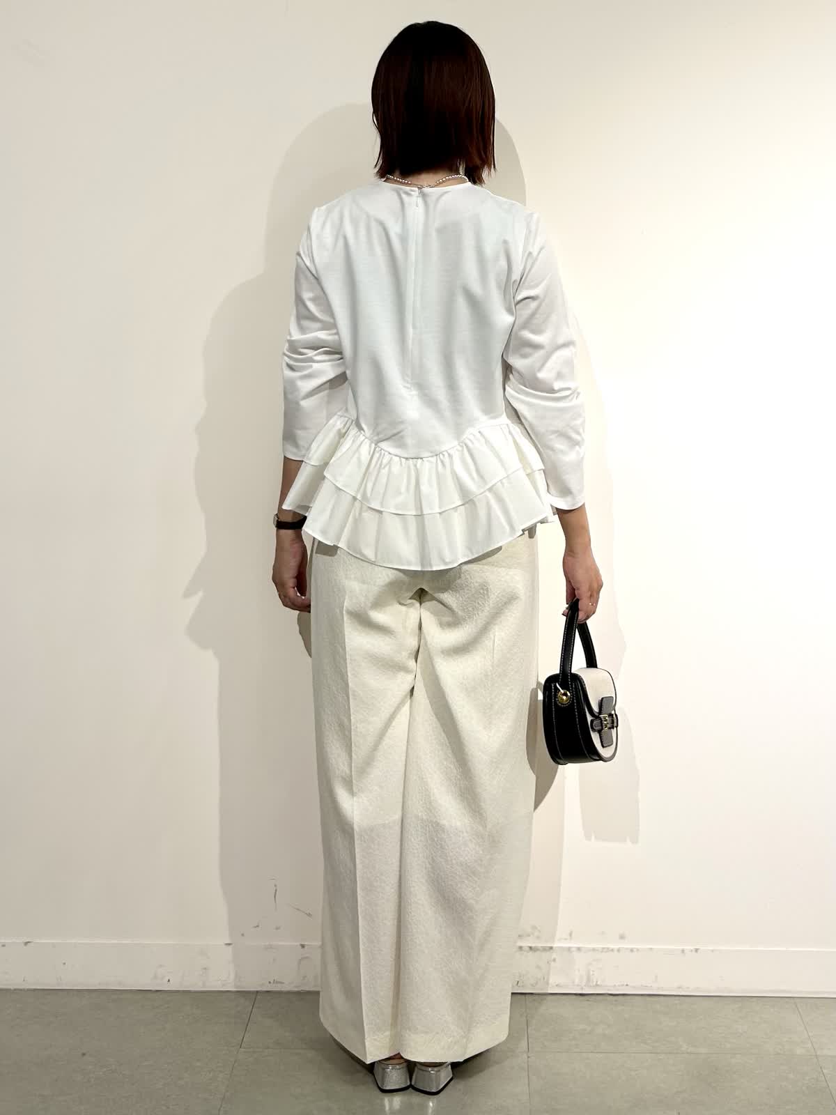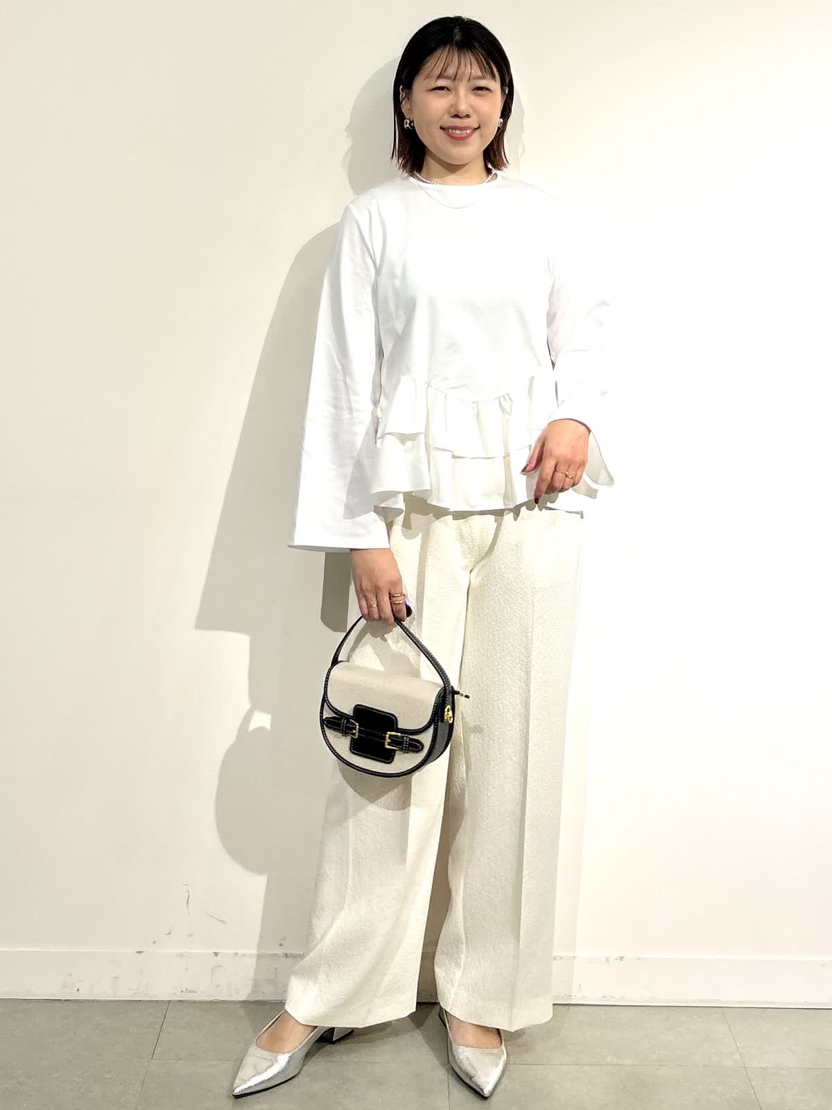 《コラボSTORY》の裾フリルトップスをキレイめスタイルで。ウエスト高見えが叶うトップスはカジュアルにもキレイめにも合わせられます。