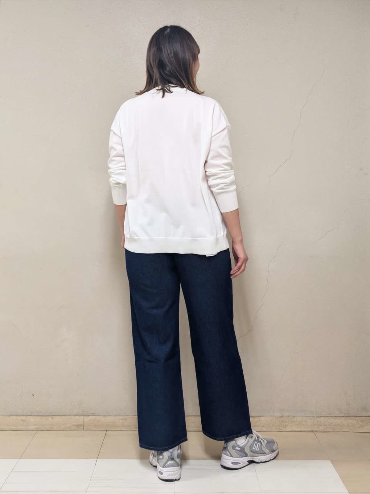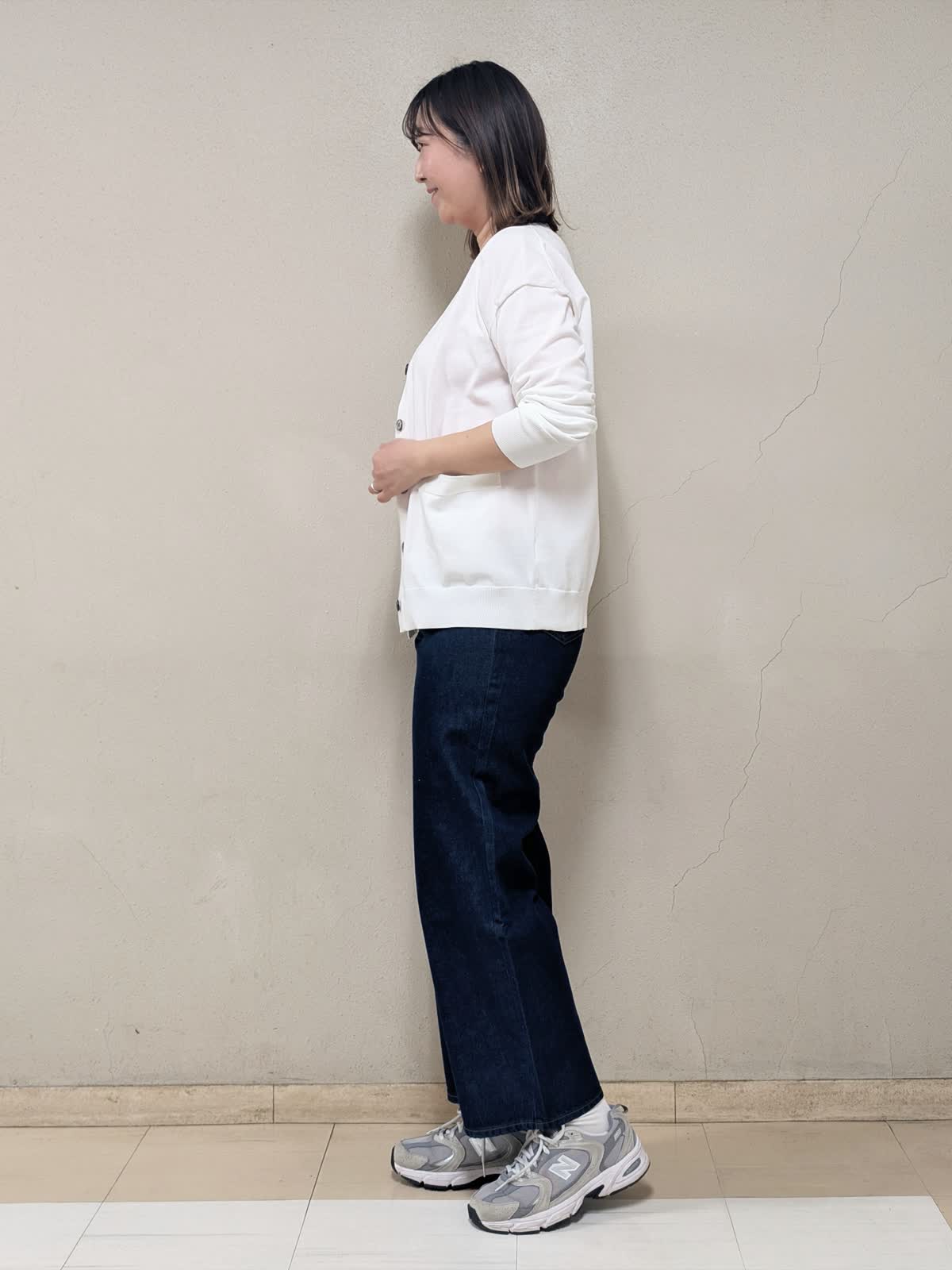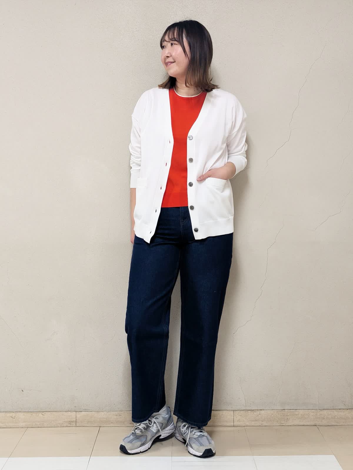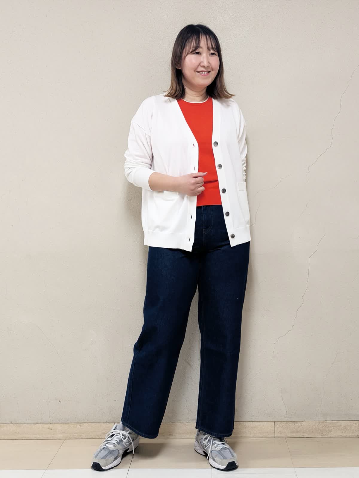 【着用サイズ】カーディガン:9号 ニット、パンツ:11号【着用カラー】カーディガン:オフホワイ ニット:シュイロ パンツ:インディゴ トリコロールカラーが春らしい、休日のお出かけコーディネートです。シュイロのニットはアンサンブルですが、インナーだけ使ってカジュアルな着こなしに。カーディガンは腰にかかる位の丈で、パンツにもスカートにも合わせやすいデザインです。デニムパンツはインディゴならカジュアルになり過ぎず、きれいめに穿けます。