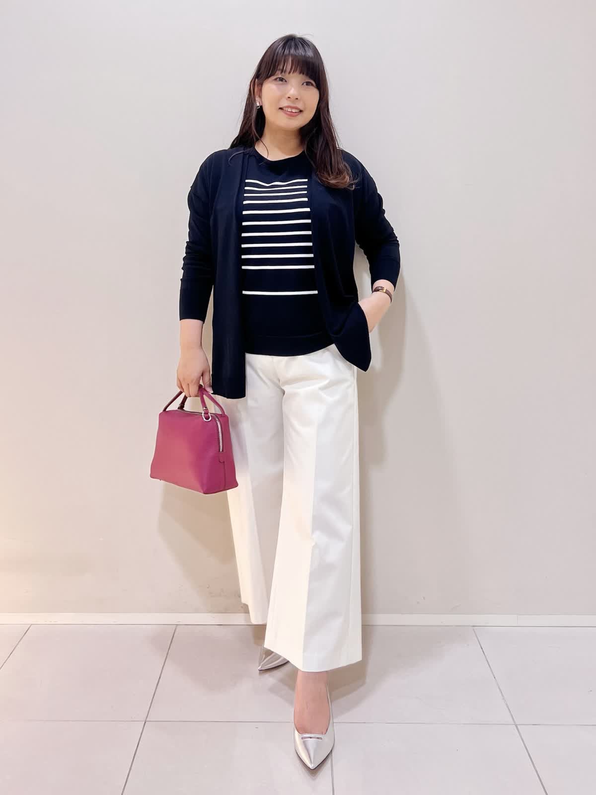 【着用サイズ】アンサンブル:9号 パンツ:11号 【着用カラー】アンサンブル:ネイビー パンツ:オフホワイト バッグ:ピンク 大人カジュアルスタイル。 さらっとした着心地が心地良いロングカーディガンアンサンブル。着流しのラインが綺麗なかーと、フレンチスリーブで接触冷感機能付きのインナーでシーズン長く着用できます。どちらもゆったりとしたサイズ感でUVカット素材です。 クロップド丈のチノパンはワイドシルエットが綺麗なデザイン。ウエストは後ろゴムで履きやすく、スッキリとしたラインがポイントです。 カジュアルにコーディネートして、お出掛けにもお勧めのスタイリングです。