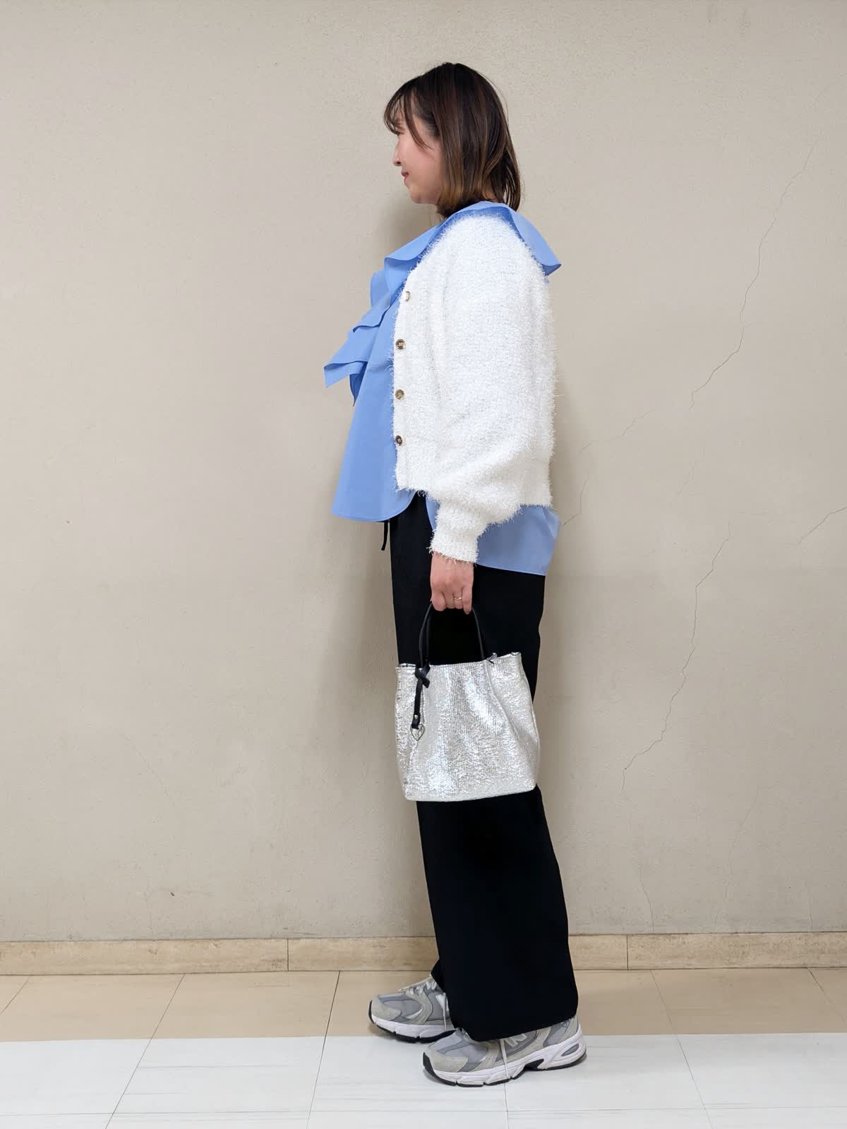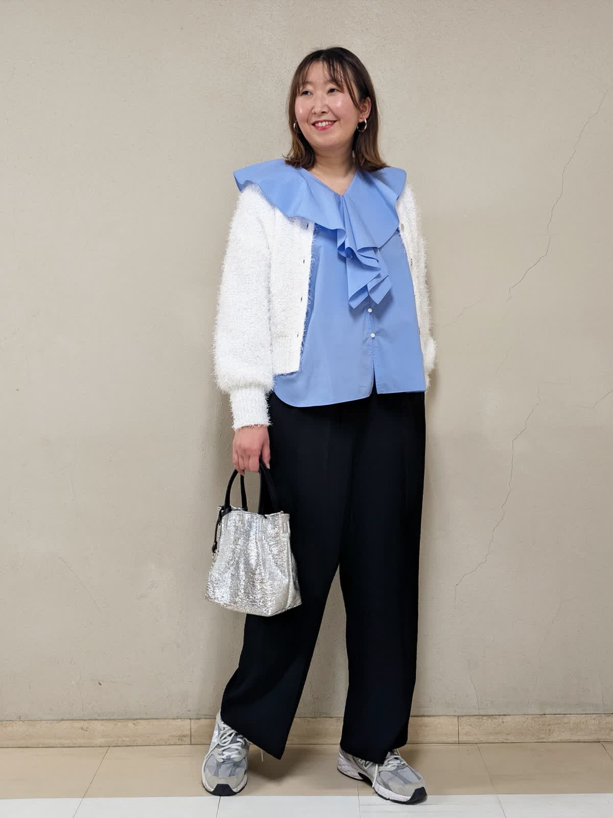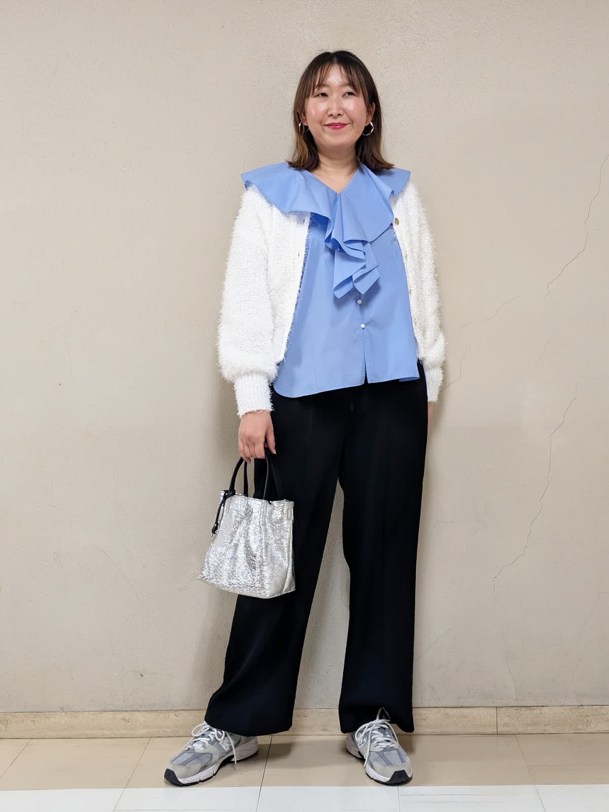 【着用サイズ】ブラウス、カーディガン:フリー パンツ:11号【着用カラー】ブラウス:ブルー カーディガン:ホワイト パンツ:ブラック ランチ会コーディネートです。ブラウスはラッフルフリルが華やかで着映え度抜群!大きめの襟で小顔効果も◎。ふわふわフェザーのカーディガンを羽織って、トップスは可愛らしく。ボトムは甘くなり過ぎないようパンツスタイルにしました。ジャガードで織りで柄を作っているのでさり気ないオシャレを楽しめます。ウエストが総ゴムで楽ちんです。