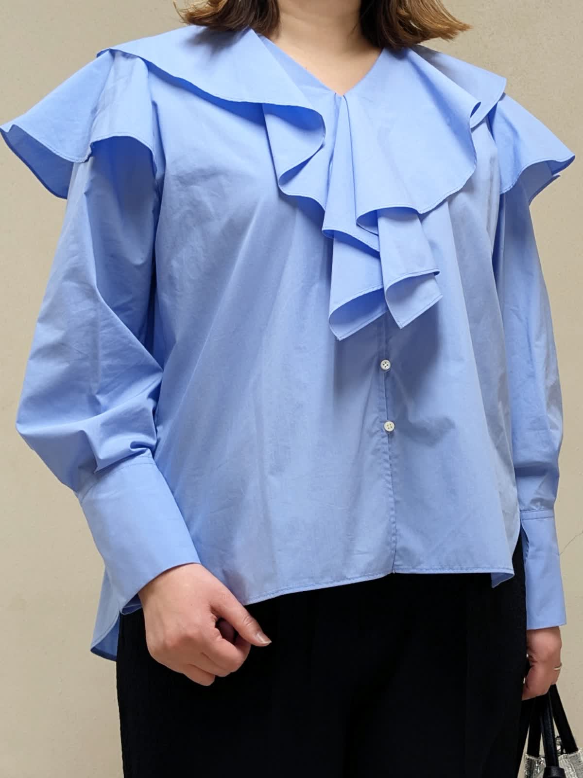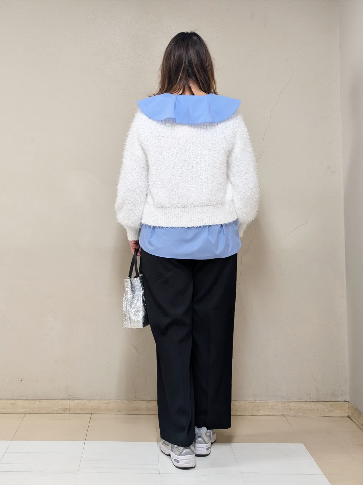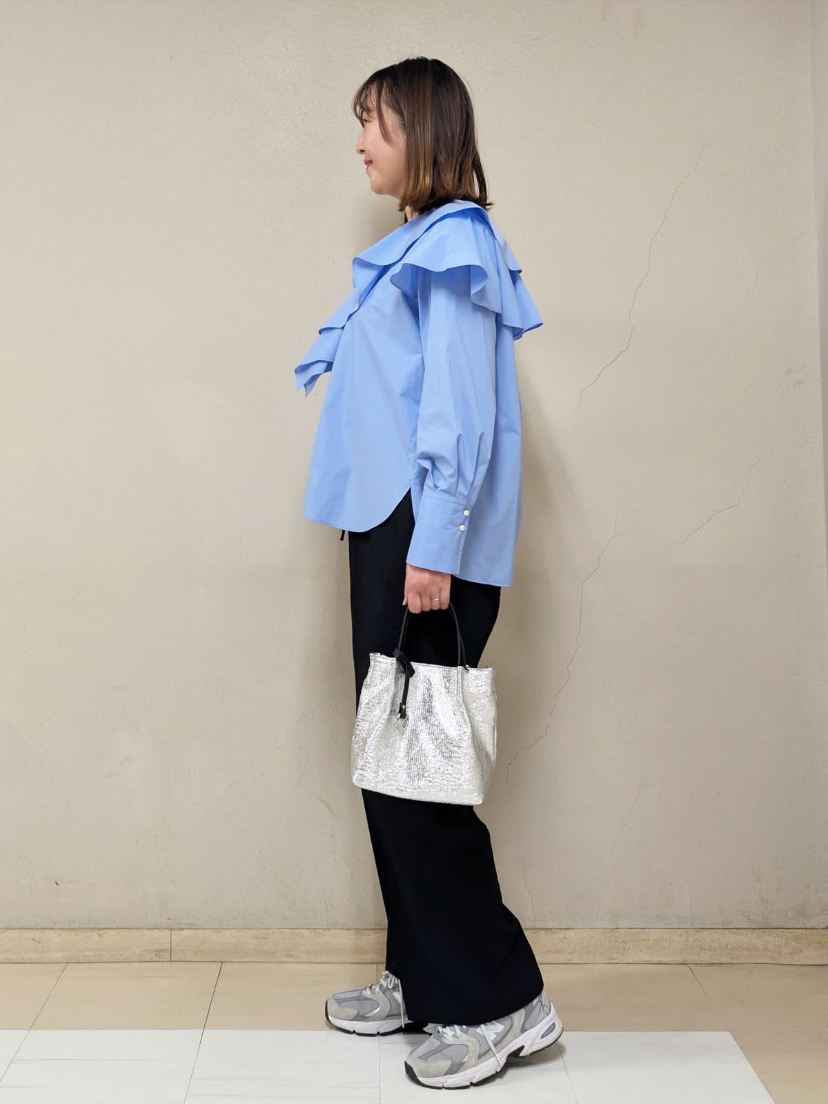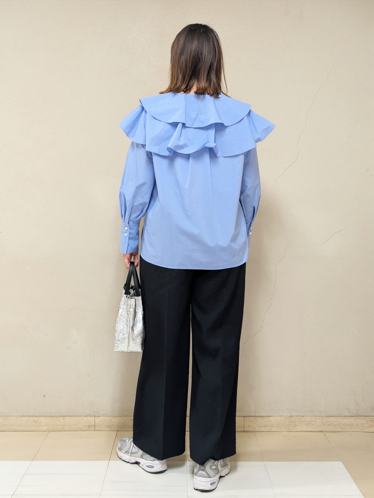 【着用サイズ】ブラウス、カーディガン:フリー パンツ:11号【着用カラー】ブラウス:ブルー カーディガン:ホワイト パンツ:ブラック ランチ会コーディネートです。ブラウスはラッフルフリルが華やかで着映え度抜群!大きめの襟で小顔効果も◎。ふわふわフェザーのカーディガンを羽織って、トップスは可愛らしく。ボトムは甘くなり過ぎないようパンツスタイルにしました。ジャガードで織りで柄を作っているのでさり気ないオシャレを楽しめます。ウエストが総ゴムで楽ちんです。