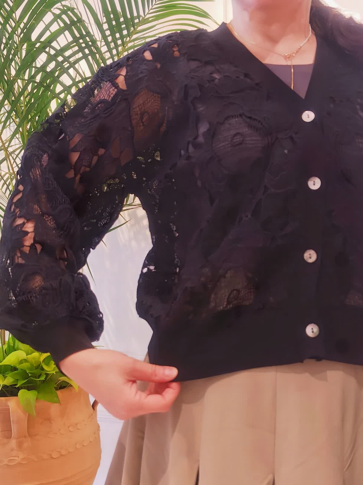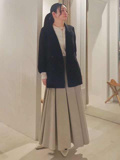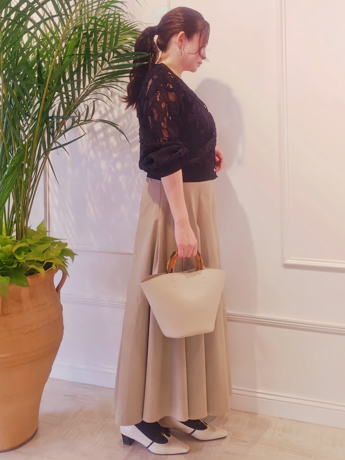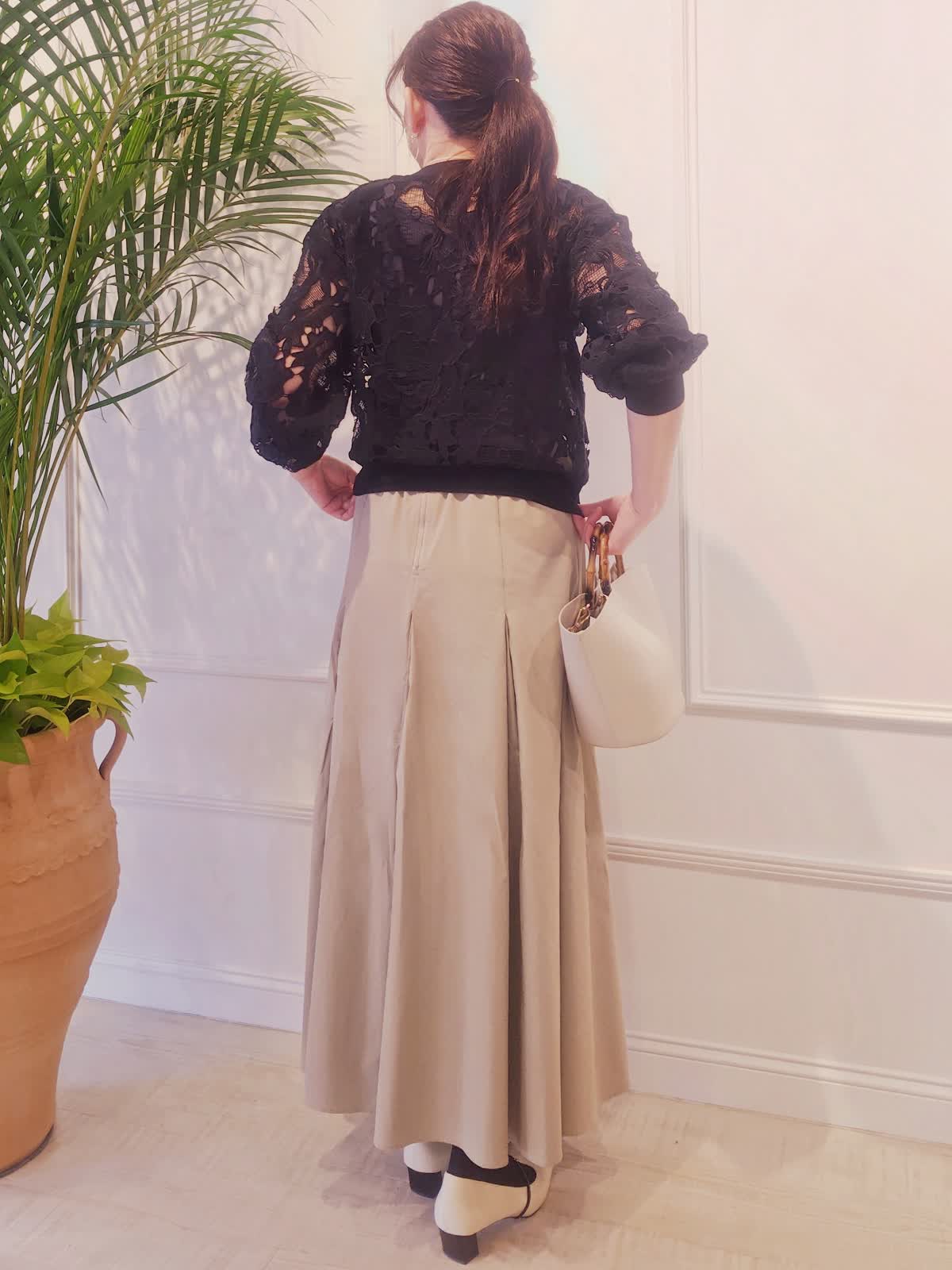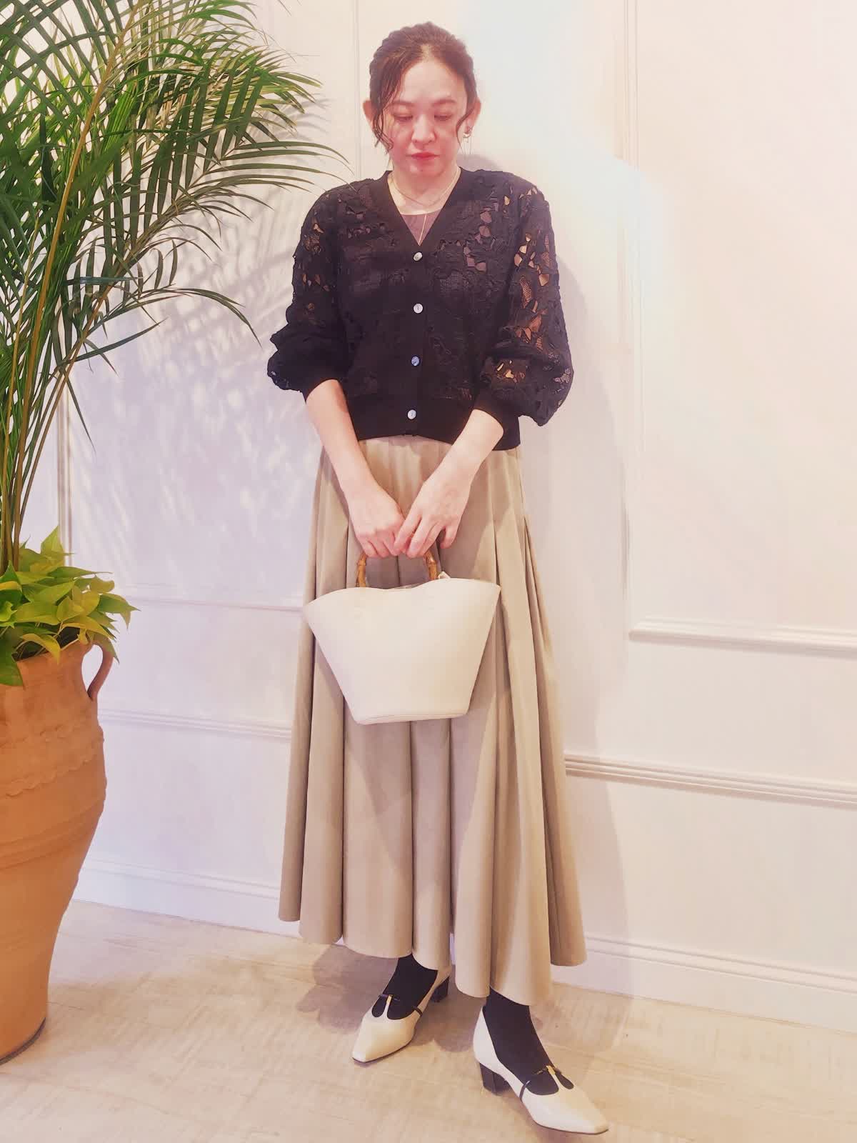 【着用サイズ】カーディガン : 9 ・スカート: 9 【着用カラー】カーディガン : ブラック スカート : ベージュ レースのシアー感が春らしいお出掛けコーディネート 大柄のフラワーモチーフを使ったレースは華やかさもありつつ大人な雰囲気。マキシ丈のスカートを合わせてより女性らしく落ち着いたスタイリングに。スカートはしっかり長さのあるマキシ丈。ヒップライン下から広がるタックスカートは腰回りをスッキリと見せスタイルアップも。