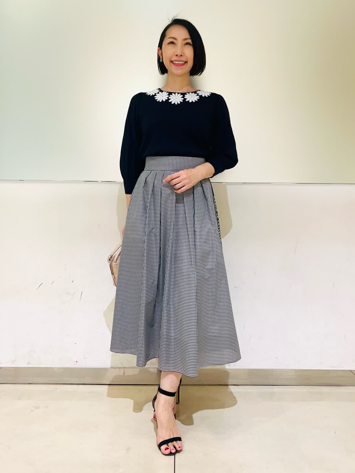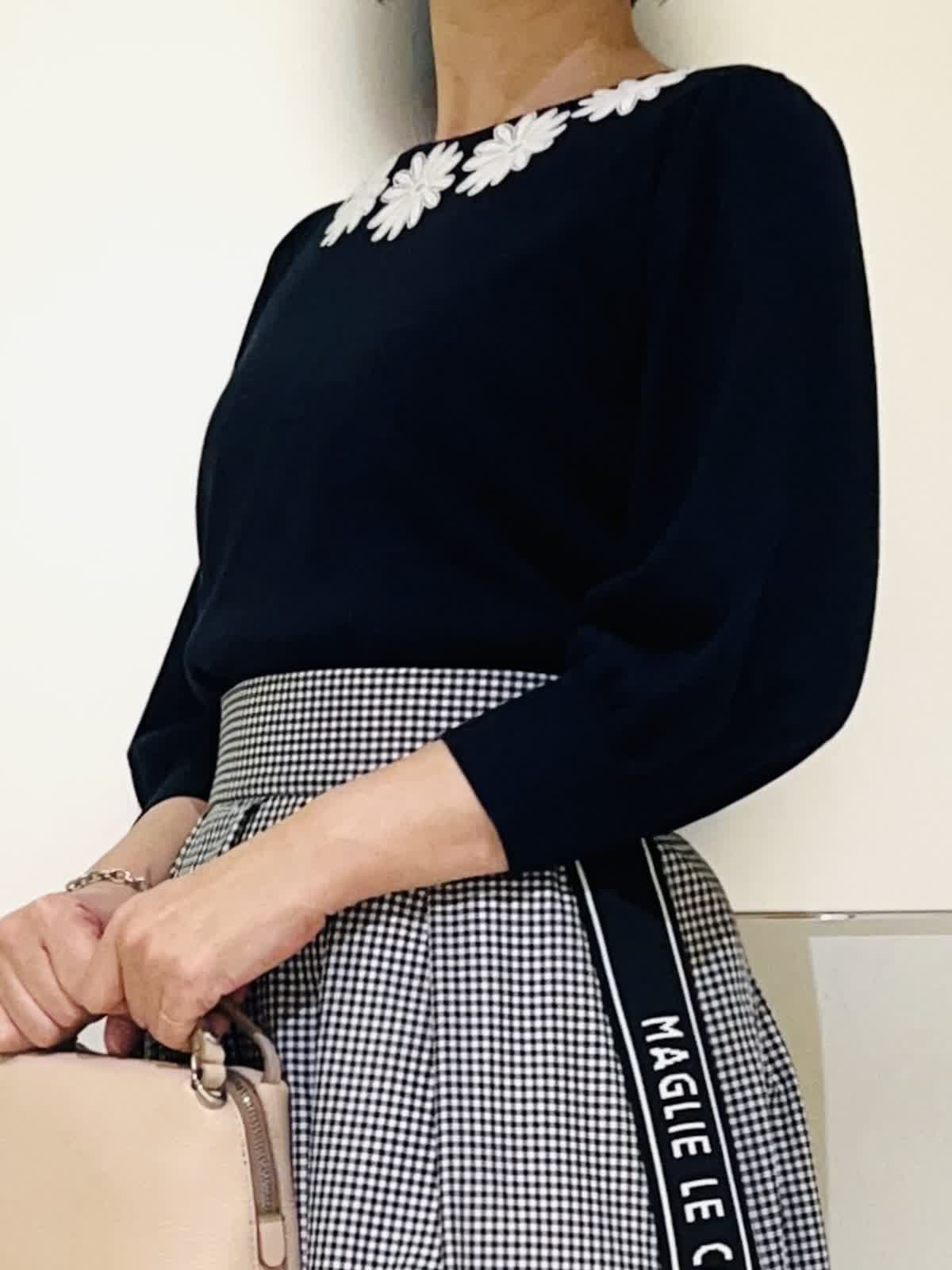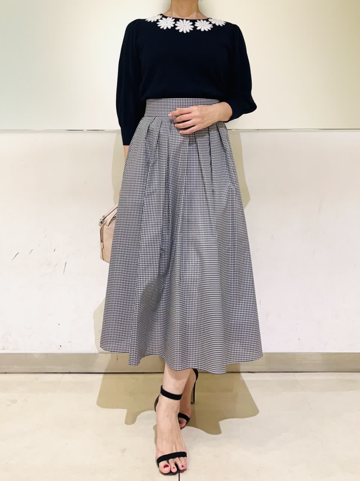 【着用アイテム】すべて9号 【着用カラー】ニット:ネイビー スカート:格子 春のお出かけコーディネート。顔まわりのお花のレースが華やかなニット。ネイビーに白のフラワーレースが映えて、顔うつりも明るくなります。首元も華奢見えする開き感じる。しっとりとした肌触りで着心地も良いです。ギンガムチェックのスカートはオリジナルのロゴテープがスポーティな雰囲気な1枚。フェミニンなデザインのニットと合わせて甘辛ミックススタイリングの完成です。