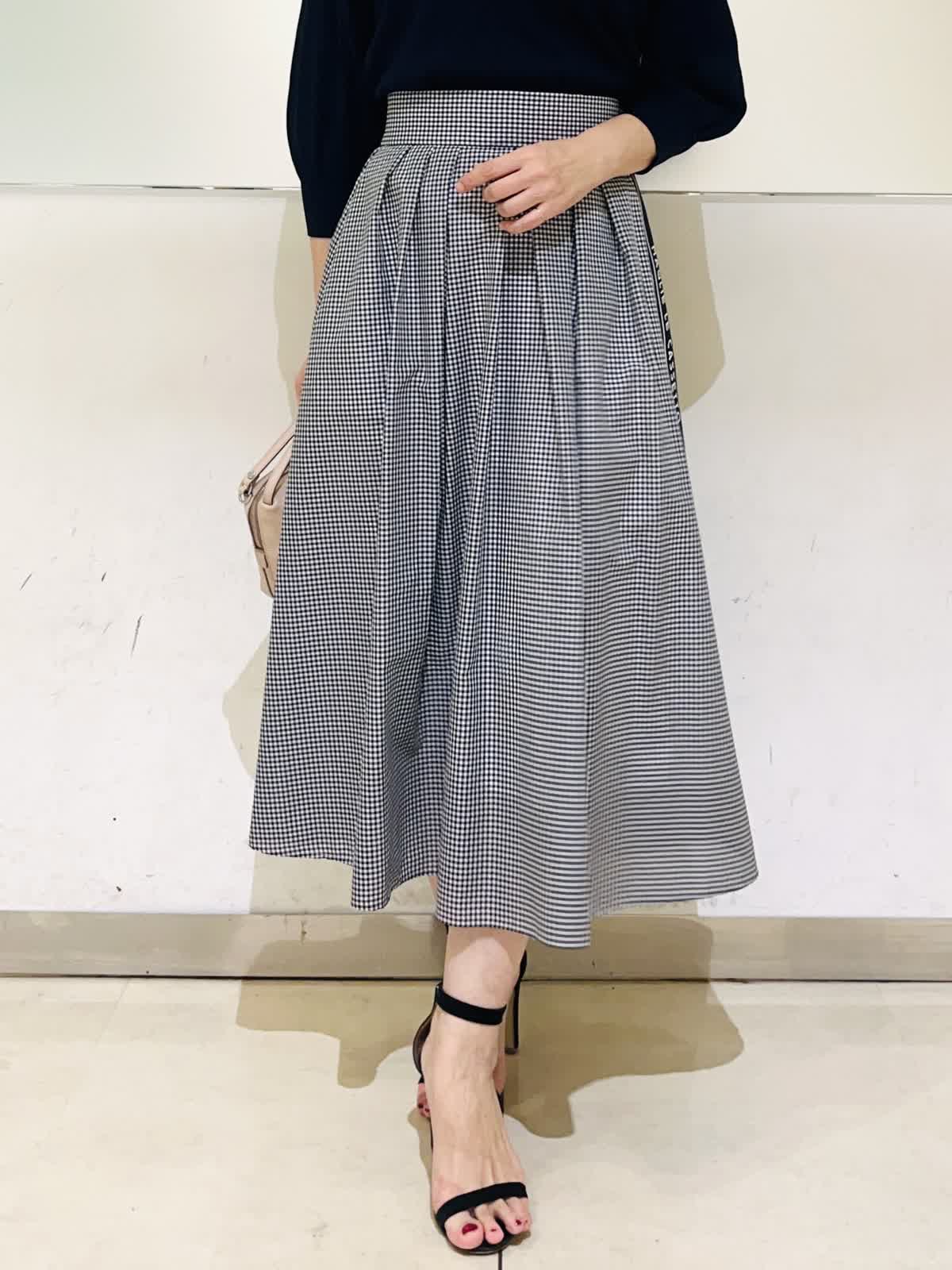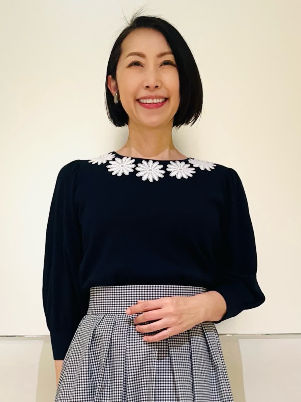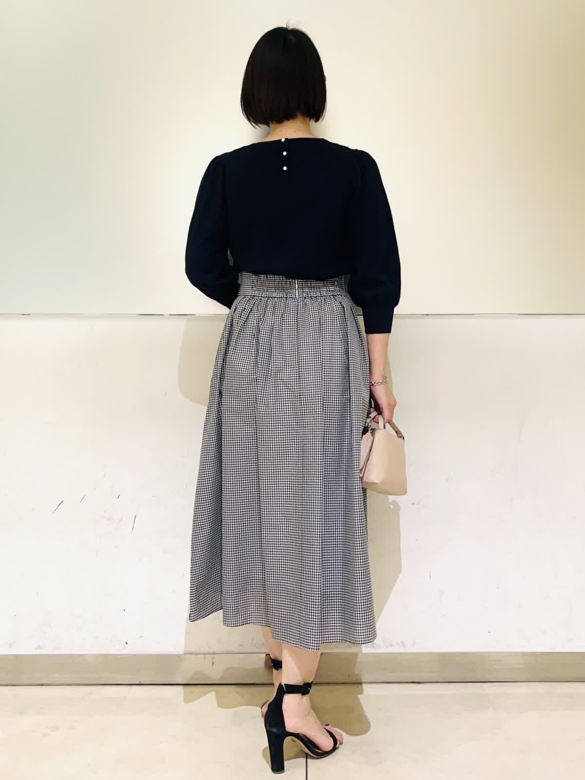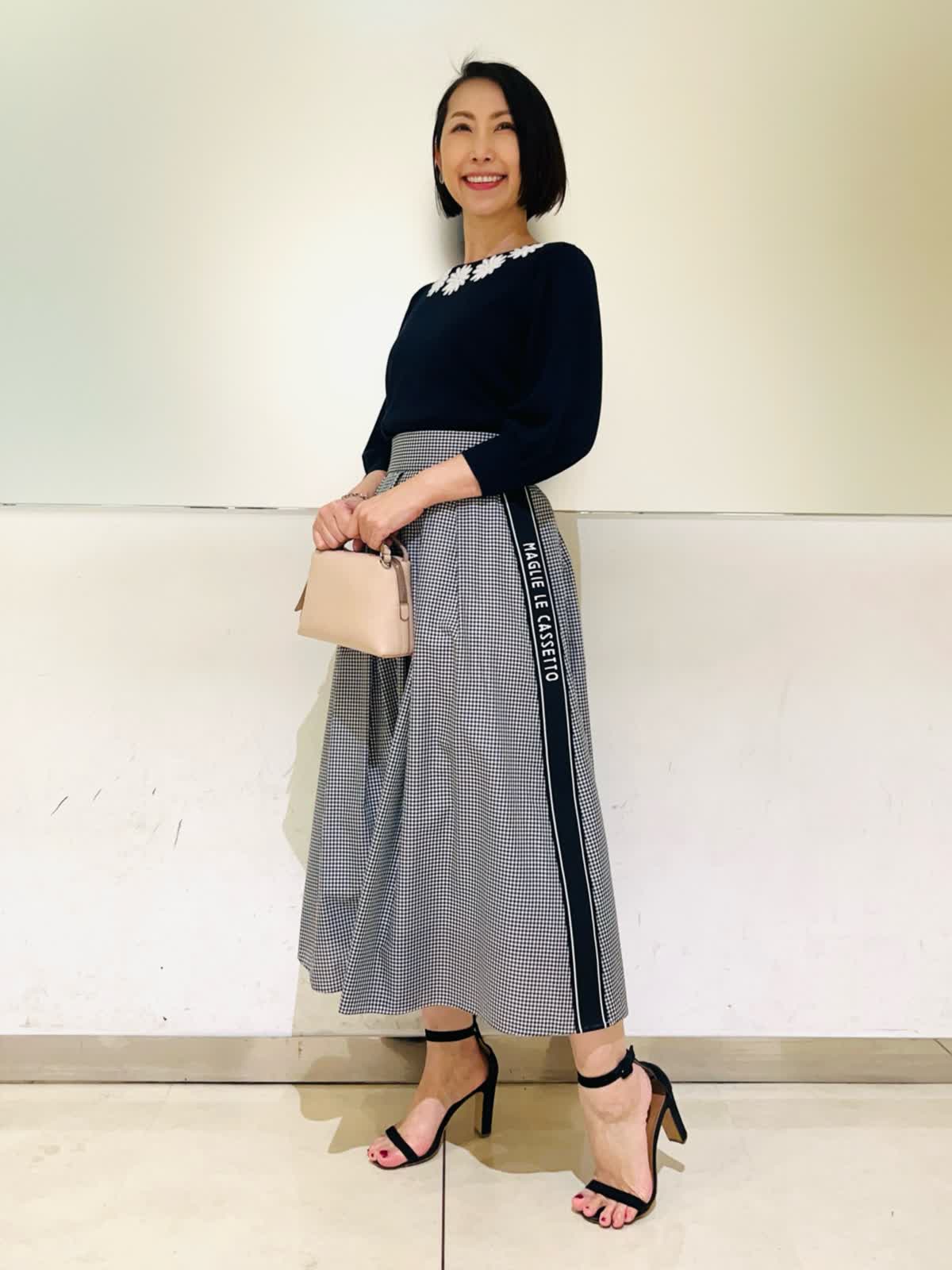 【着用アイテム】すべて9号 【着用カラー】ニット:ネイビー スカート:格子 春のお出かけコーディネート。顔まわりのお花のレースが華やかなニット。ネイビーに白のフラワーレースが映えて、顔うつりも明るくなります。首元も華奢見えする開き感じる。しっとりとした肌触りで着心地も良いです。ギンガムチェックのスカートはオリジナルのロゴテープがスポーティな雰囲気な1枚。フェミニンなデザインのニットと合わせて甘辛ミックススタイリングの完成です。