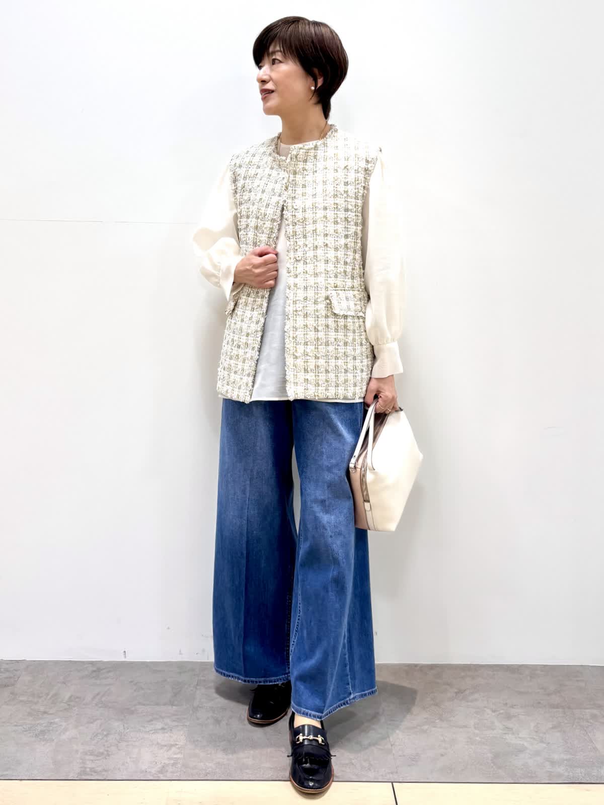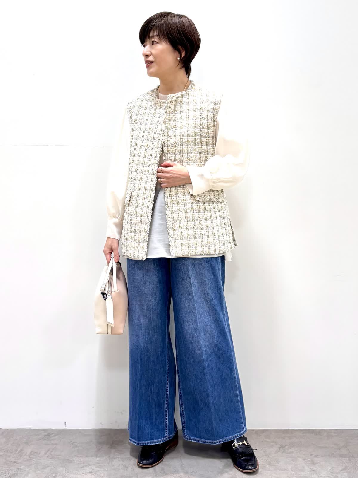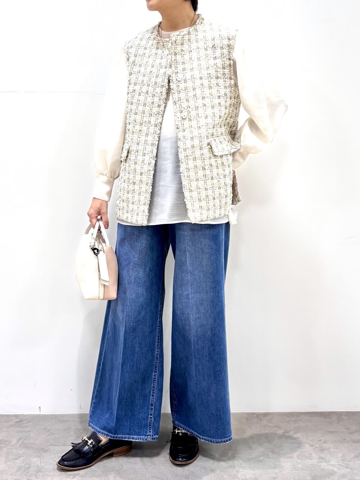 [着用サイズ]ブラウス:9号 ジレ:9号 パンツ:9号 [着用カラー]ブラウス:アイボリー ジレ:ベージュ パンツ:インディゴ 華やかなツイードのジレはきちんとした場所でも、カジュアルに着崩しても着れる優れものです。 中の光沢感の綺麗なブラウスはリボンも外せる2way仕様です。 ヘルシーのバギーデニムは柔らかい履き心地で脚のラインを拾わず、スッキリ履いていただけます。