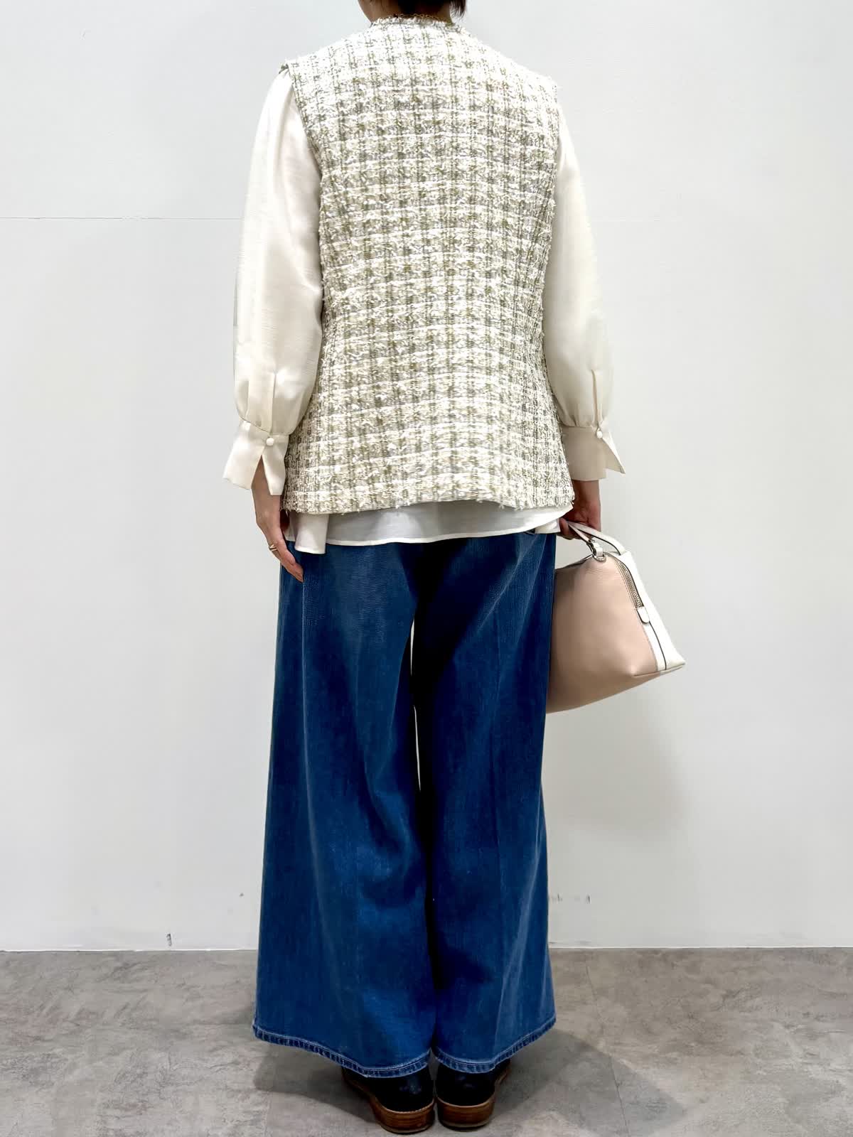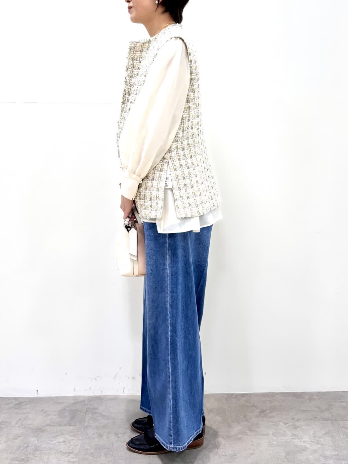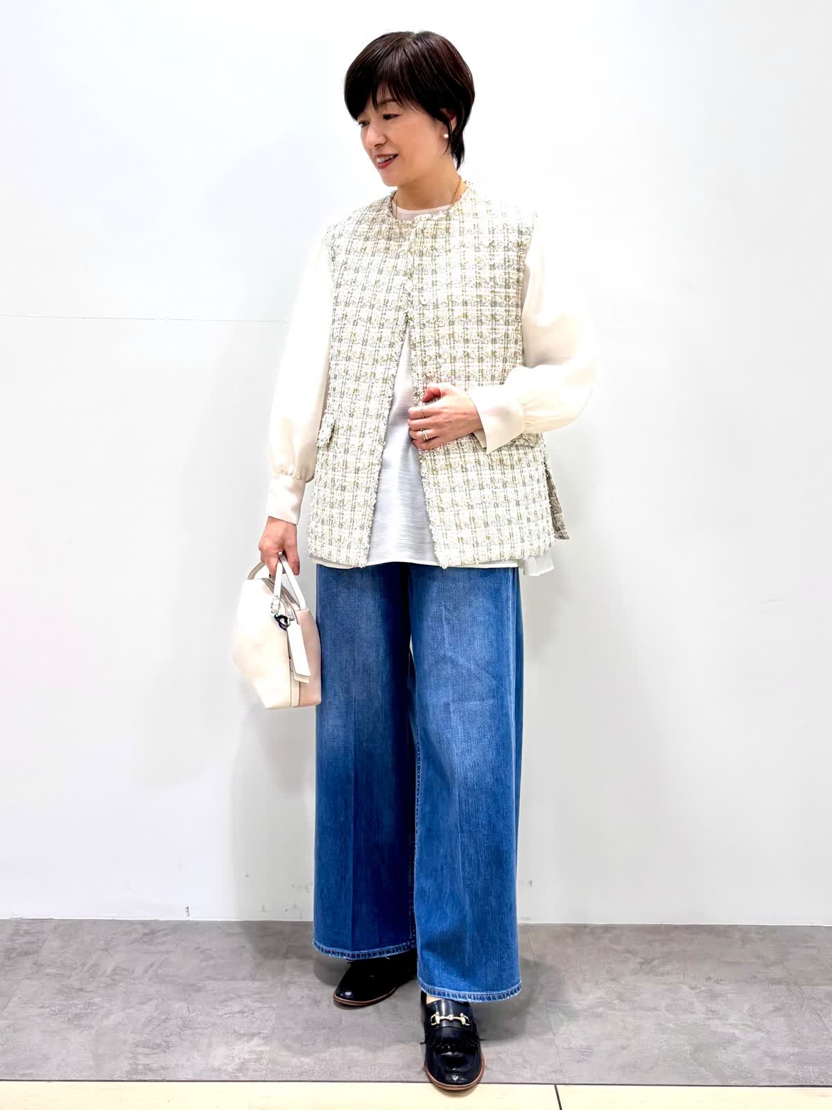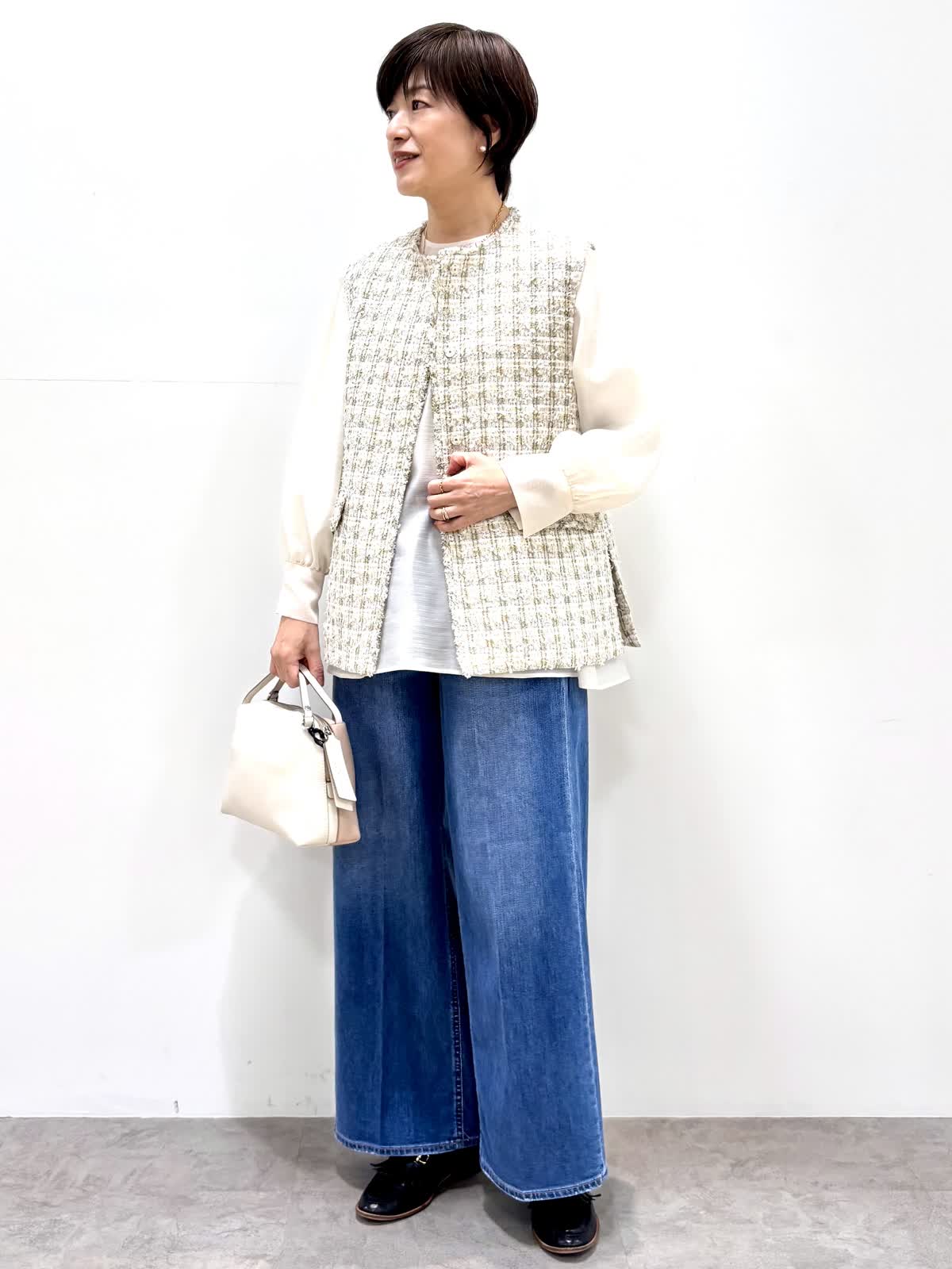 [着用サイズ]ブラウス:9号 ジレ:9号 パンツ:9号 [着用カラー]ブラウス:アイボリー ジレ:ベージュ パンツ:インディゴ 華やかなツイードのジレはきちんとした場所でも、カジュアルに着崩しても着れる優れものです。 中の光沢感の綺麗なブラウスはリボンも外せる2way仕様です。 ヘルシーのバギーデニムは柔らかい履き心地で脚のラインを拾わず、スッキリ履いていただけます。