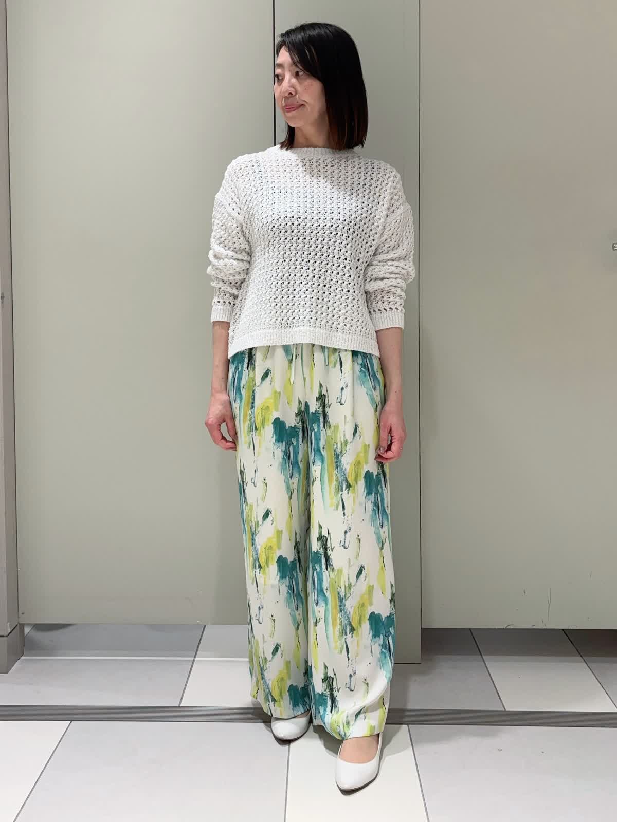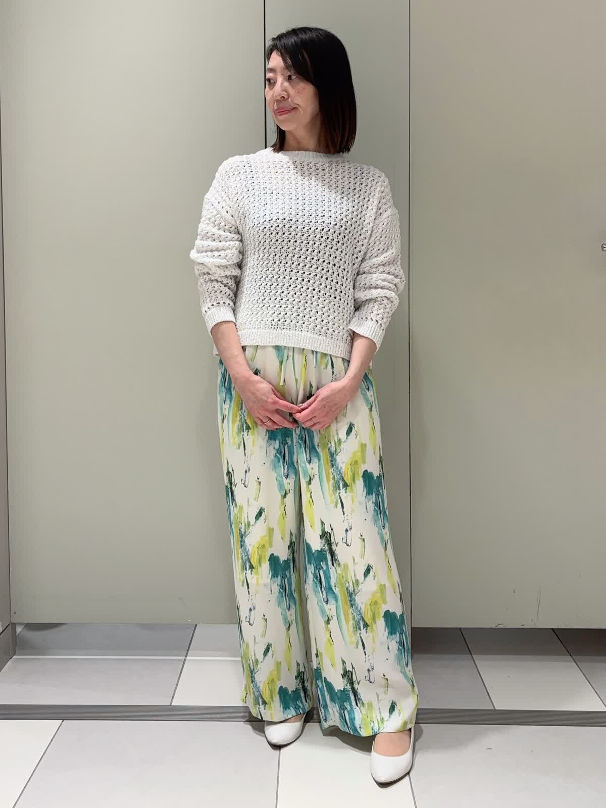 【着用サイズ】ニット:9号 パンツ:7号 【着用カラー】ニット:オフホワイト パンツ:ペパーミント 白地に緑や黄の春らしい色目のプリントパンツ。程よいゆとりと落ち感のある素材でワイドパンツが苦手な方でも取り入れやすい。 1枚持っているだけでオシャレで明るい気分になるおすすめのアイテムです。