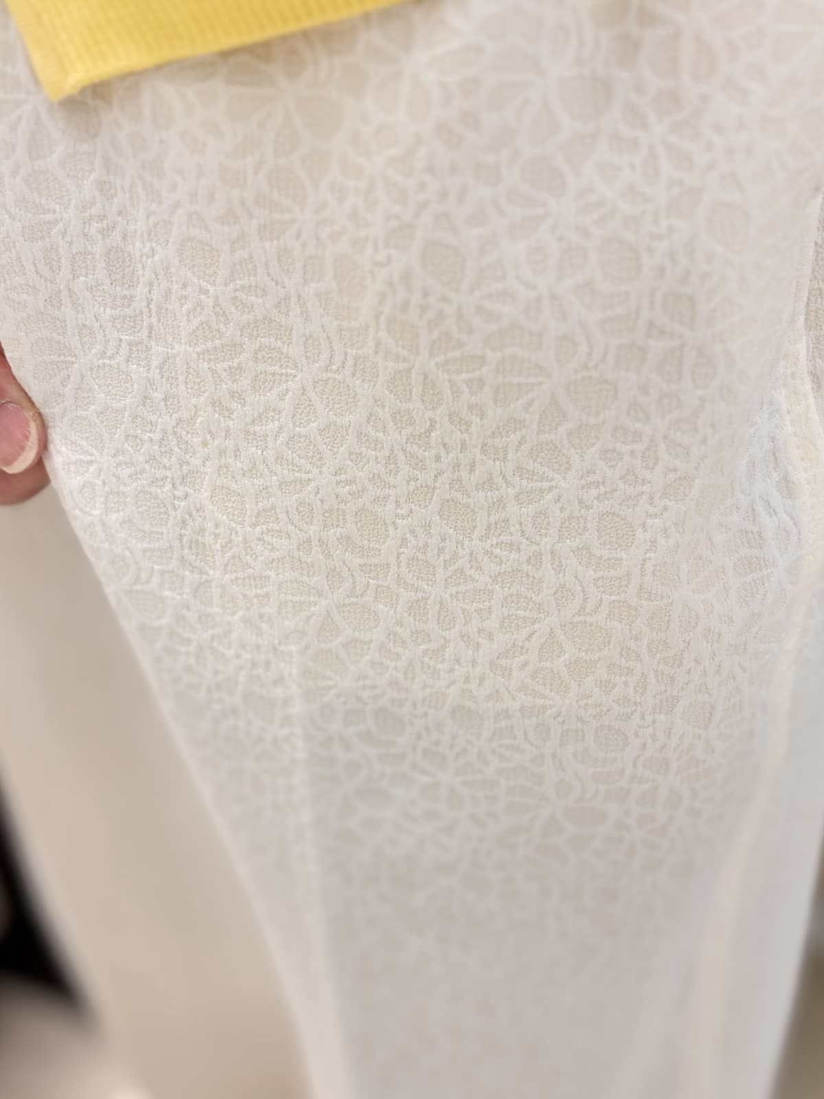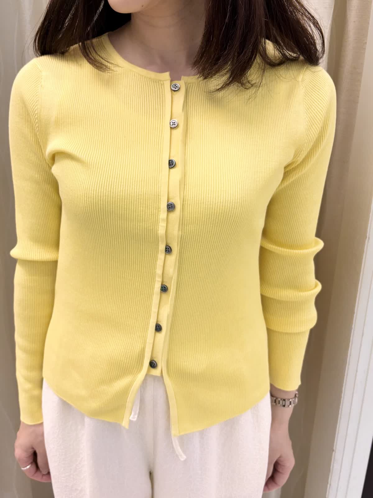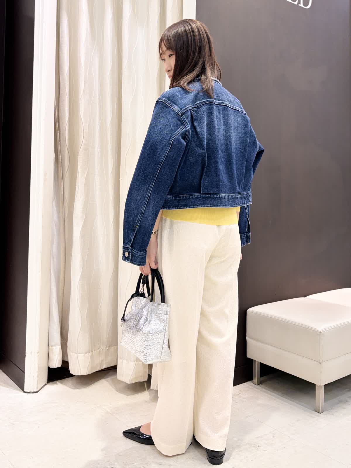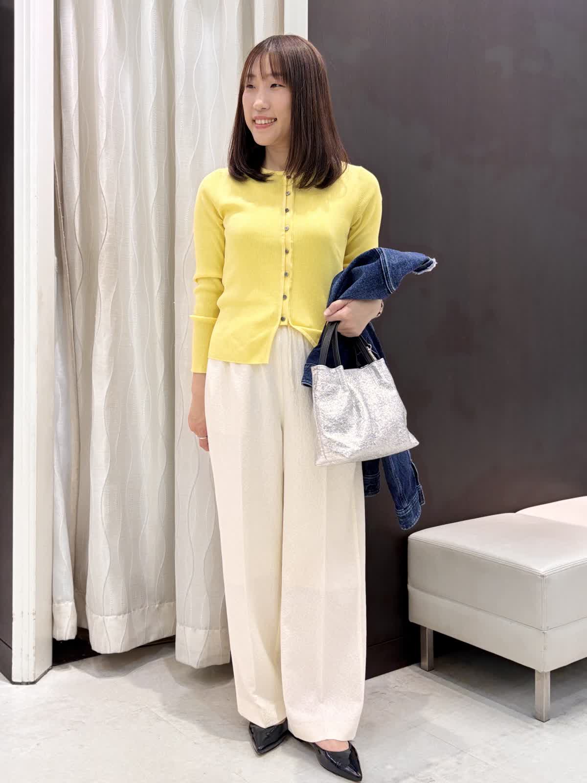 【着用カラー】デニムジャケット:インディゴ ニット:イエロー パンツ:アイボリー バッグ:シルバー