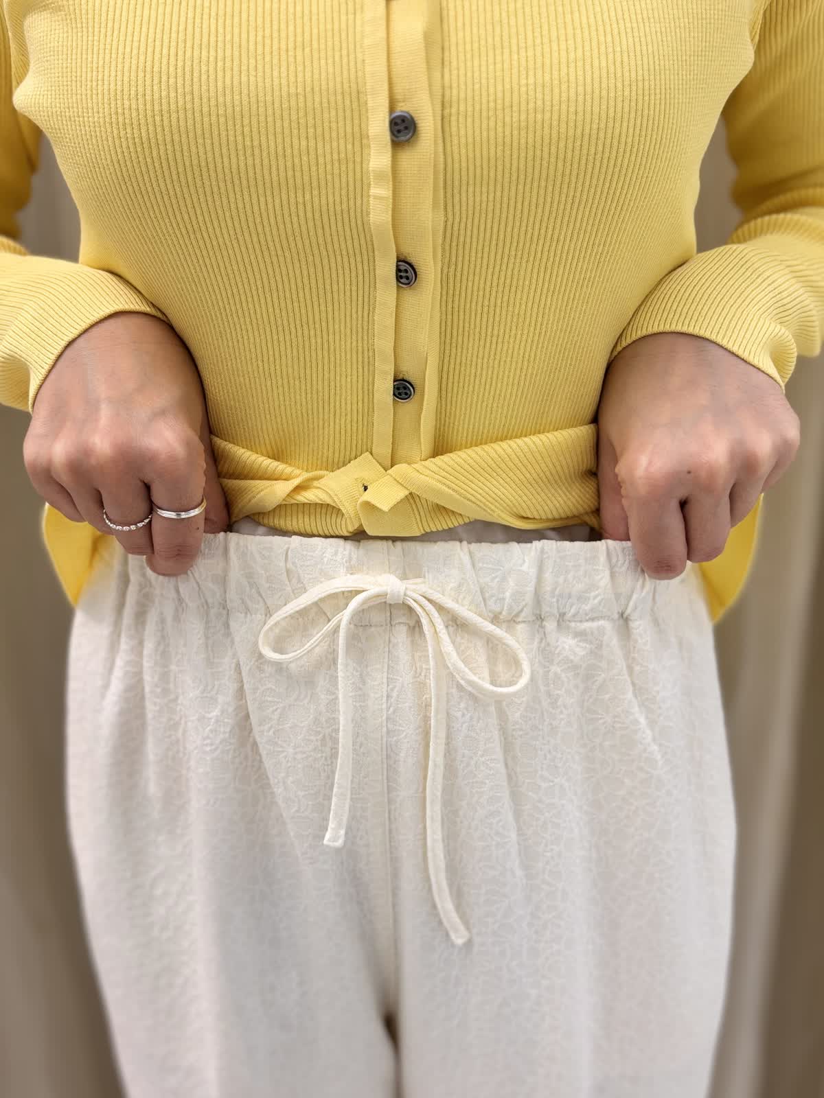 アウターはGジャンでカジュアルだけど、キレイめなアイテムを取り入れてバランス良くコーデしました。ニットカーディガンは2wayなので1枚着として着れますよ。リブの馴染みがよく柔らかく身体のラインがスッキリ見えます。程よく薄手なので長い季節対応できそう。パンツはジャガード素材。ウエストゴムでストレートシルエットが楽ちんにはけます。裏地がしっかりしており透け感はあまり気にならなかったです。