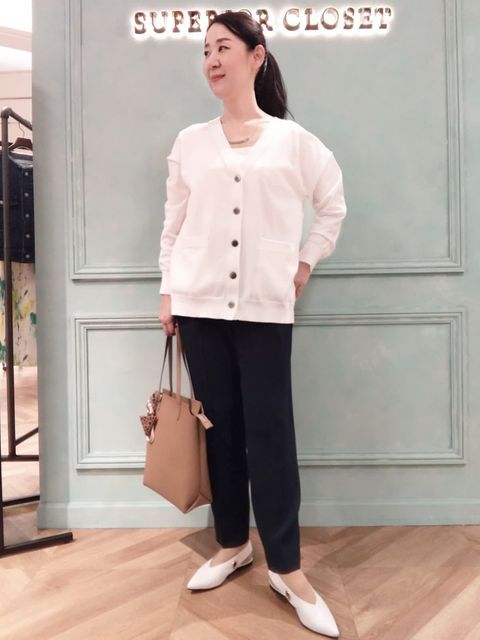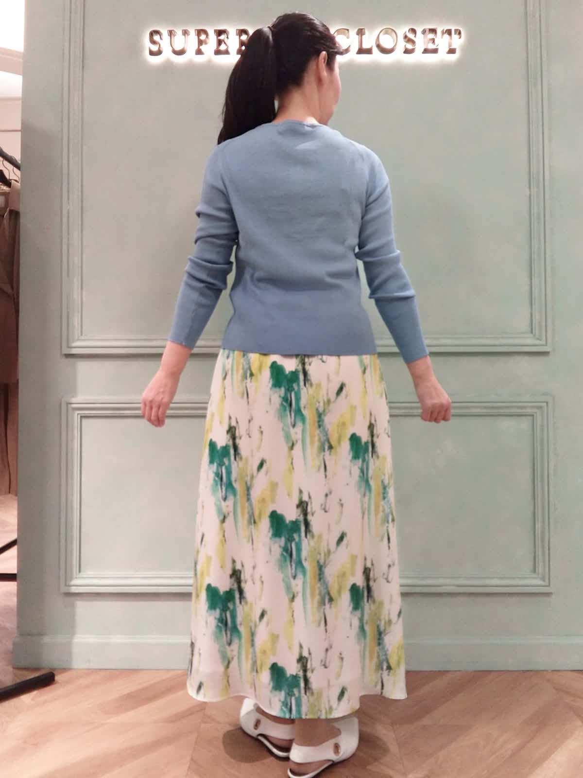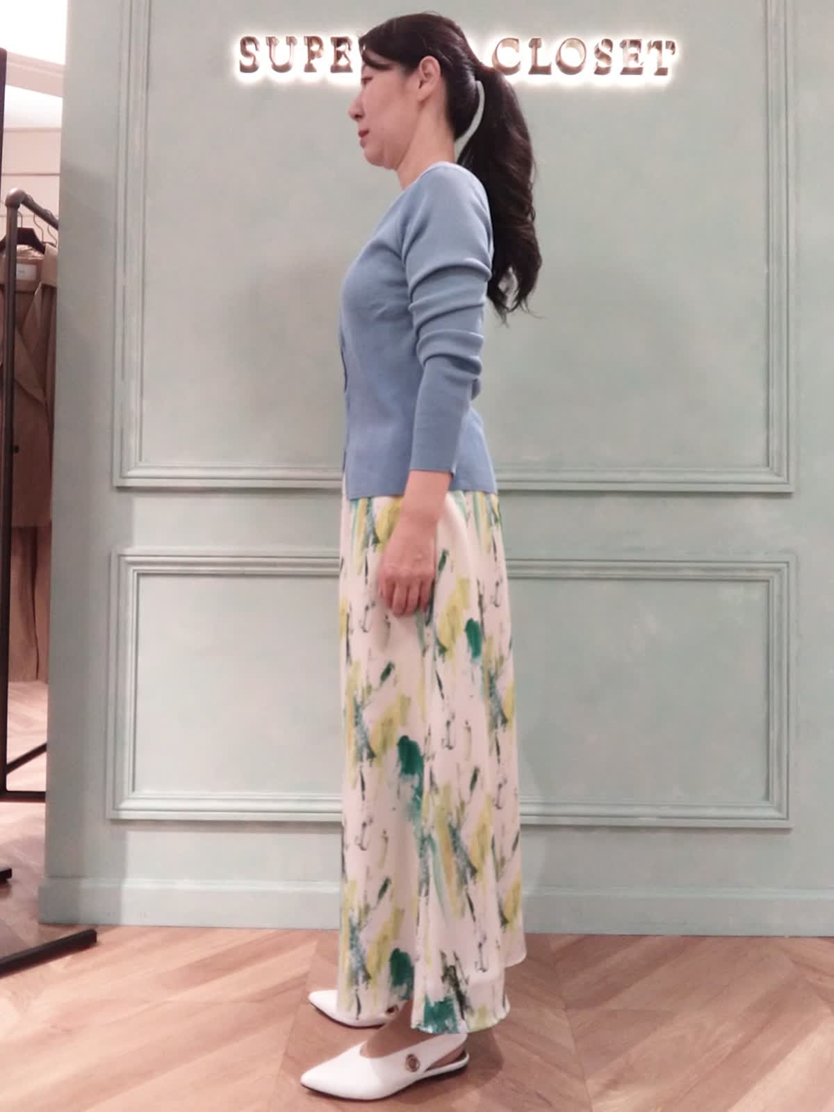 【着用サイズ】カーディガン:9号、スカート:9号 【着用カラー】カーディガン:ブルー、スカート:ペパーミント おでかけスタイル。おでかけは少し華やかにブルーカーディガンとプリントスカートでコーディネート。カーディガンは綿シルク素材が肌ざわりがよく、程よくフイットします。ボタンを留めて1枚着として着用。スカートは揺れ感のあるセミフレア。ウエストはオールゴムでラクな履き心地。ドロストの紐で絞って調節できます。